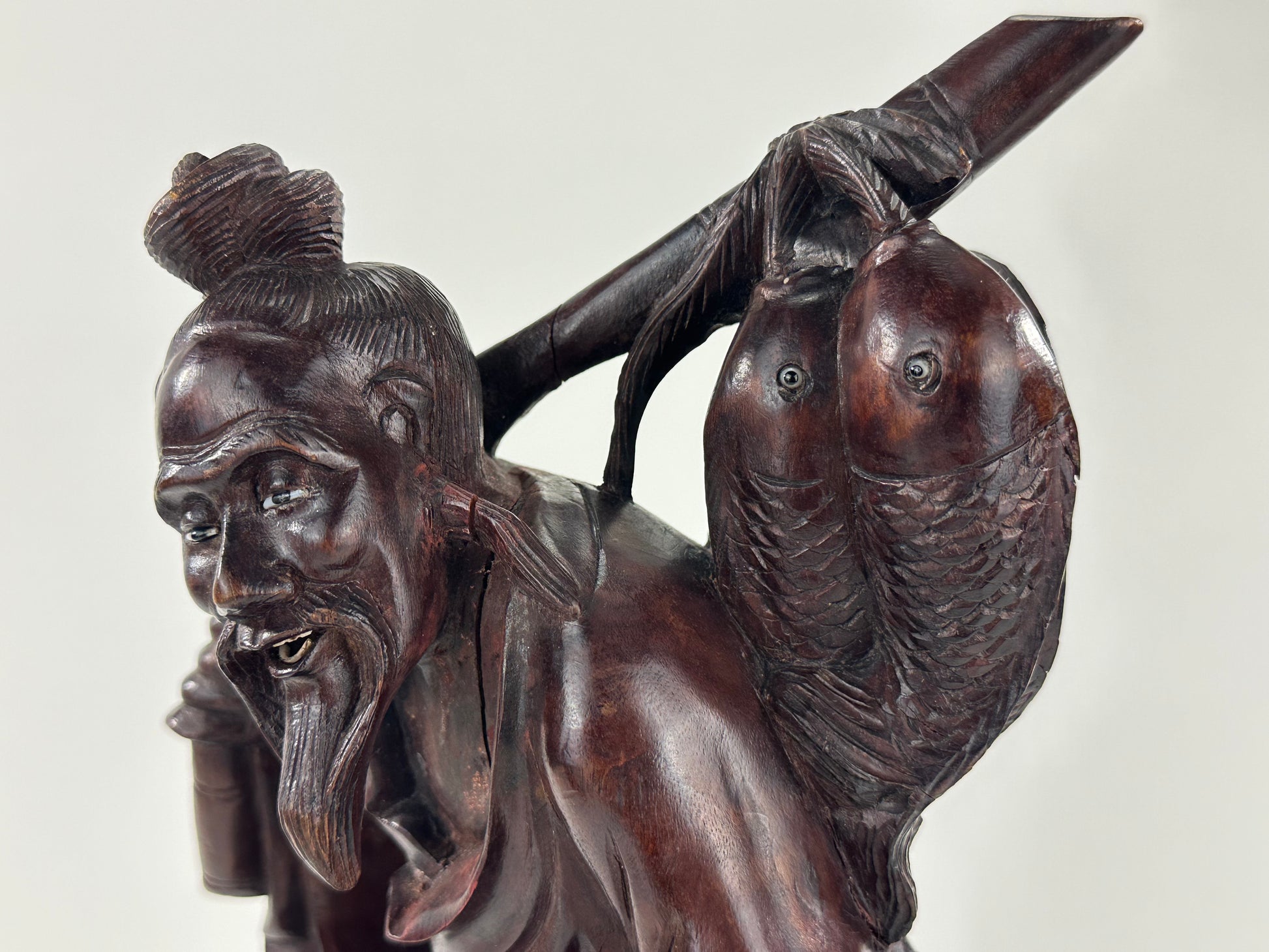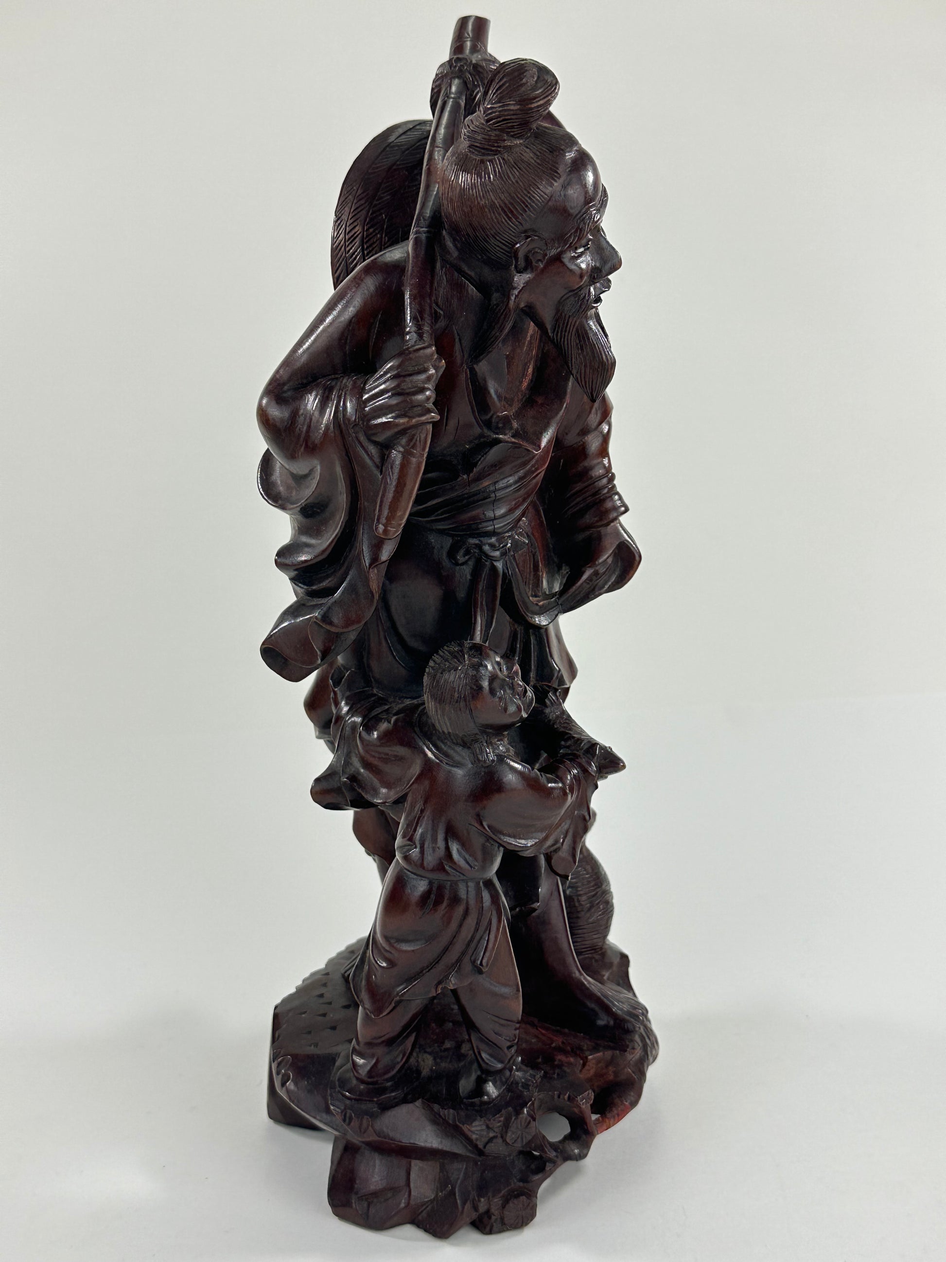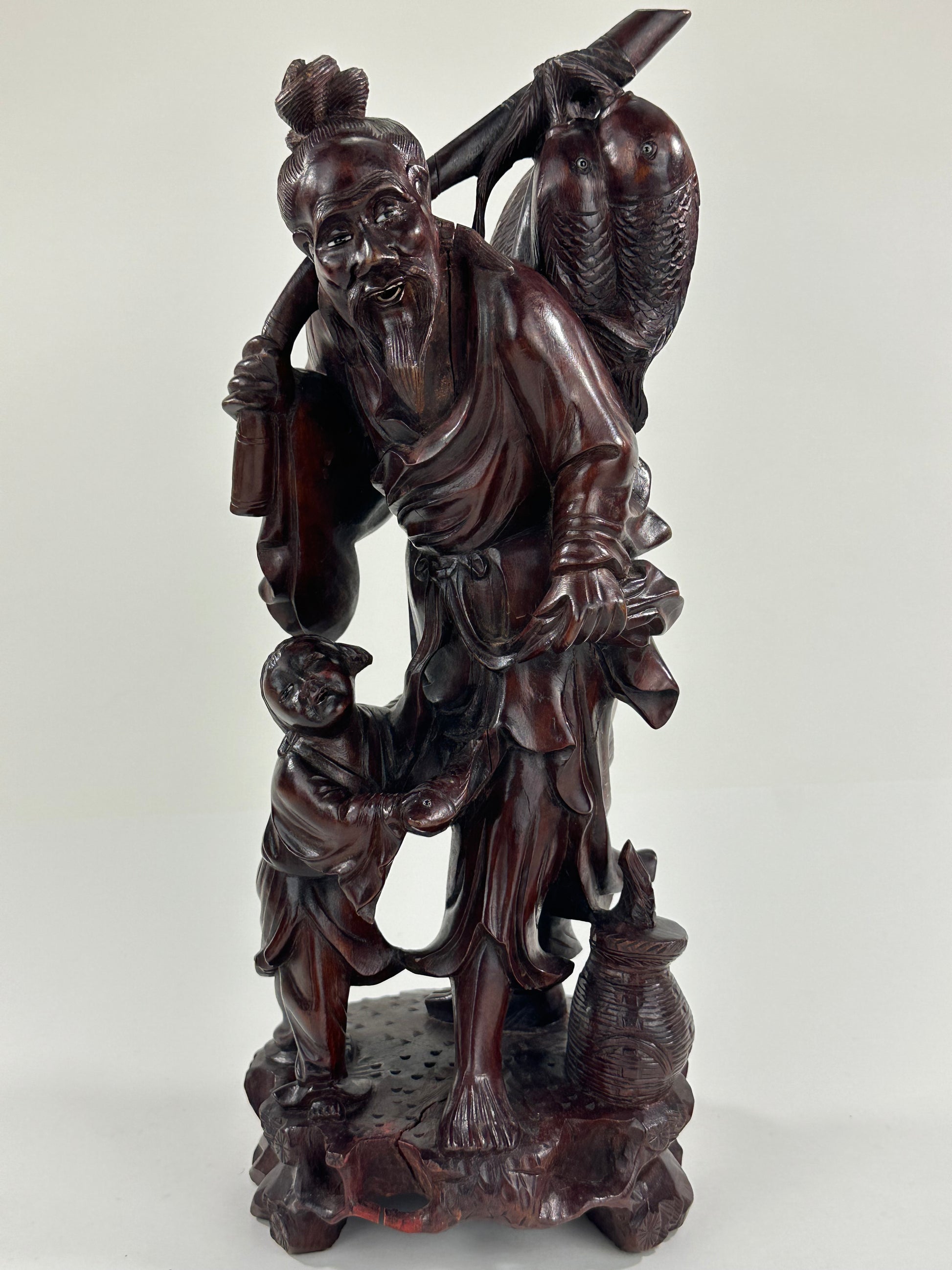 Shoulao holding fish and standing with a child symbolizes a long abundant life. Intricately carved with supreme detail.