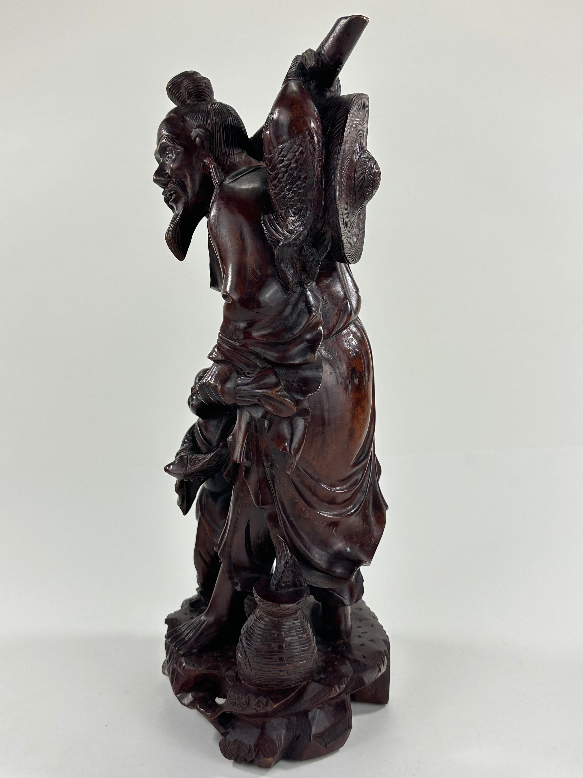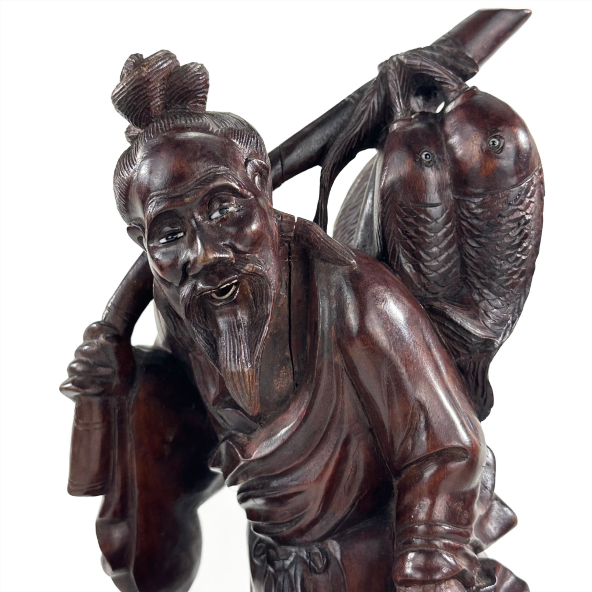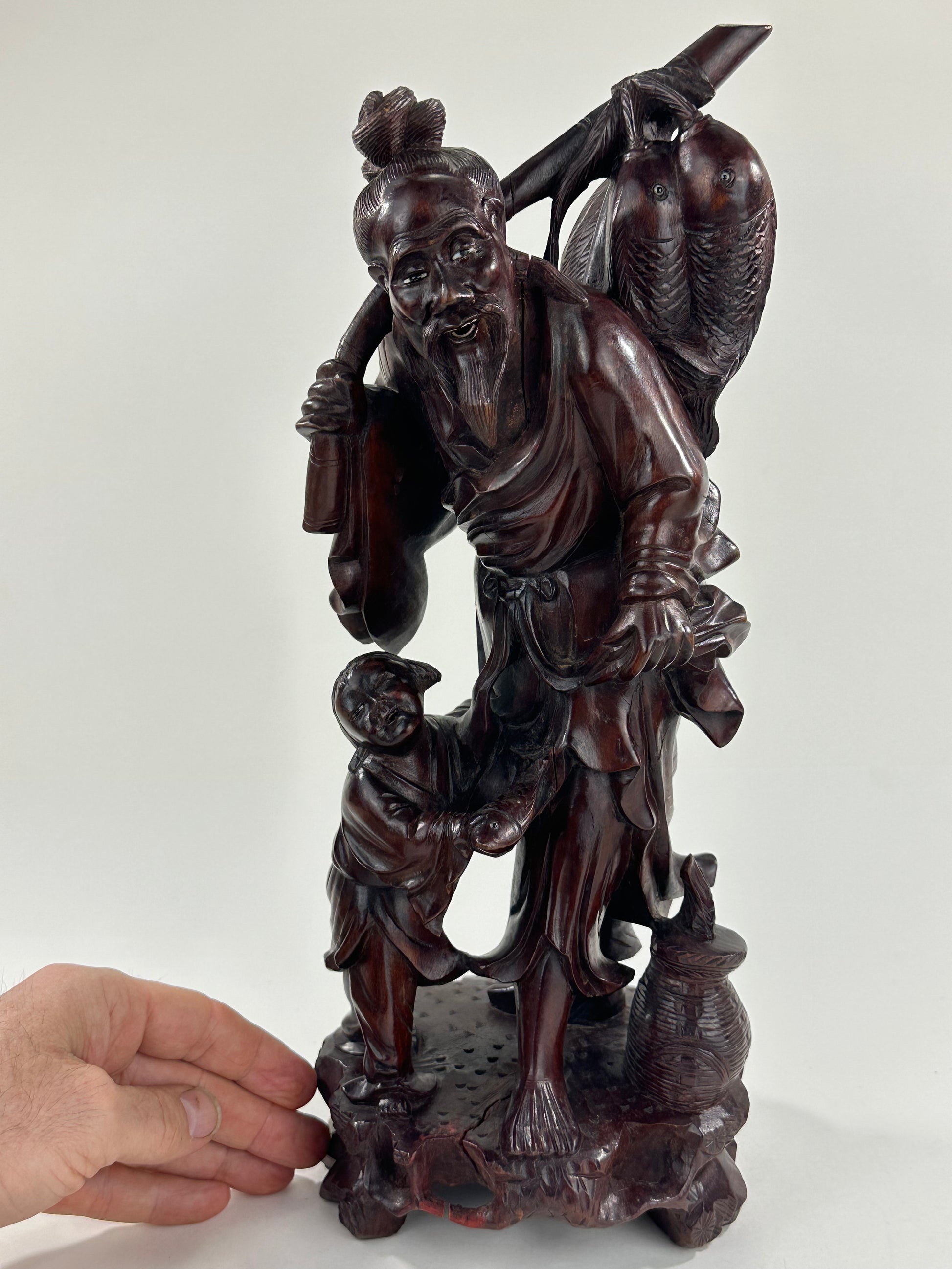Shoulao holding fish and standing with a child symbolizes a long abundant life. Intricately carved with supreme detail.