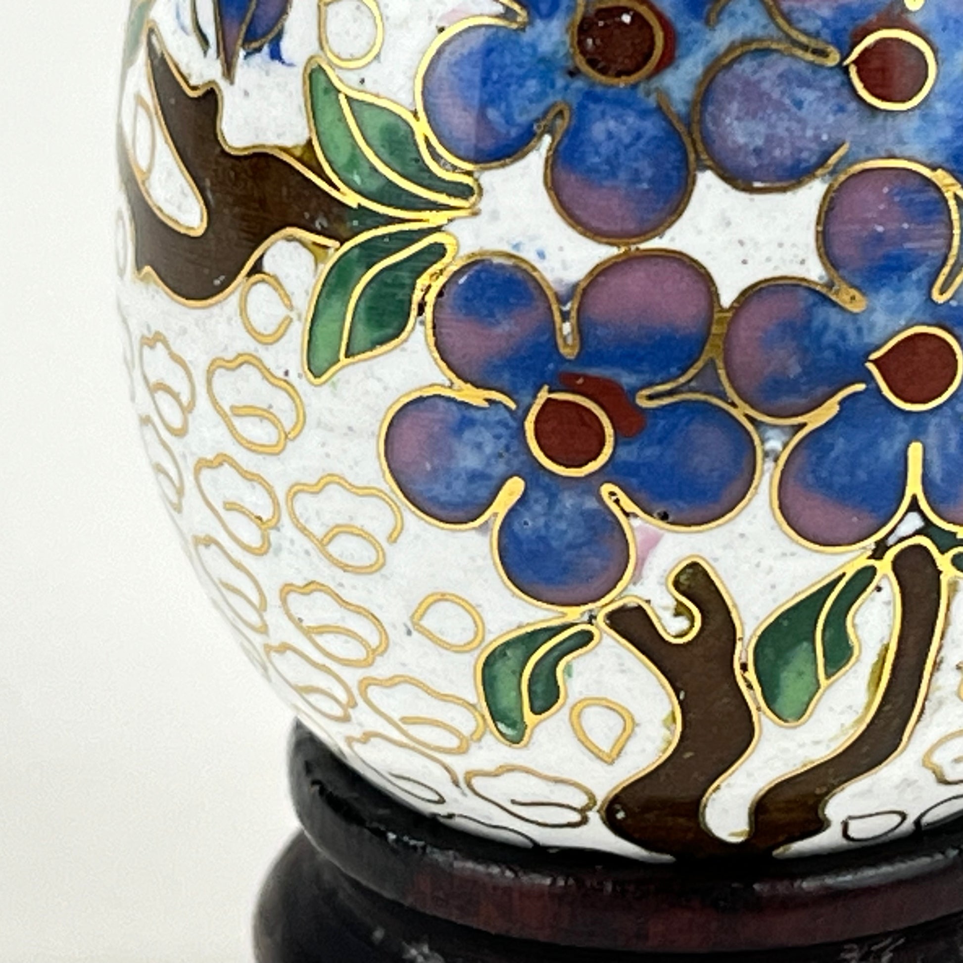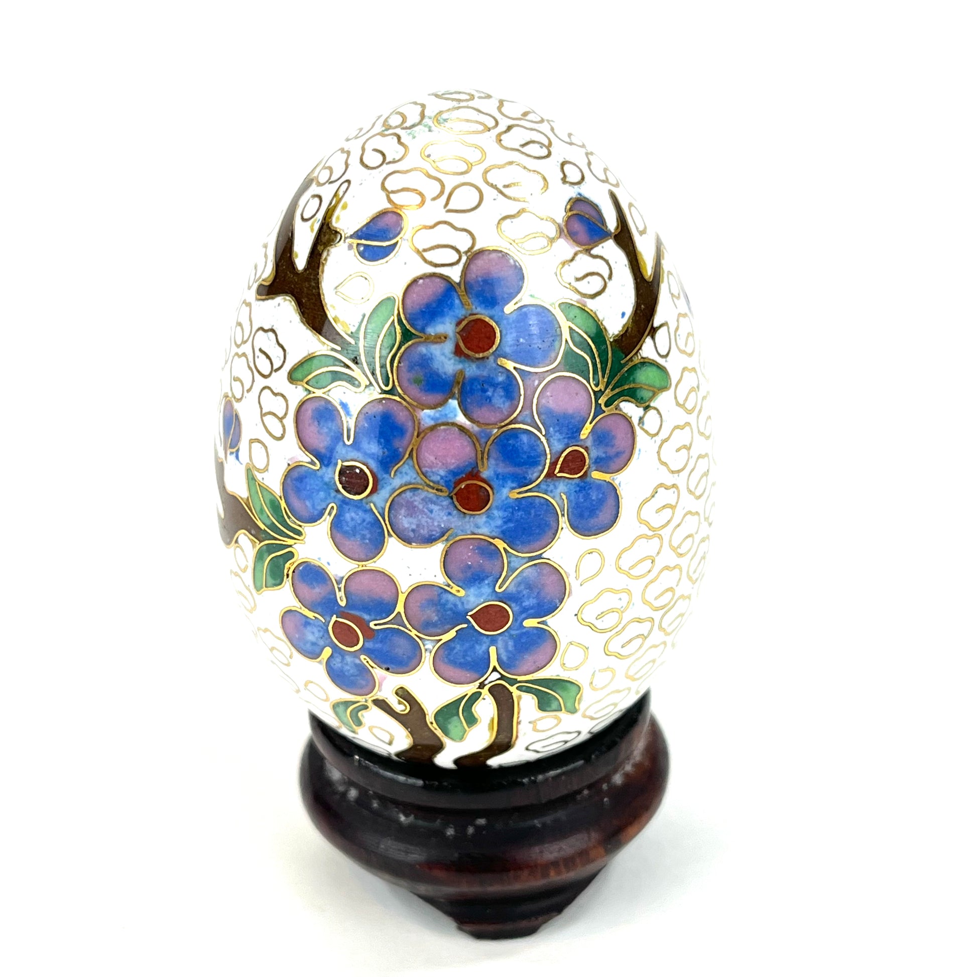 This is an Antique Chinese Cloisonne Egg. About the size of a hen egg it features blue and purple plum blossoms on branches among white clouds of fading winter.