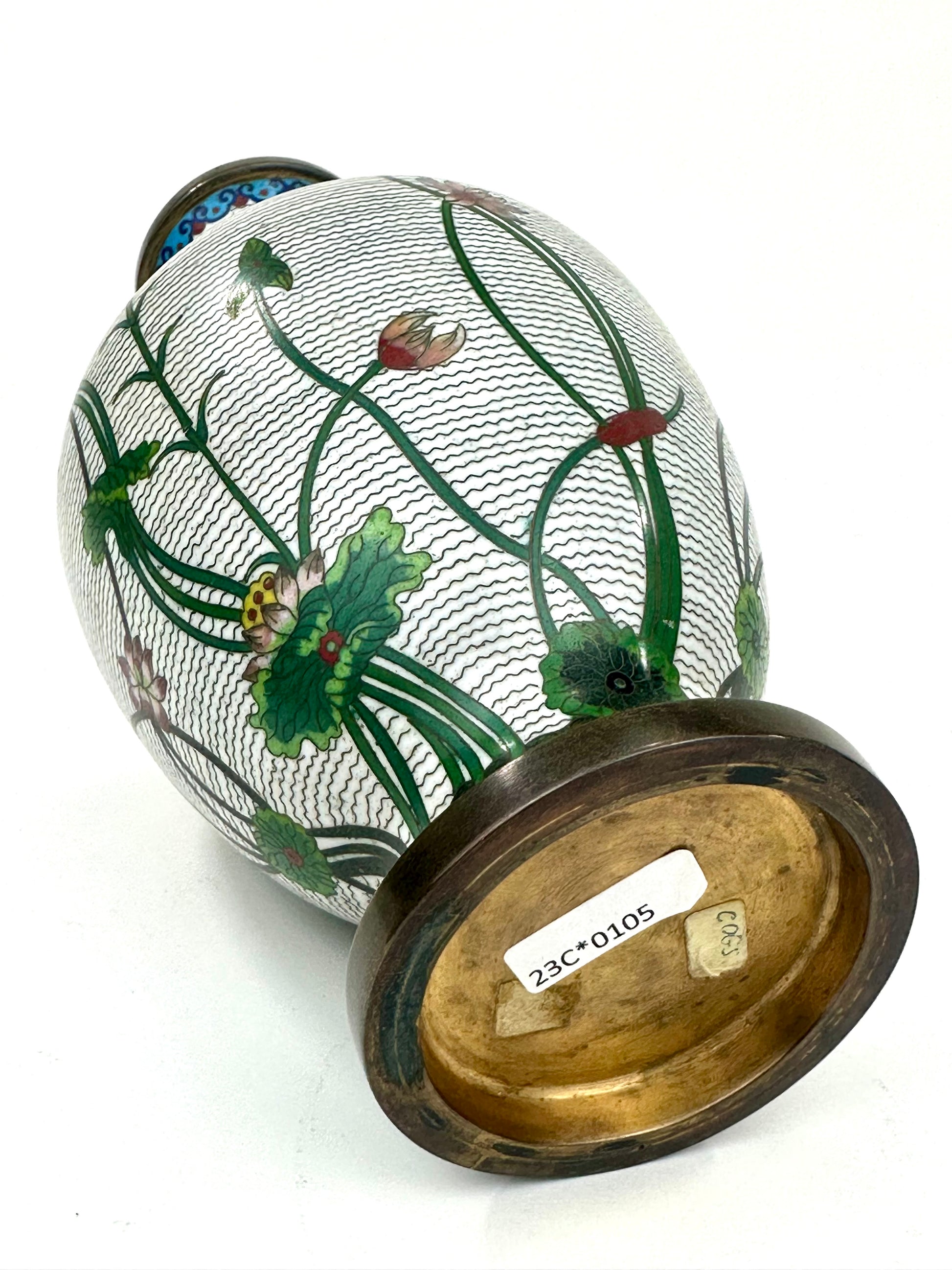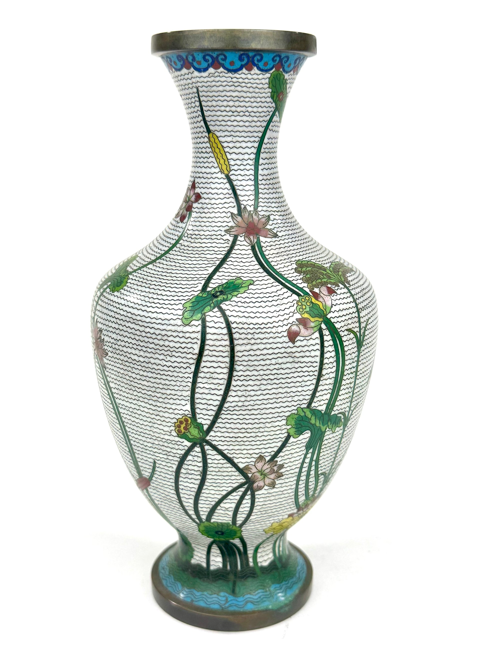 This is a beautiful antique Chinese Qing Dynasty c1900 cloisonné vase. The hand crafted designs are of detailed blooming lotus flowers in water motif on an unusual white background.