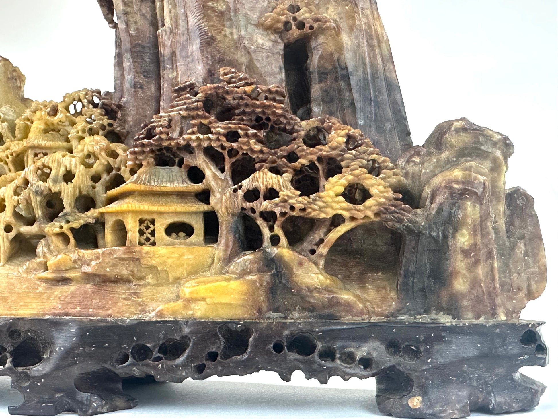 This is a natural soap stone sculpture of the tower like mountains of Chinese with a village scene.