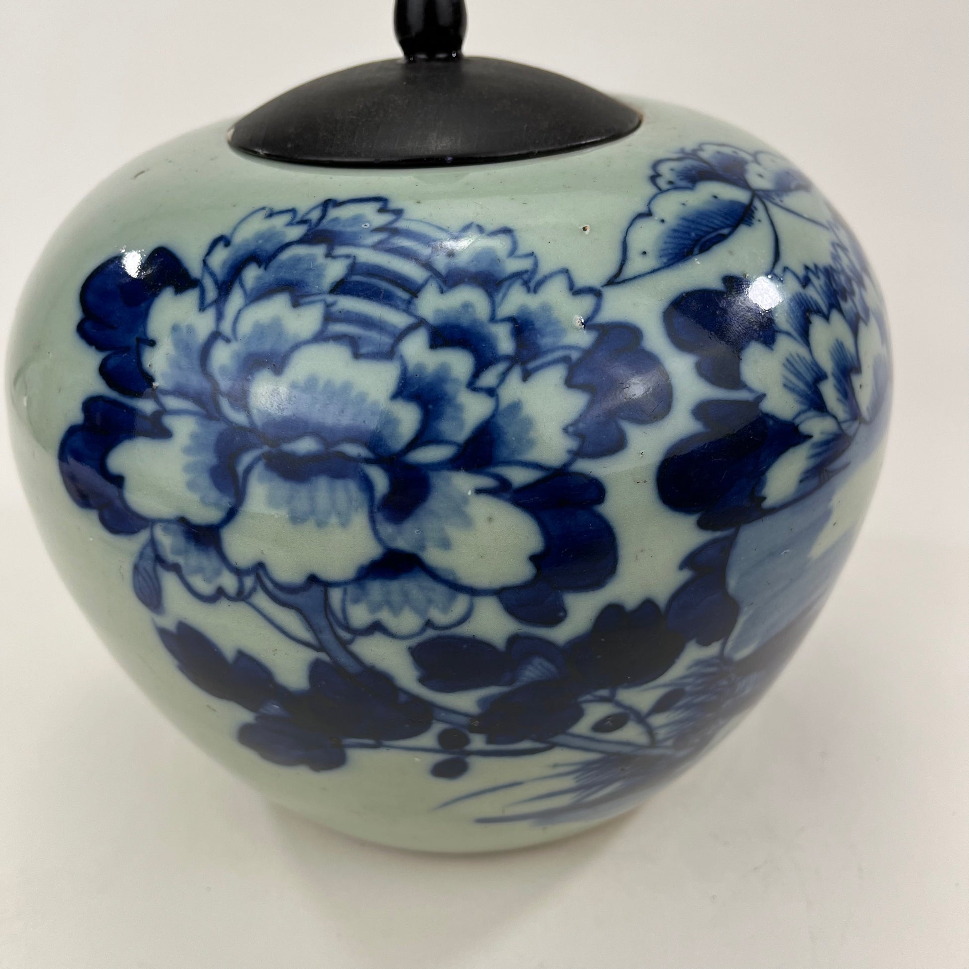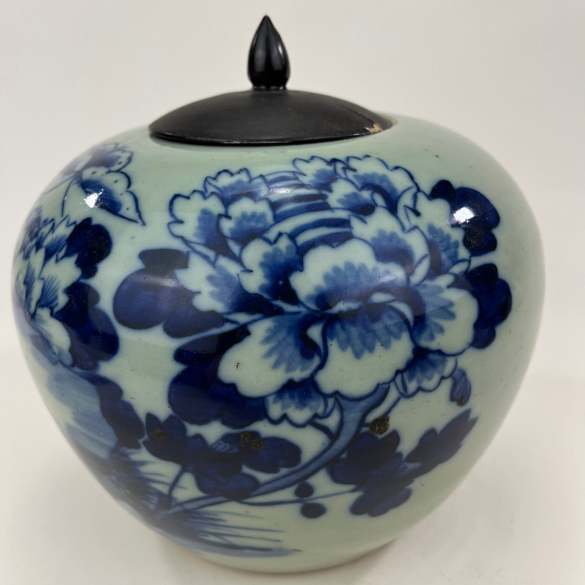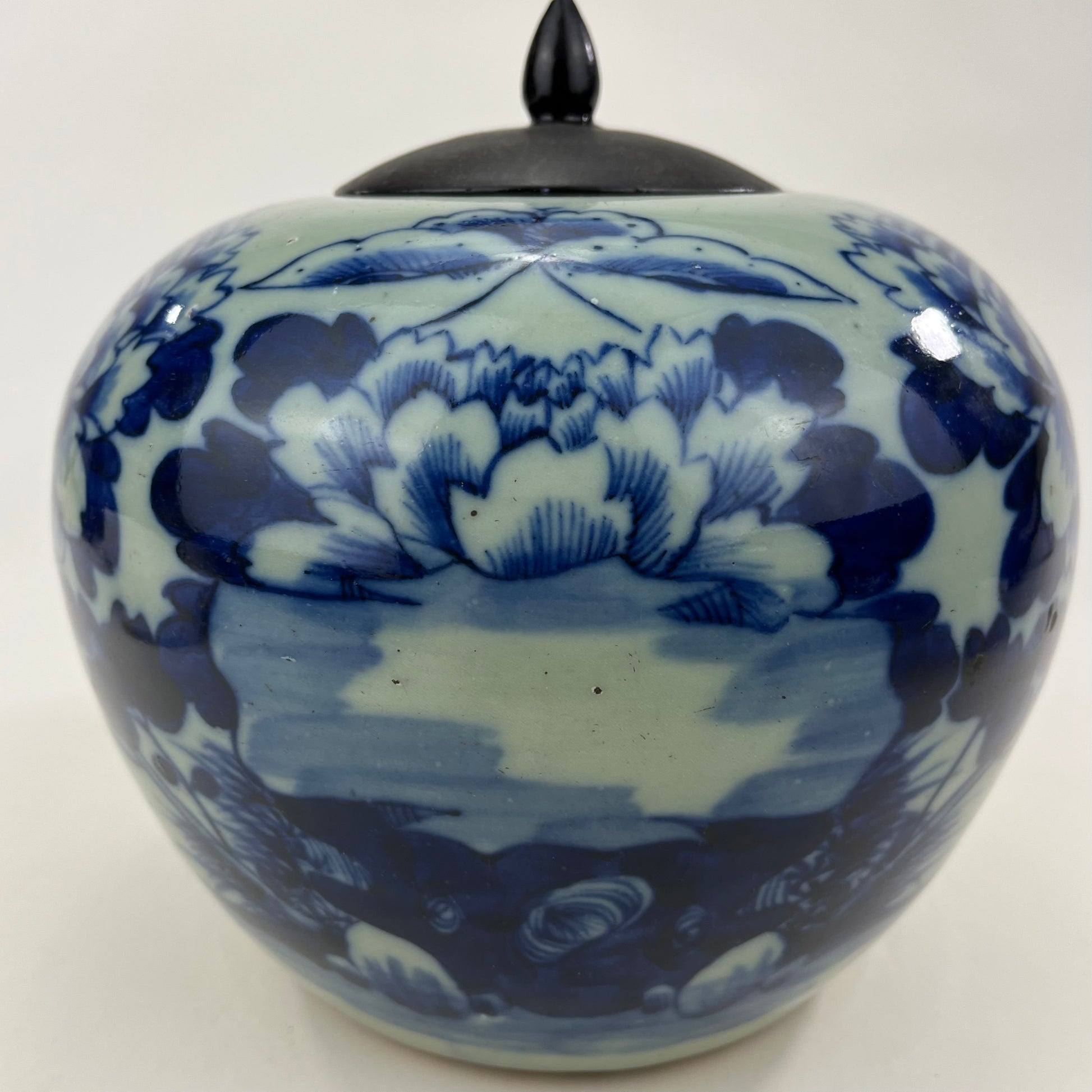 This is a 19th century antique Chinese jar from the Qing Dynasty, mid to late 19th century. Recently acquired by from a local collector who lived and traveled all over Asia in the 1960's picking up treasures along the way. It is hand thrown and all hand painted in the classic cobalt underglaze. Decorated in a peony flower motif. The repeating ancient Chinese meander or "Greek fret" encircles the top of the jar and edge of the lid. The foot and mouth are unglazed. Having been carefully displayed at an estate for the past 50 years this jar remains in fine condition. No hairlines are detected. Some wear is visible around the mouth and discoloration from early decades of use. There are normal kiln flaws to be expected with these containers like dark spots from kiln ash, smudged paint and pinhole reserves in the glaze.