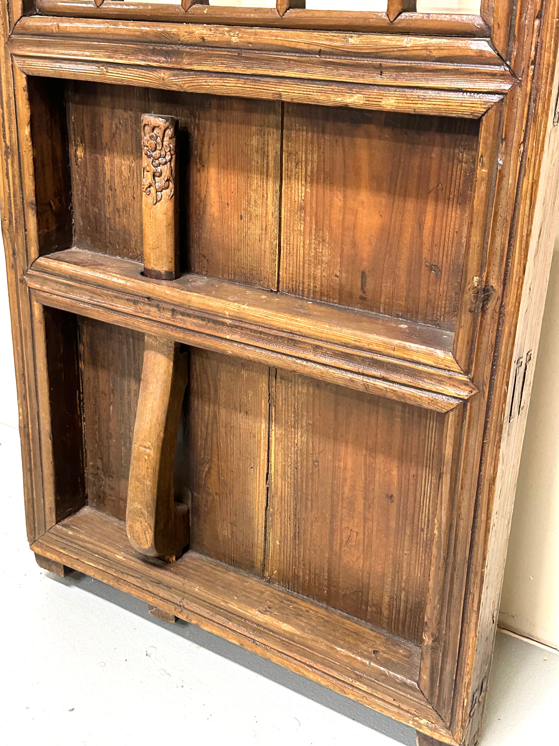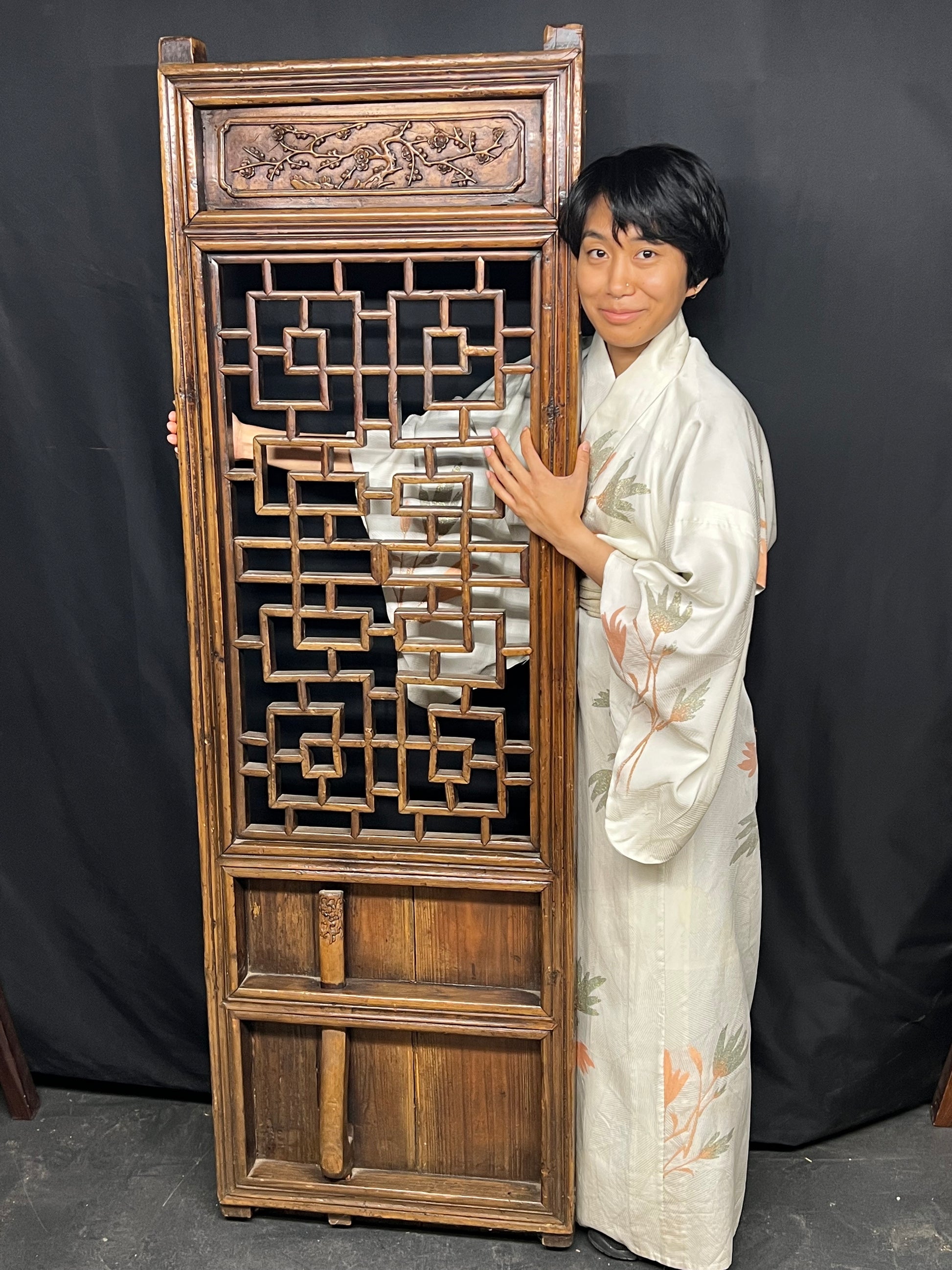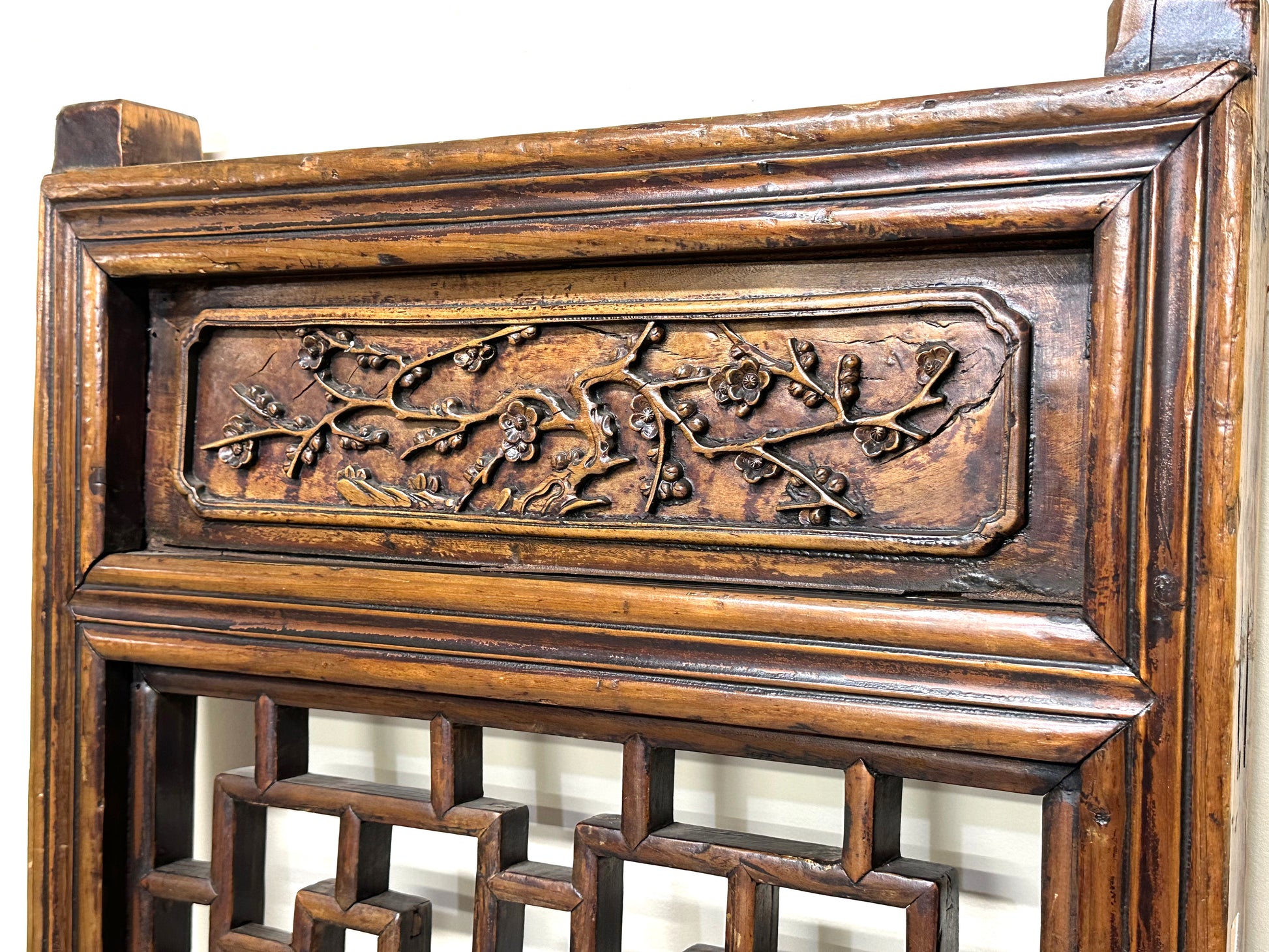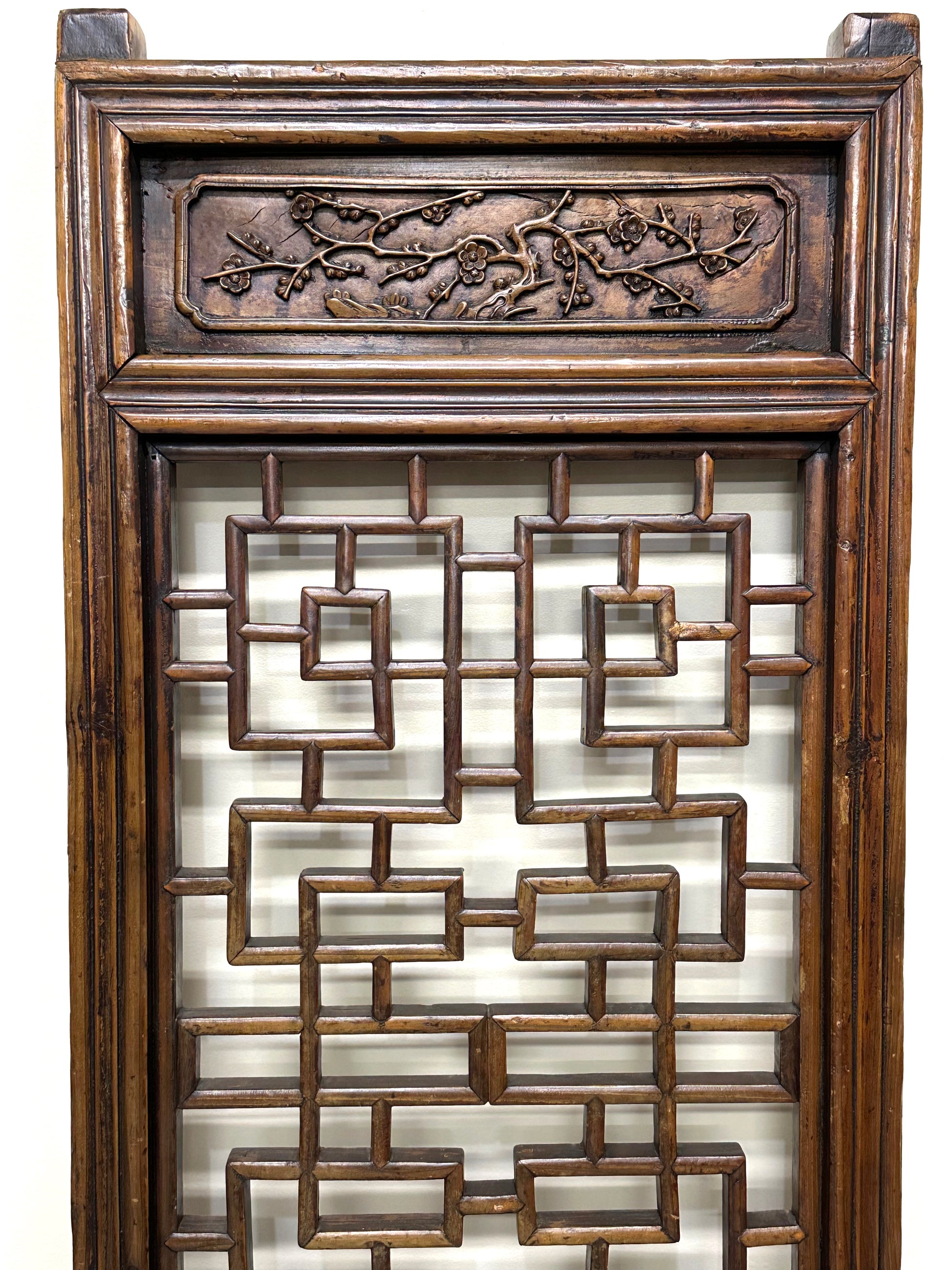 This is an antique Chinese 19th century Qing Dynasty carved lattice door. The upper portion is decorated with carvings of plum tree branches and open blossoms.