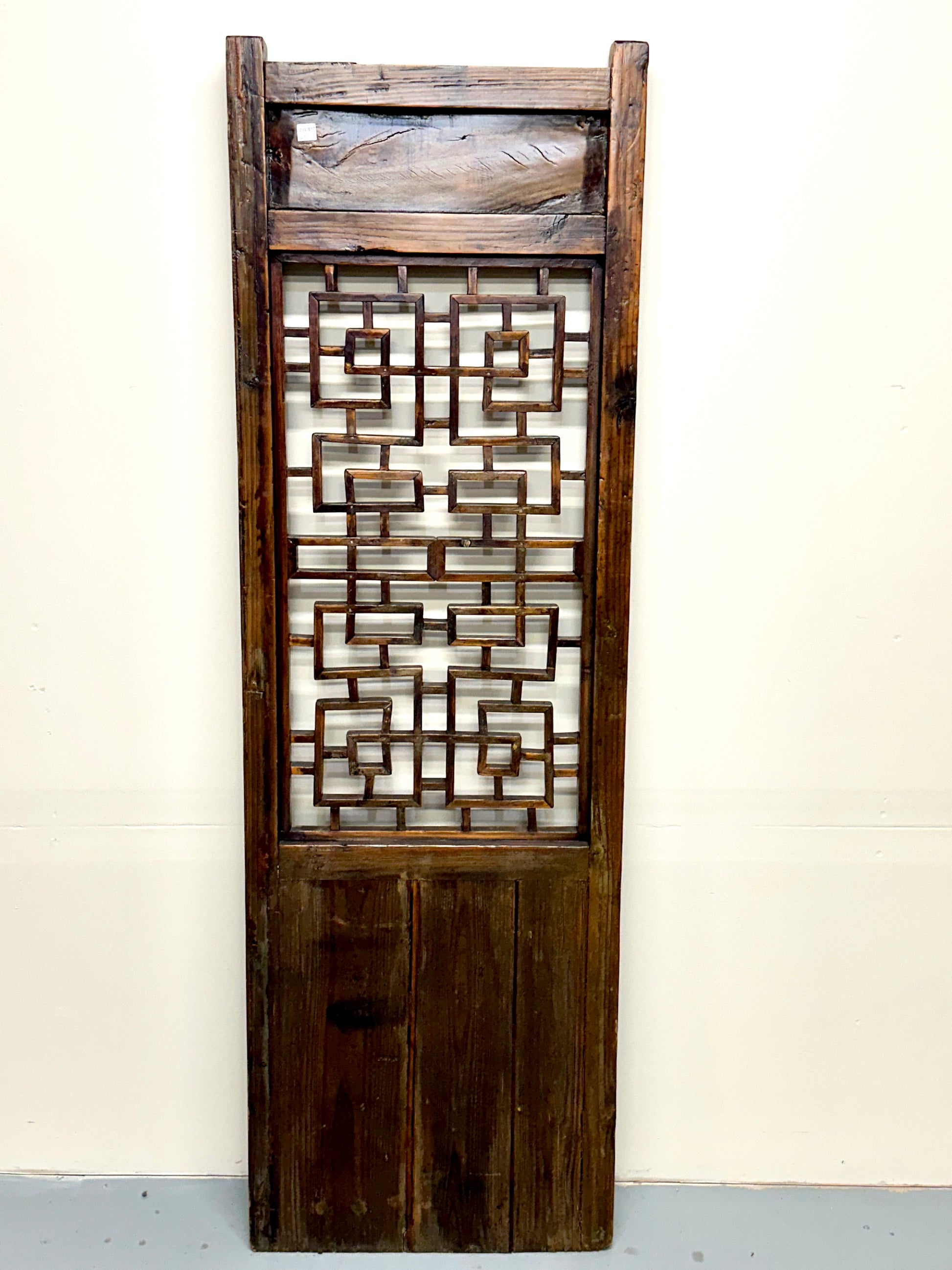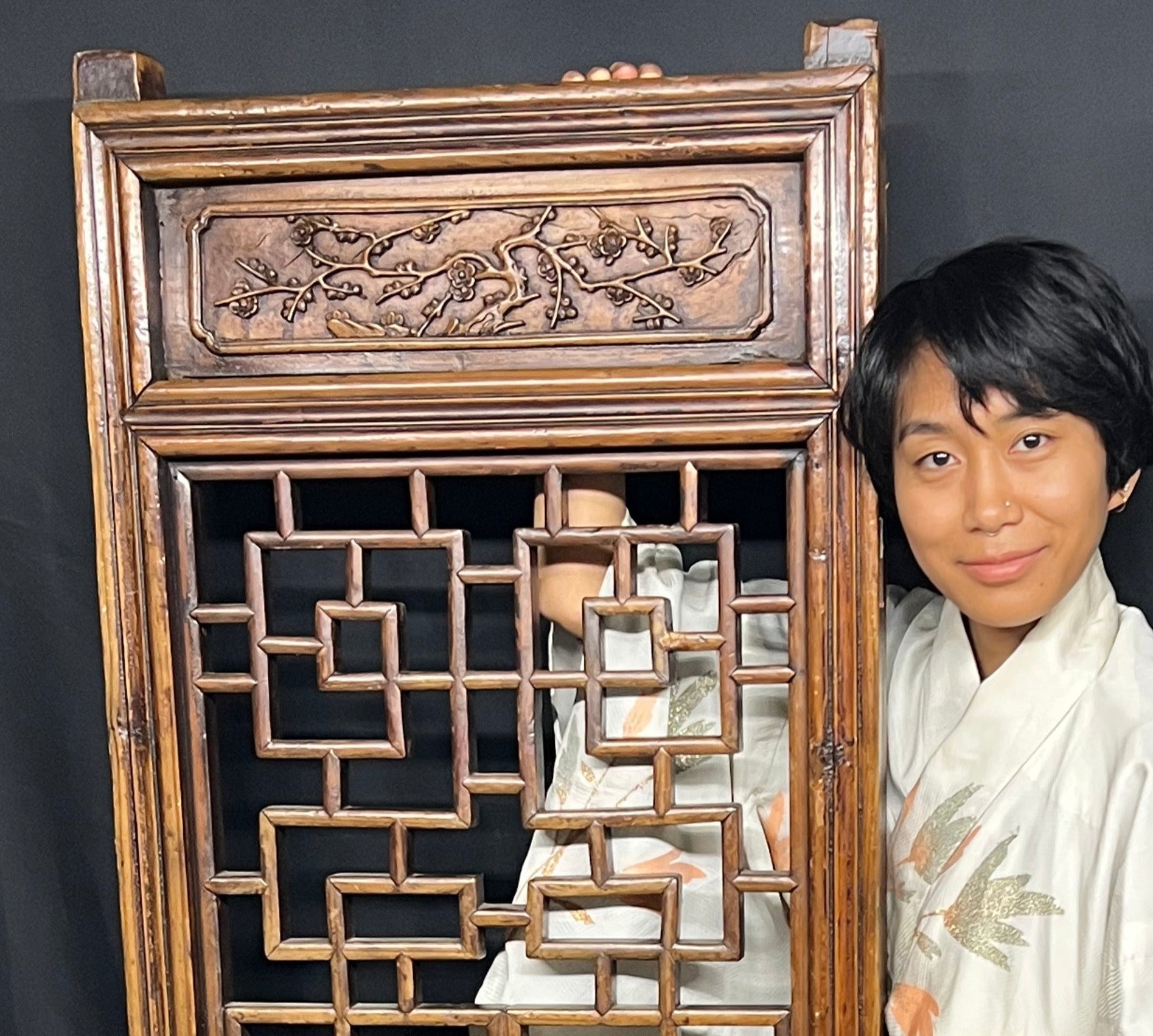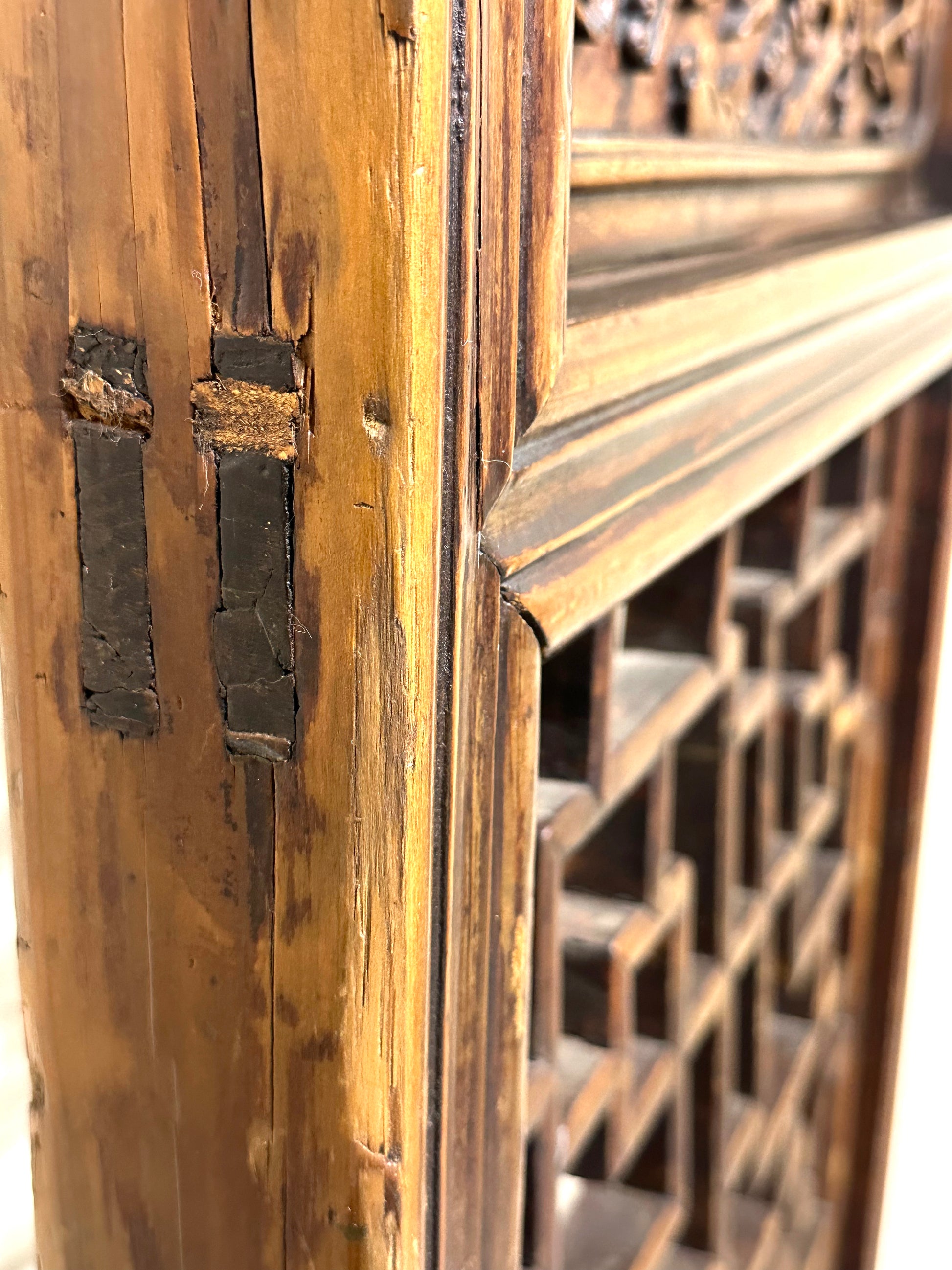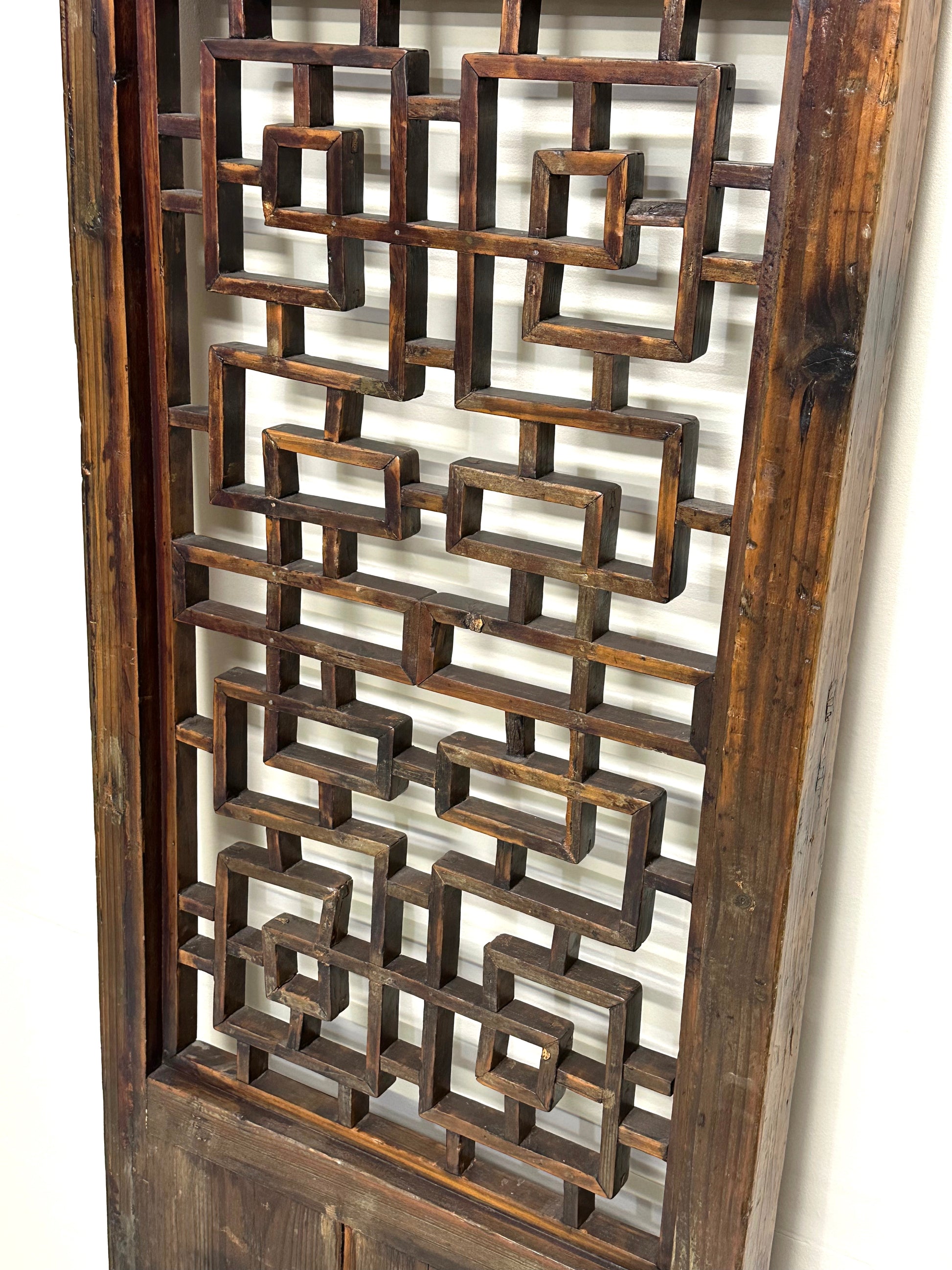 This is an antique Chinese 19th century Qing Dynasty carved lattice door. The upper portion is decorated with carvings of plum tree branches and open blossoms.