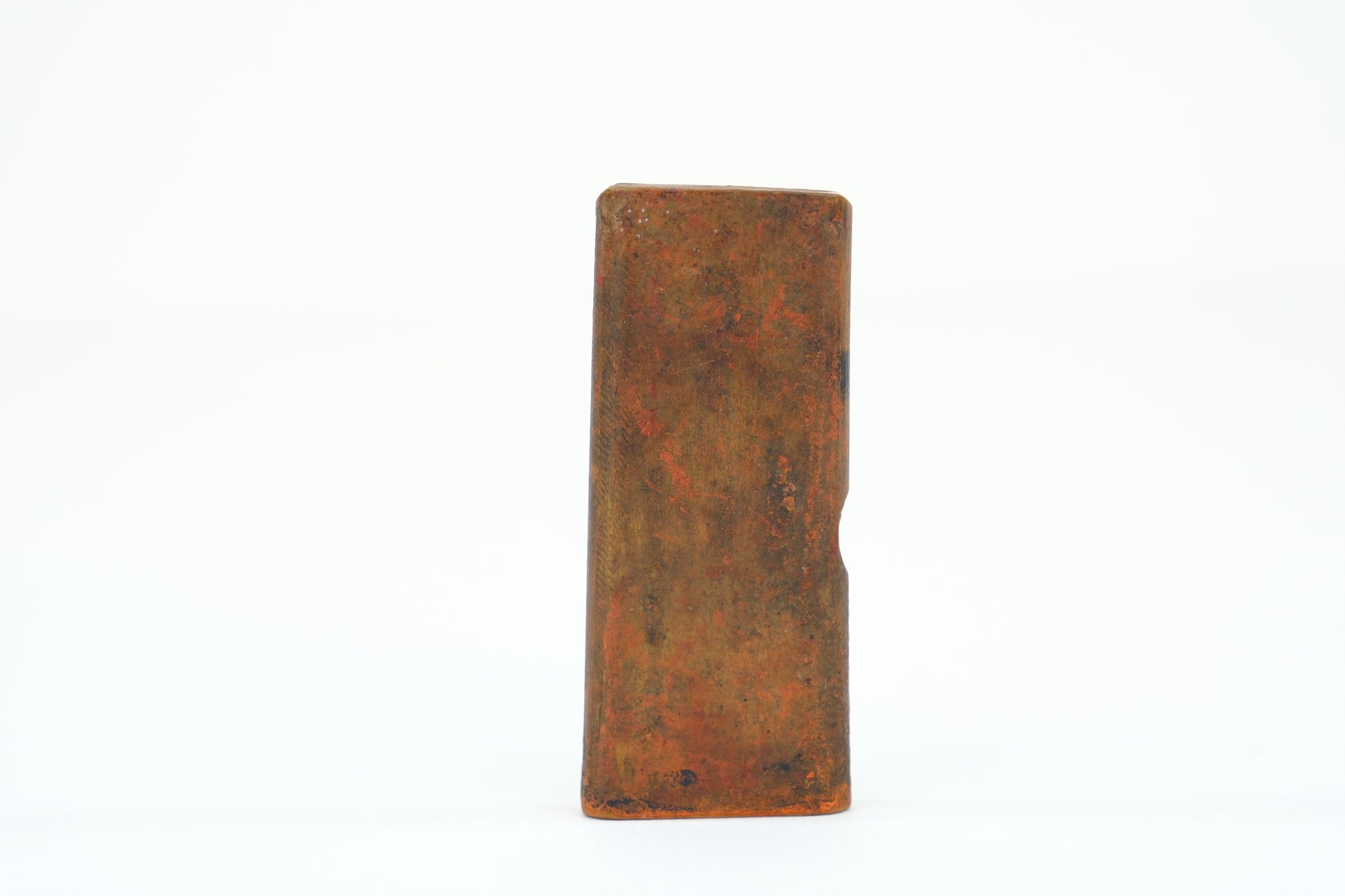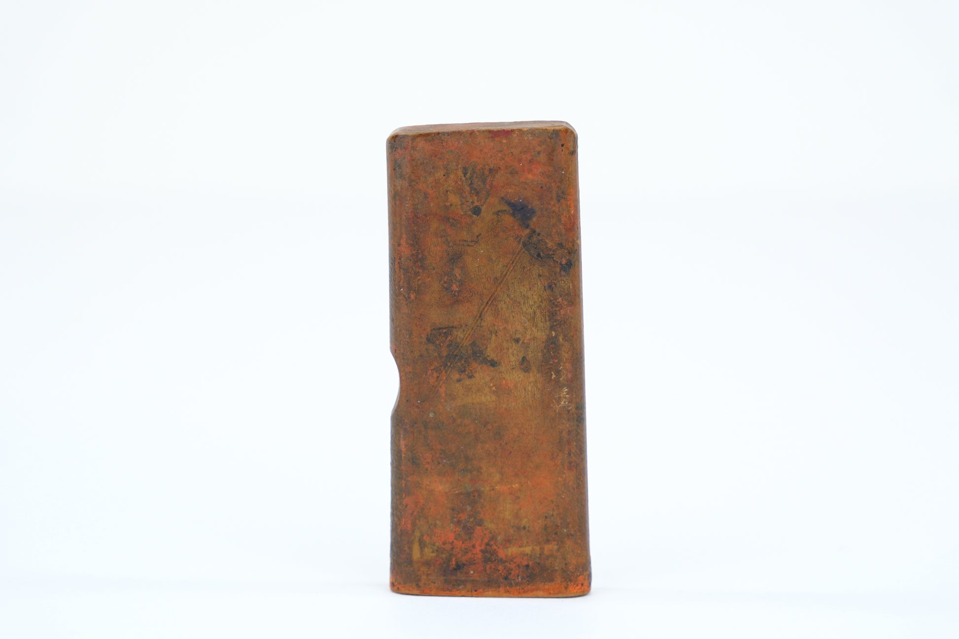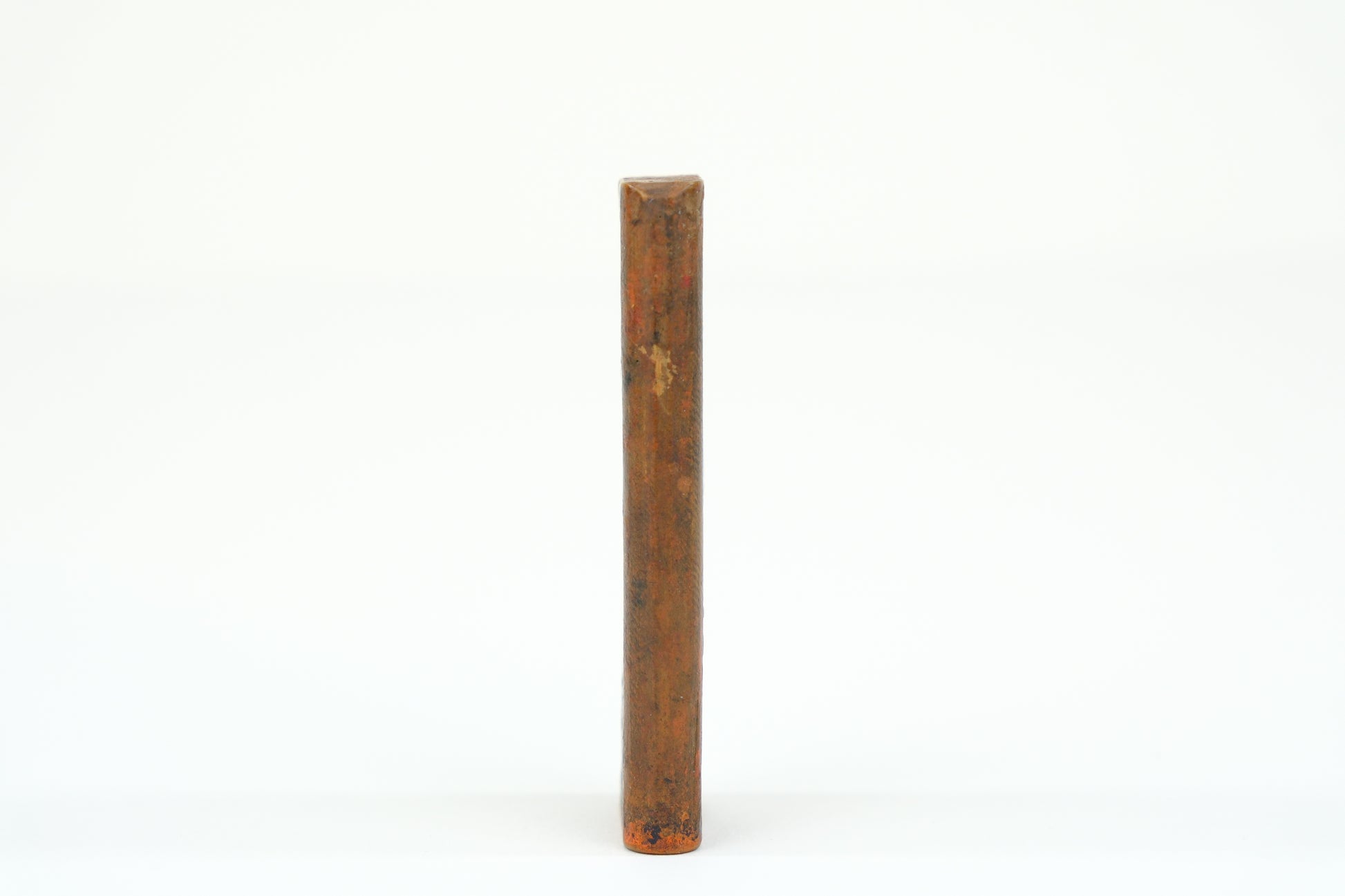 This over a half century old inkan stamp measures 2.5" tall by 1" wide by 1/8” thick. Despite some minor signs of use, this stamp remains in good condition.