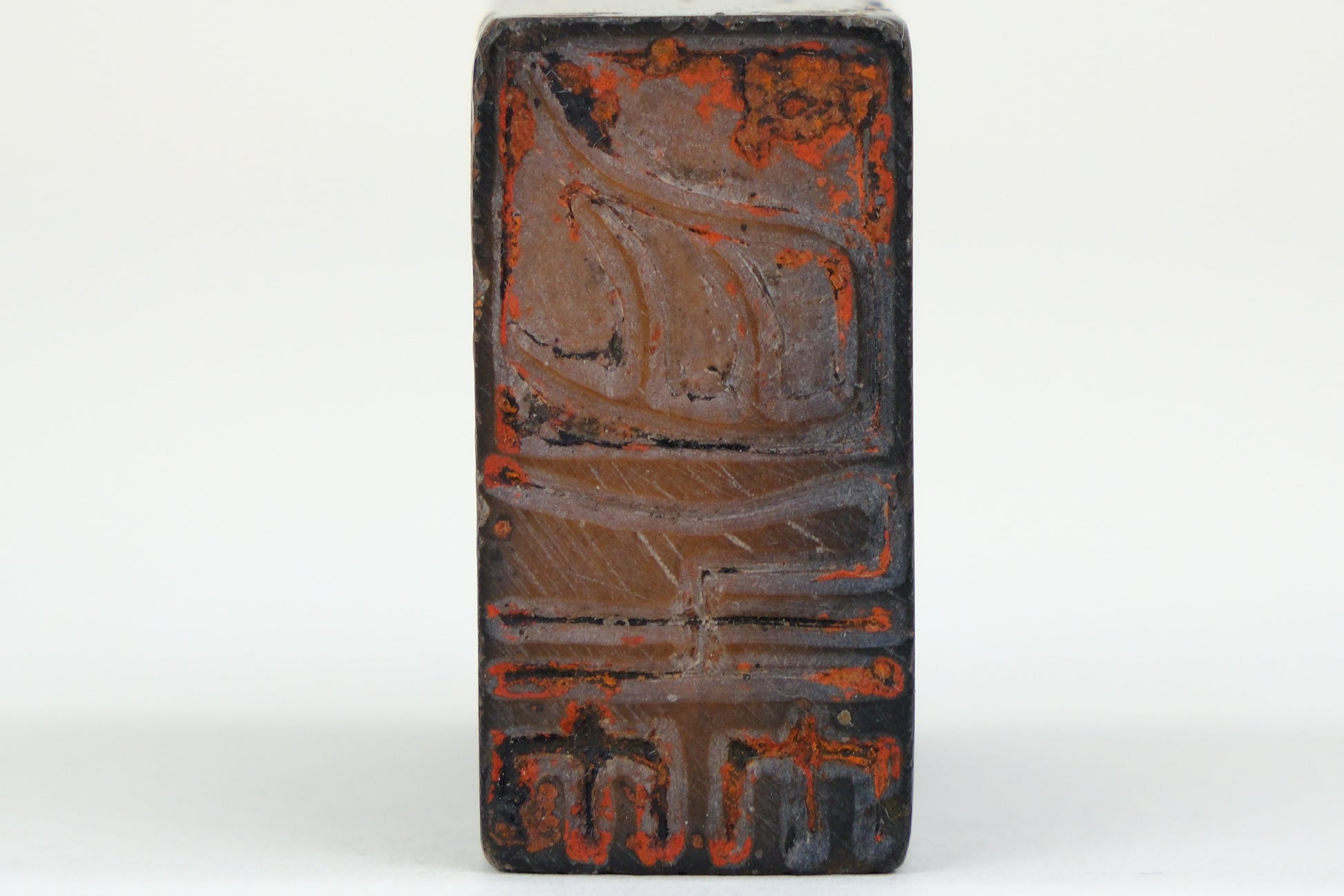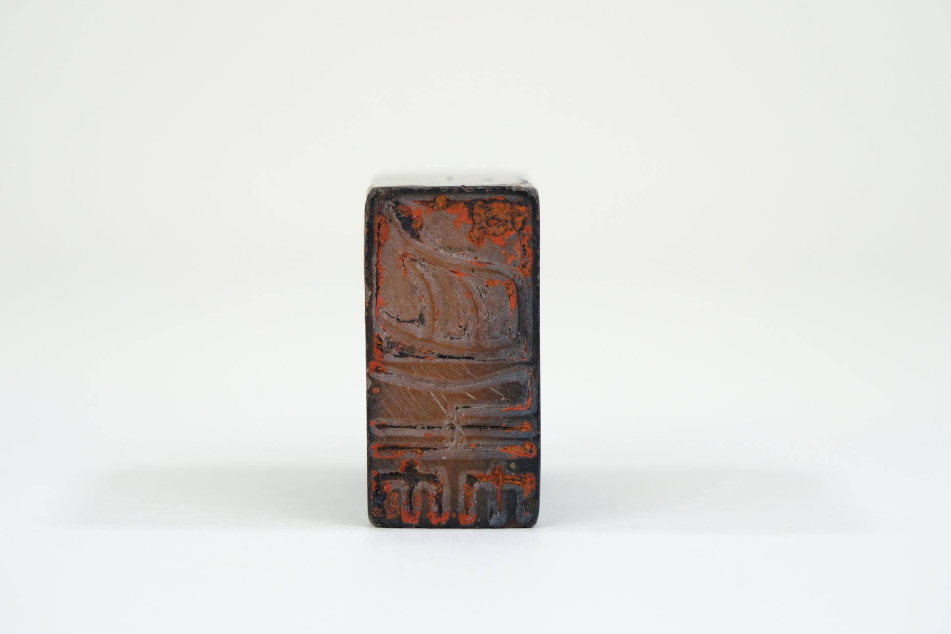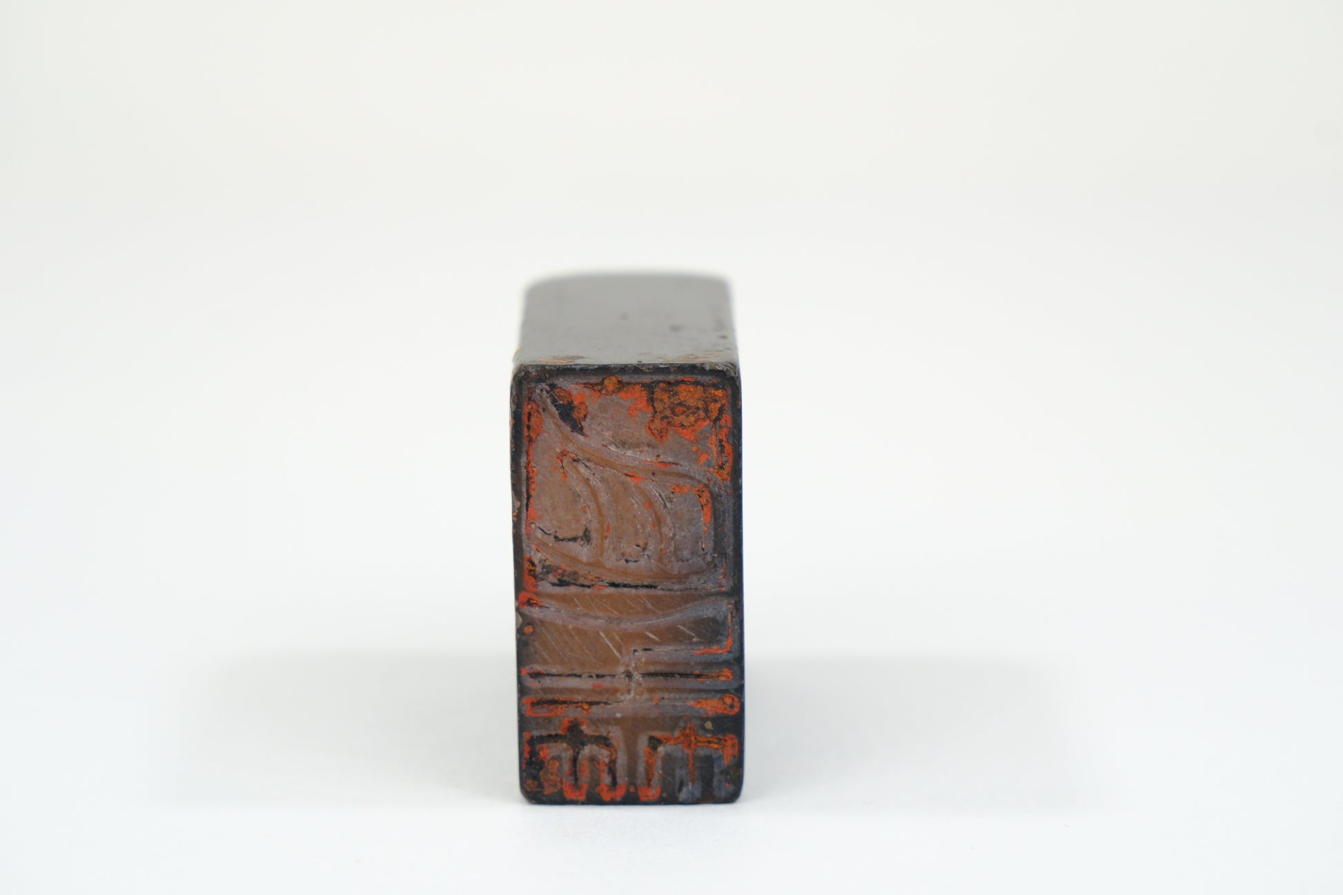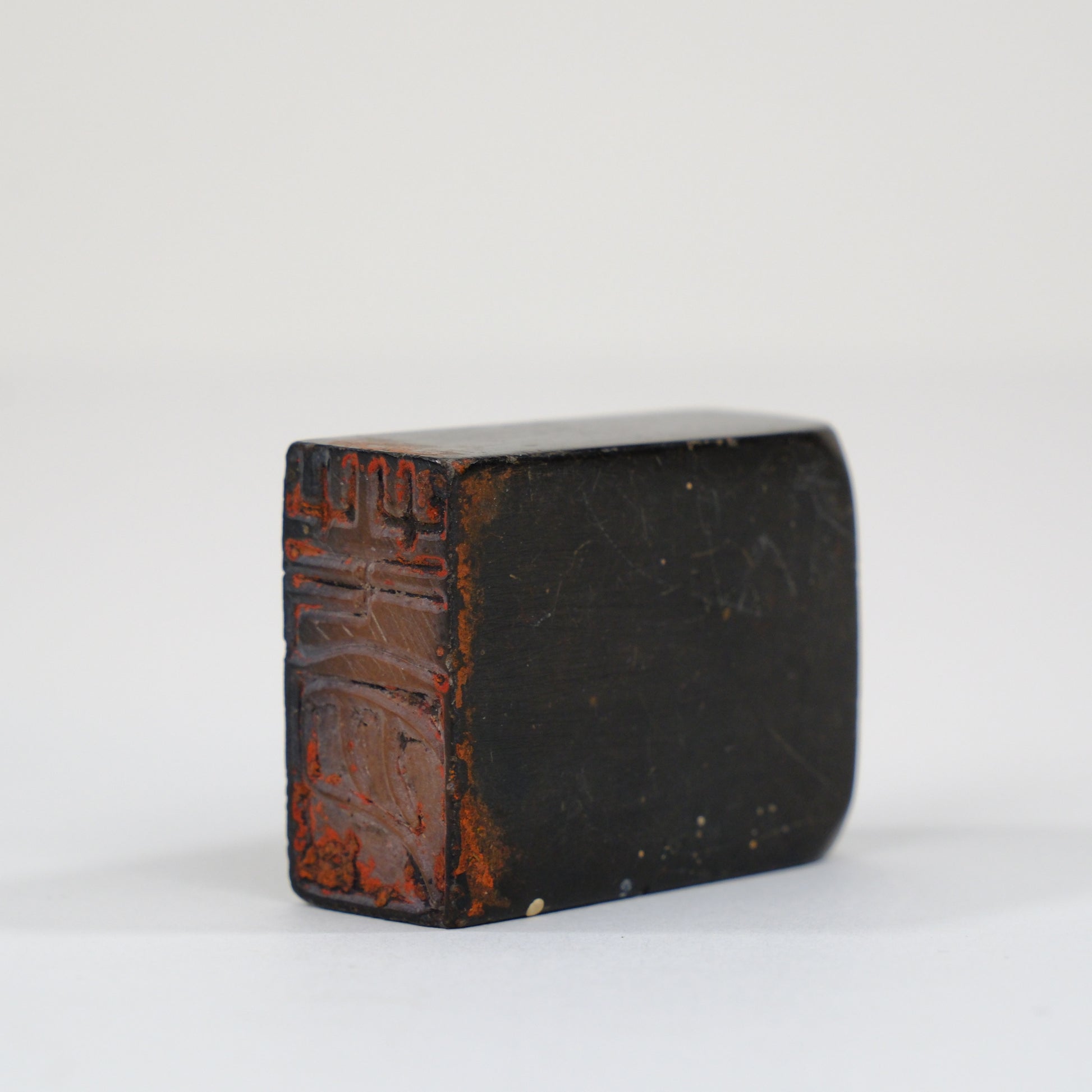 This over a half century old inkan stamp measures 1.75" tall by 1.25" wide by 5/8” thick. Despite some minor signs of use, this stamp remains in excellent condition.