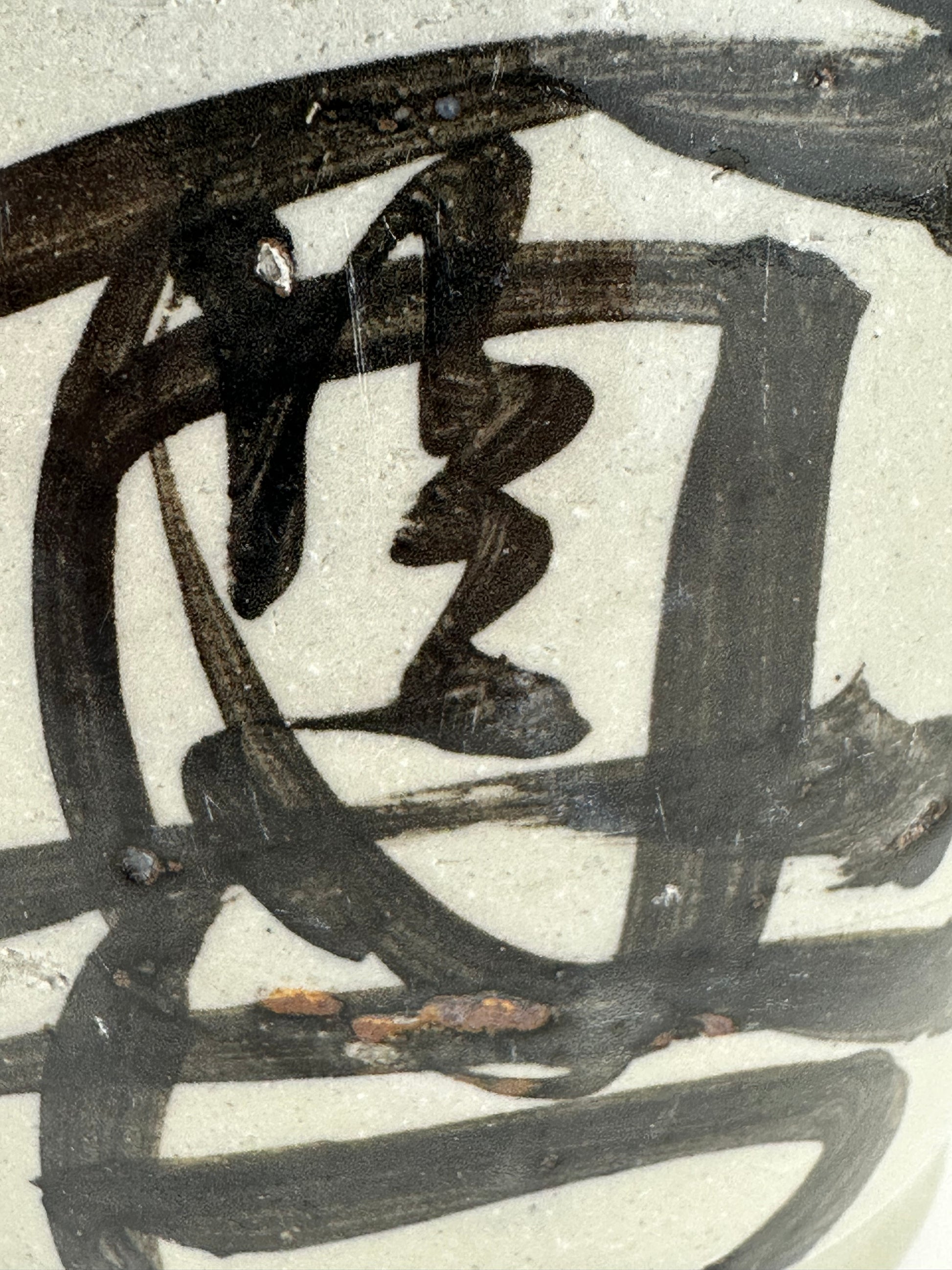 Thrown by hand on the potter’s wheel, these jugs were high-fired stoneware or earthenware, coated in a durable shiro glaze (white slip or feldspathic glaze) and often boldly brushed with calligraphic characters denoting the brewer’s mark, establishment name, or the sake brand. The iron-oxide brushwork—frequently applied with swift, expressive movements—reflects both functional labeling and aesthetic tradition, evoking Japan’s enduring wabi-sabi sensibility. This piece says 中屋 (Nakaya).