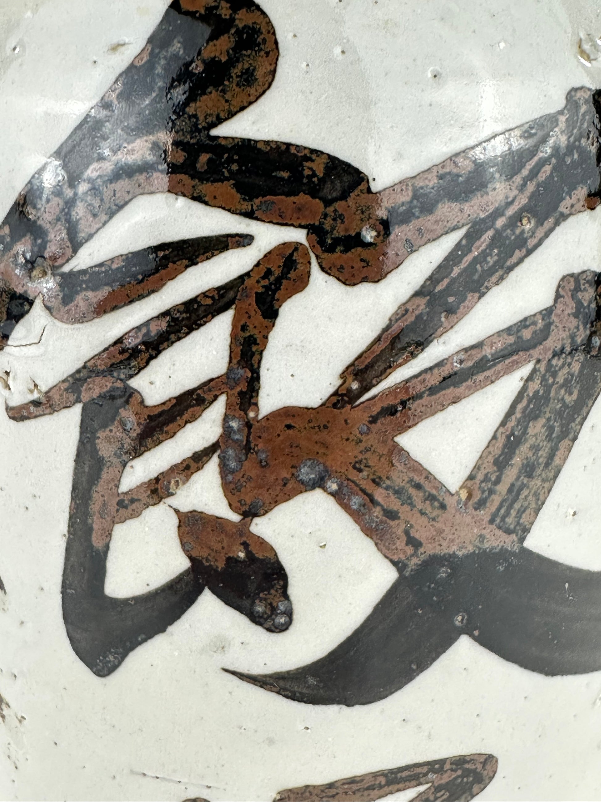 Thrown by hand on the potter’s wheel, these jugs were high-fired stoneware or earthenware, coated in a durable shiro glaze (white slip or feldspathic glaze) and often boldly brushed with calligraphic characters denoting the brewer’s mark, establishment name, or the sake brand. The iron-oxide brushwork—frequently applied with swift, expressive movements—reflects both functional labeling and aesthetic tradition, evoking Japan’s enduring wabi-sabi sensibility. This peice say 鯉沼 (Koinuma).