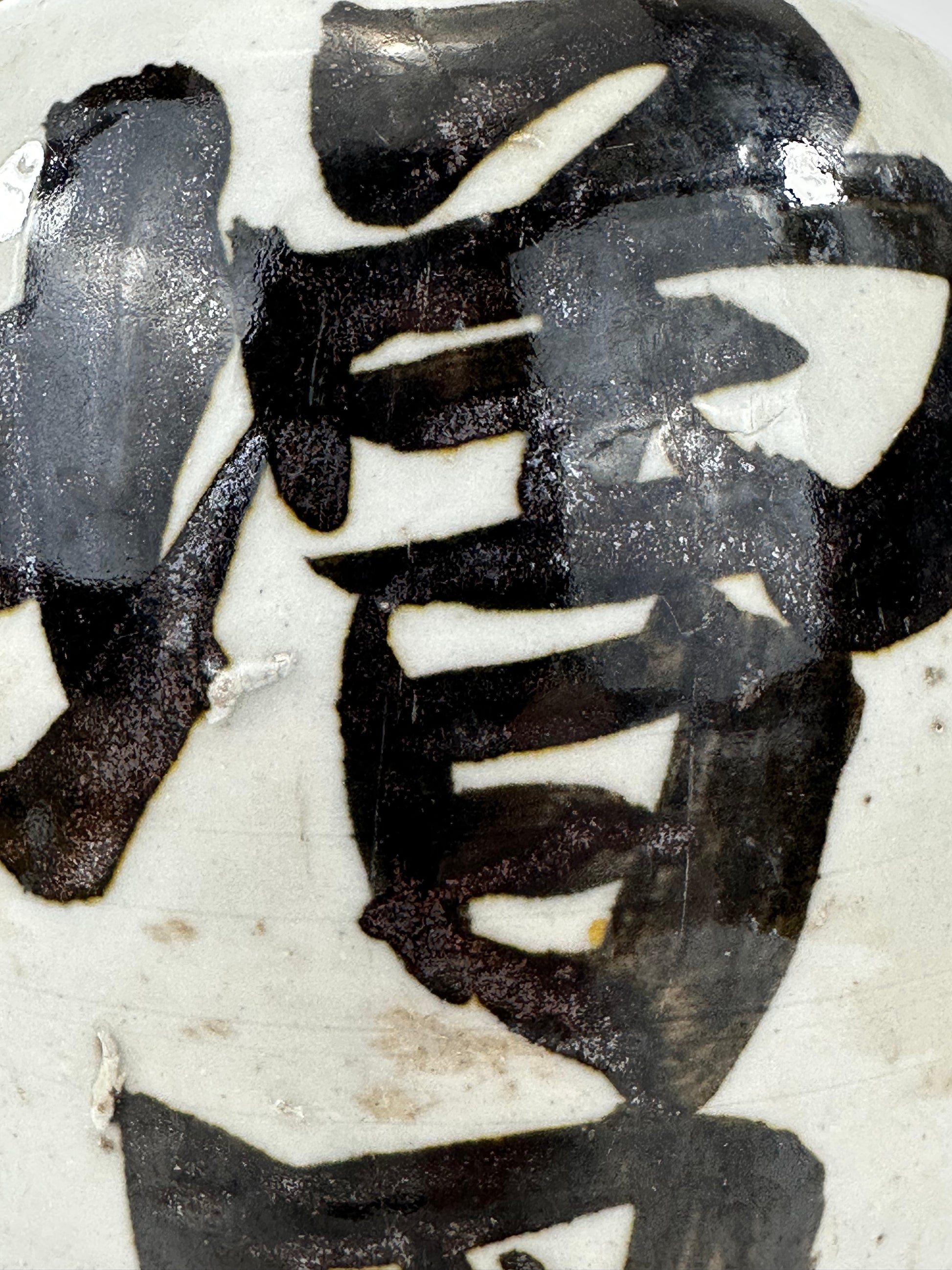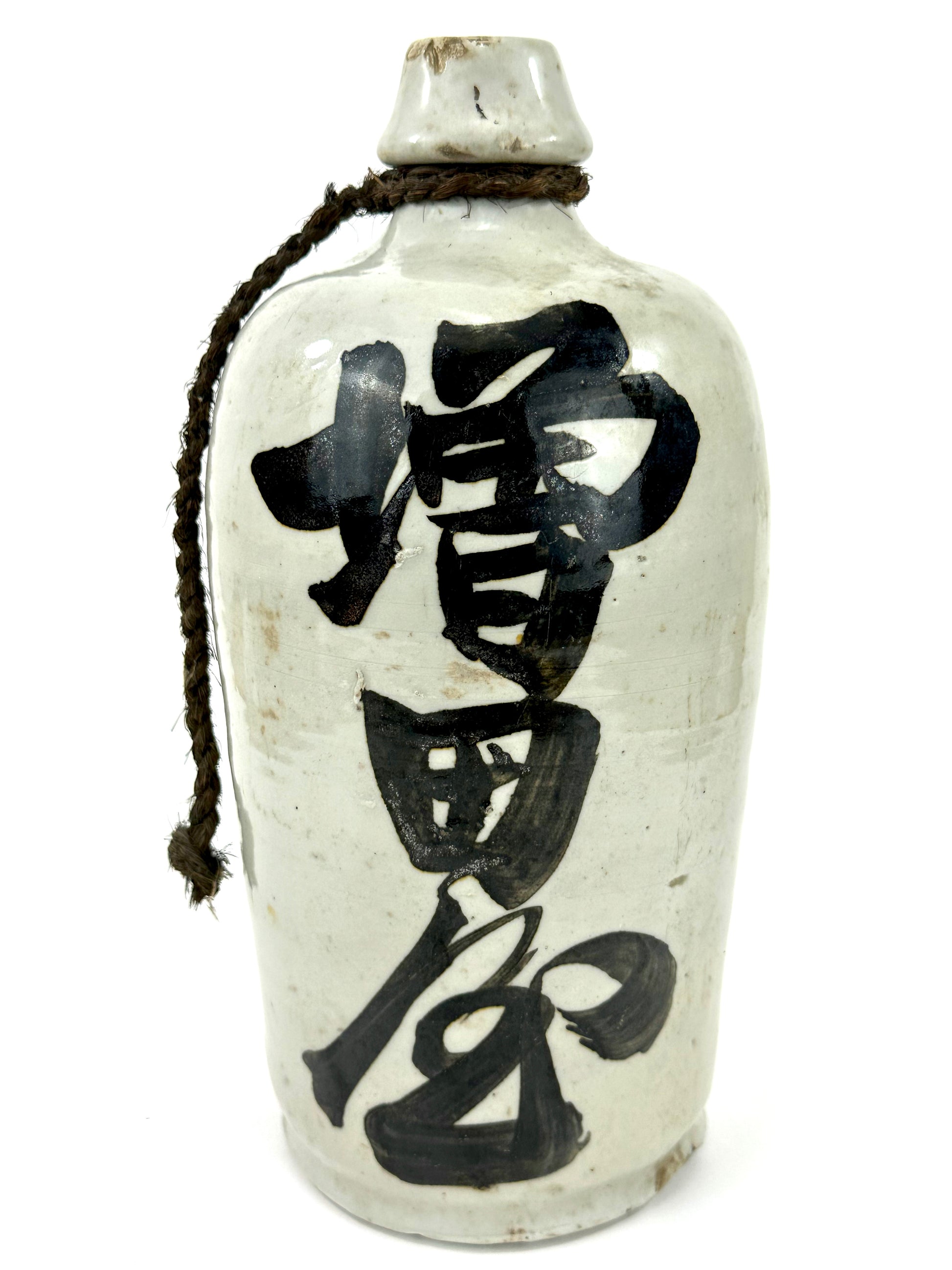 This is an antique Japanese large sake jug from the 19th century. This one is about 10.5" tall and glazed with very decorative calligraphy. This type of sake jug was one of the first recyclables in that it could be returned to the sake company that made it and be refilled. It is all hand made and fired at high temperatures for lasting durability.