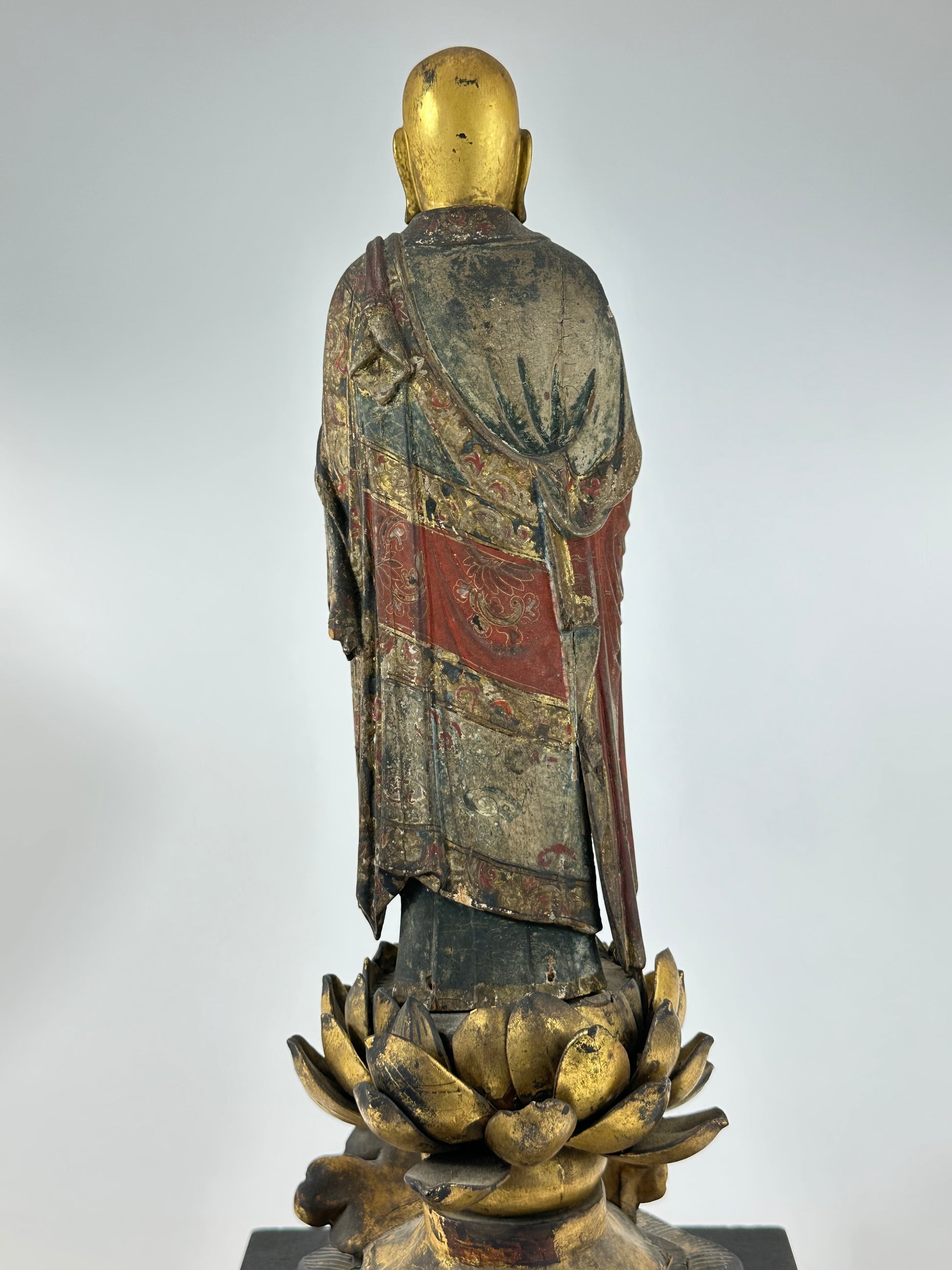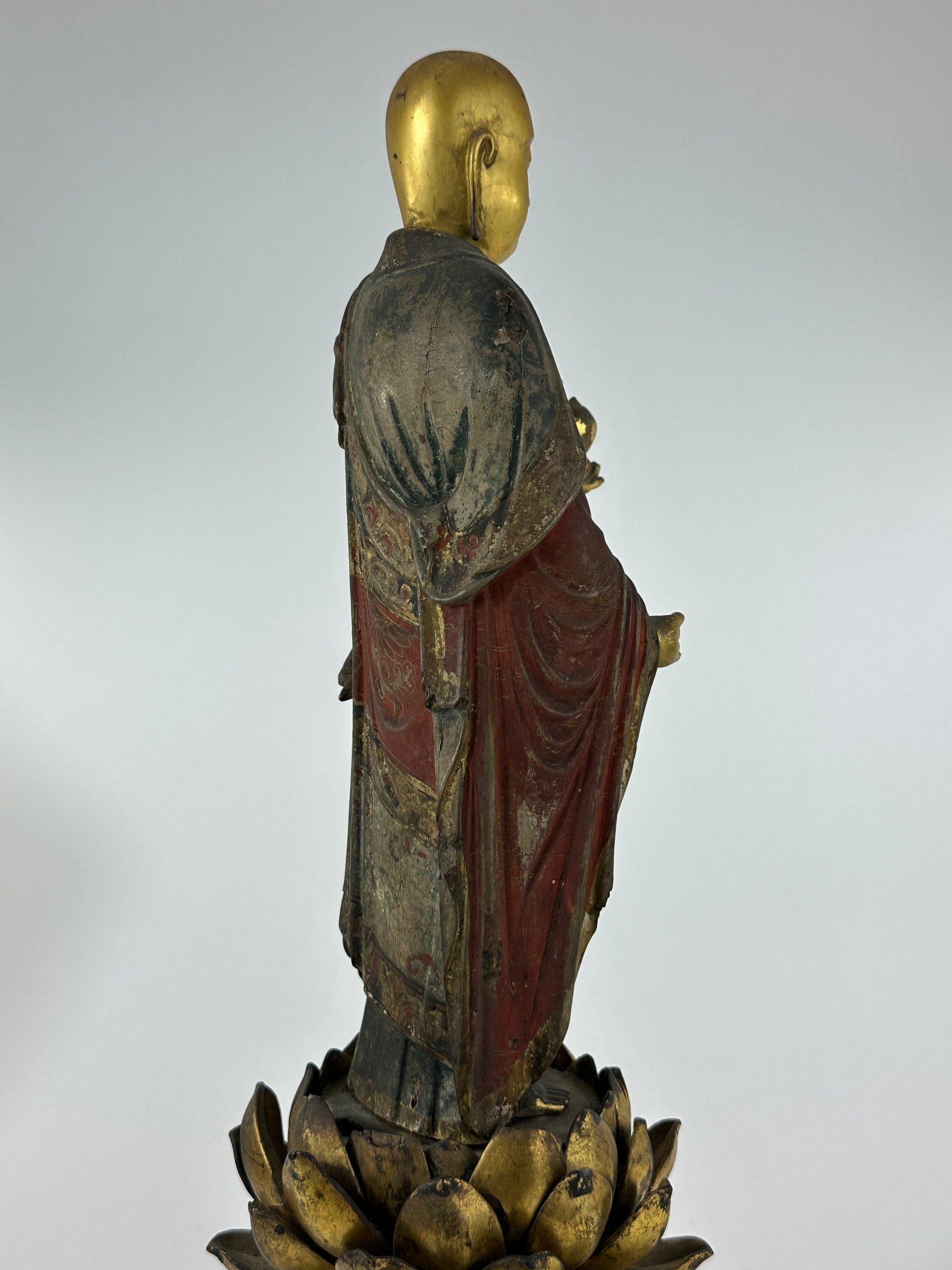 An antique Japanese hand carved wood figural statue. A representation of Ksitigarbha, Lord of the Six Ways, a Bodhisattva revered in Buddhism and depicted traditionally as a bald Buddhist monk. Modeled standing atop a lotus form, surmounting an ornate rectangular form plinth base. Exemplary carved details, with profuse gilt embellishments. Hands modeled holding a Cintamani, or wish-fulfilling jewel, with right hand suggesting it previously held an element representing a khakkhara staff to open the gates of ignorance. No apparent signature. Statue detaches from lotus and Figurine.