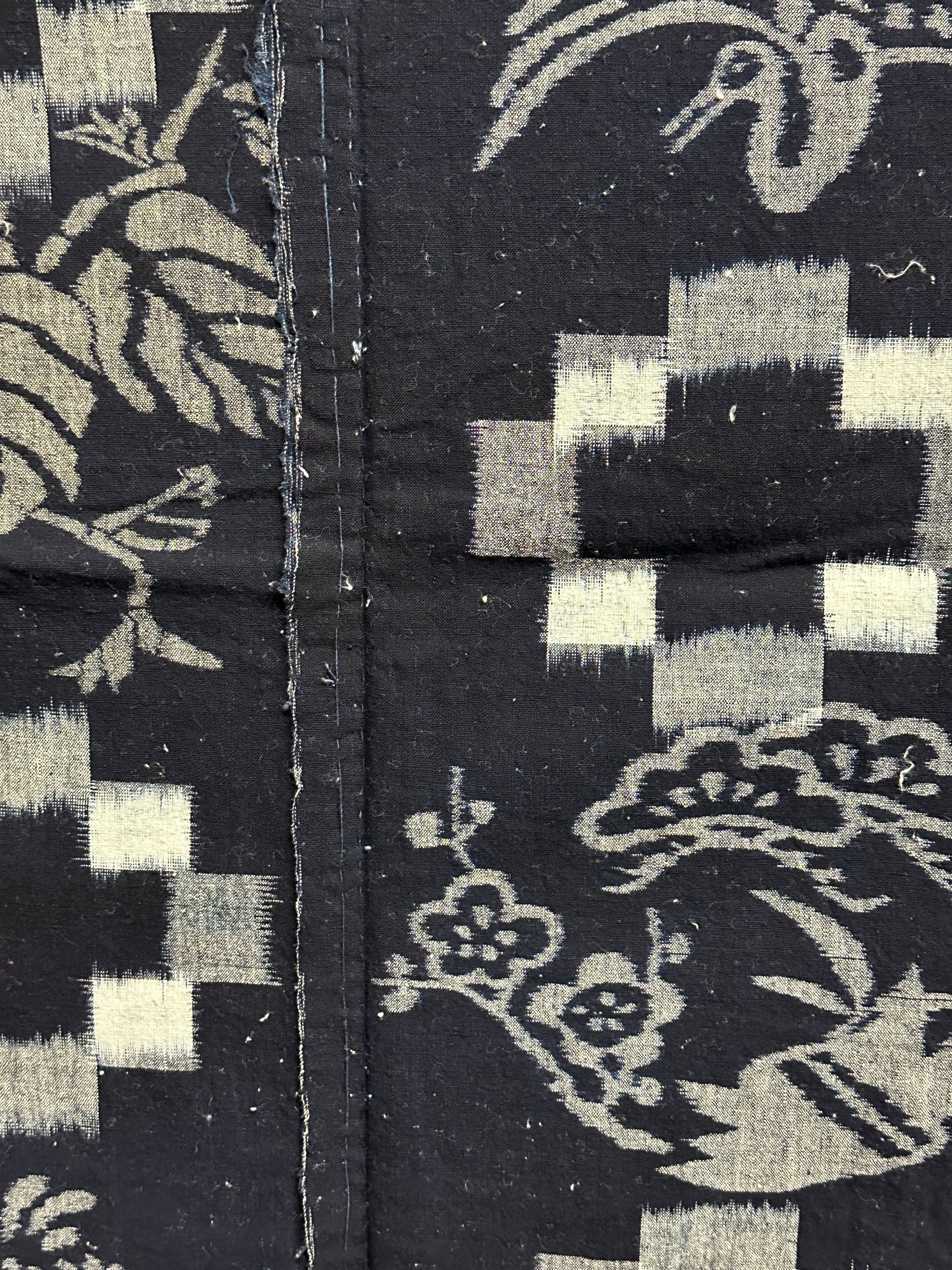 This exquisite piece of 100 year old antique Japanese cotton fabric features woven dyed cotton fabric created using the traditional kasuri dyeing technique. Kasuri is a Japanese weaving technique that involves partially dyeing threads before weaving them together to create patterns and images in the fabric.
