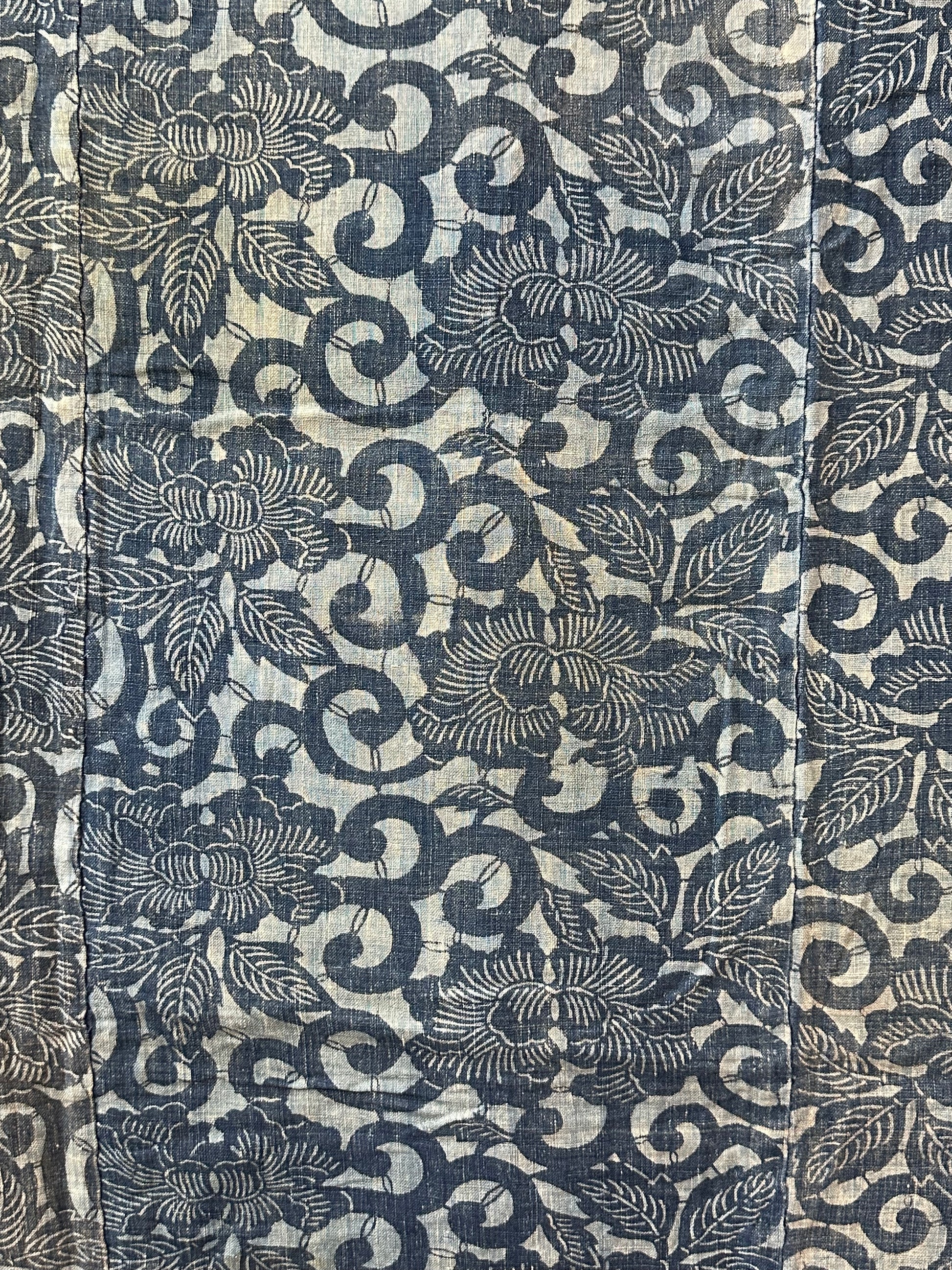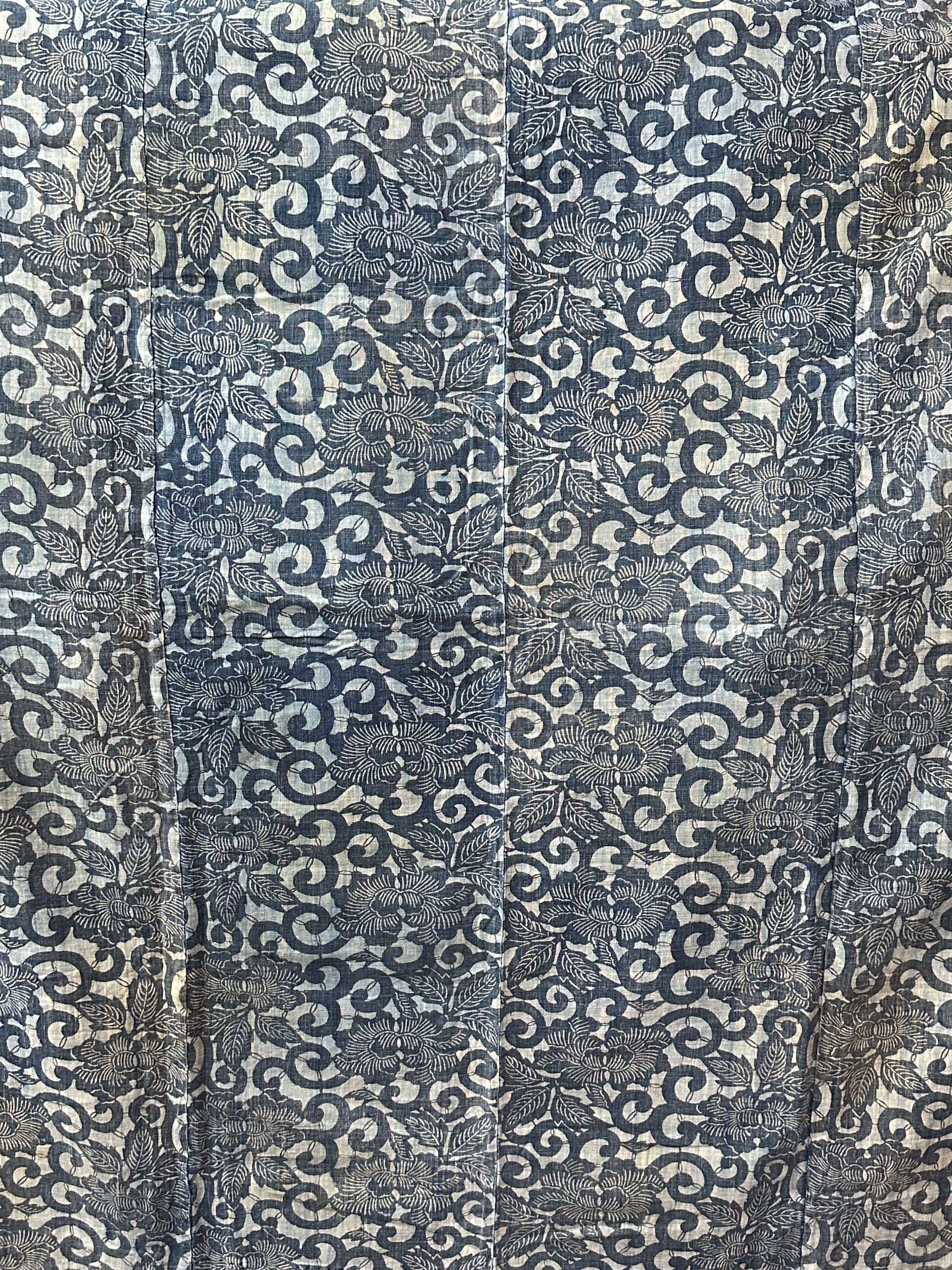 Katazome is a Japanese method of dyeing fabrics using a rice flour resist paste applied through a stencil carved from mulberry paper. The fabric showcases stylized peony flower and arabesque designs all rendered in beautiful indigo hues. Perfect for collectors of Japanese textiles or those seeking a unique decorative piece, this fabric embodies the artistry and cultural heritage of Japan.