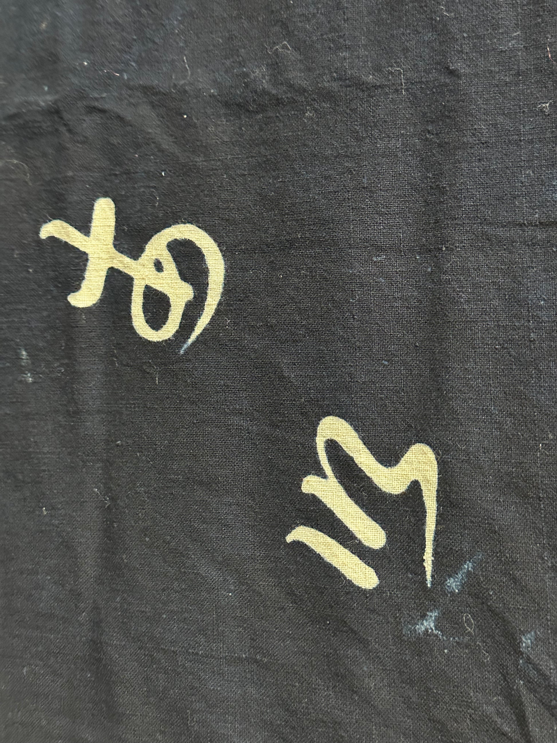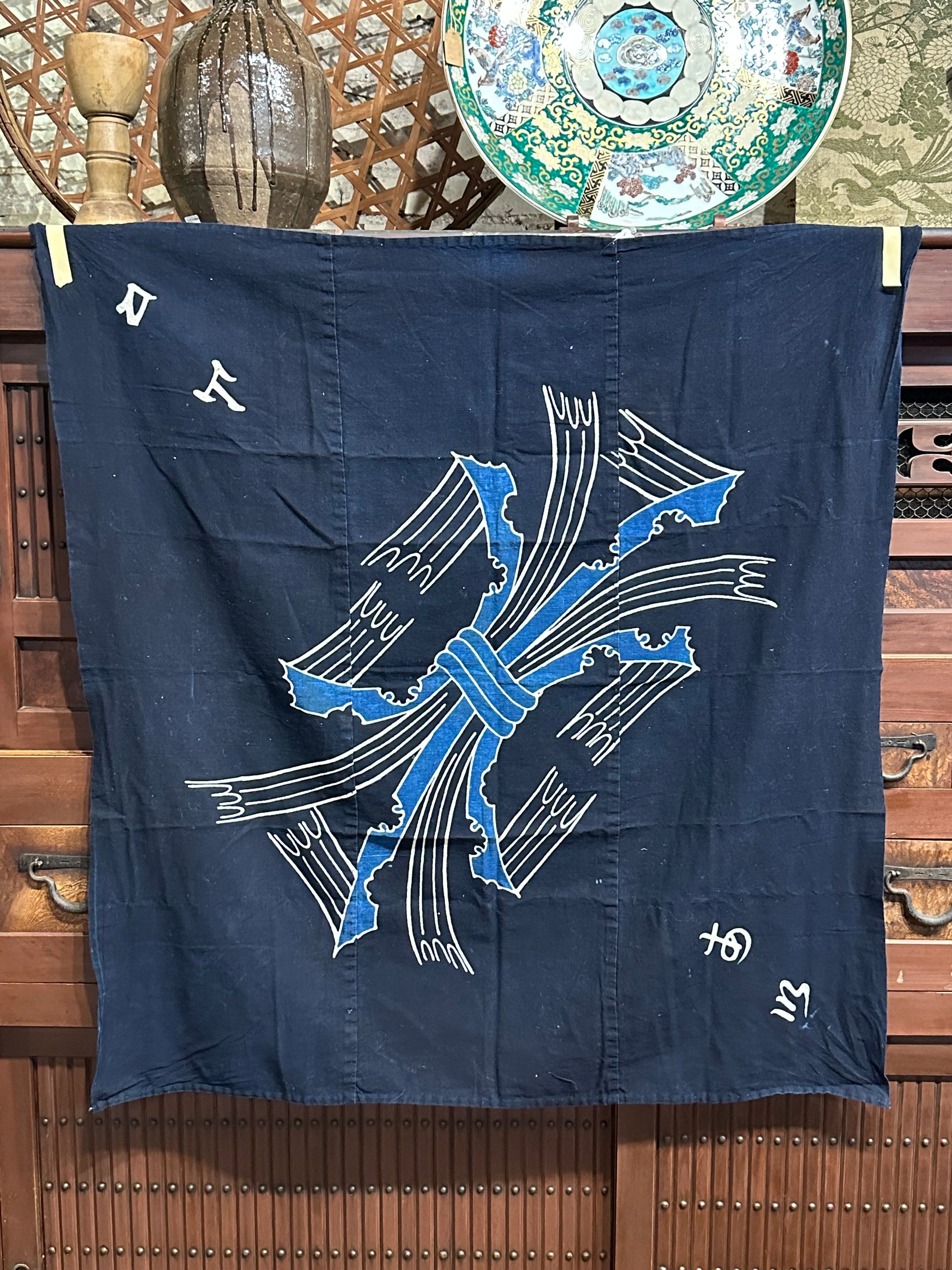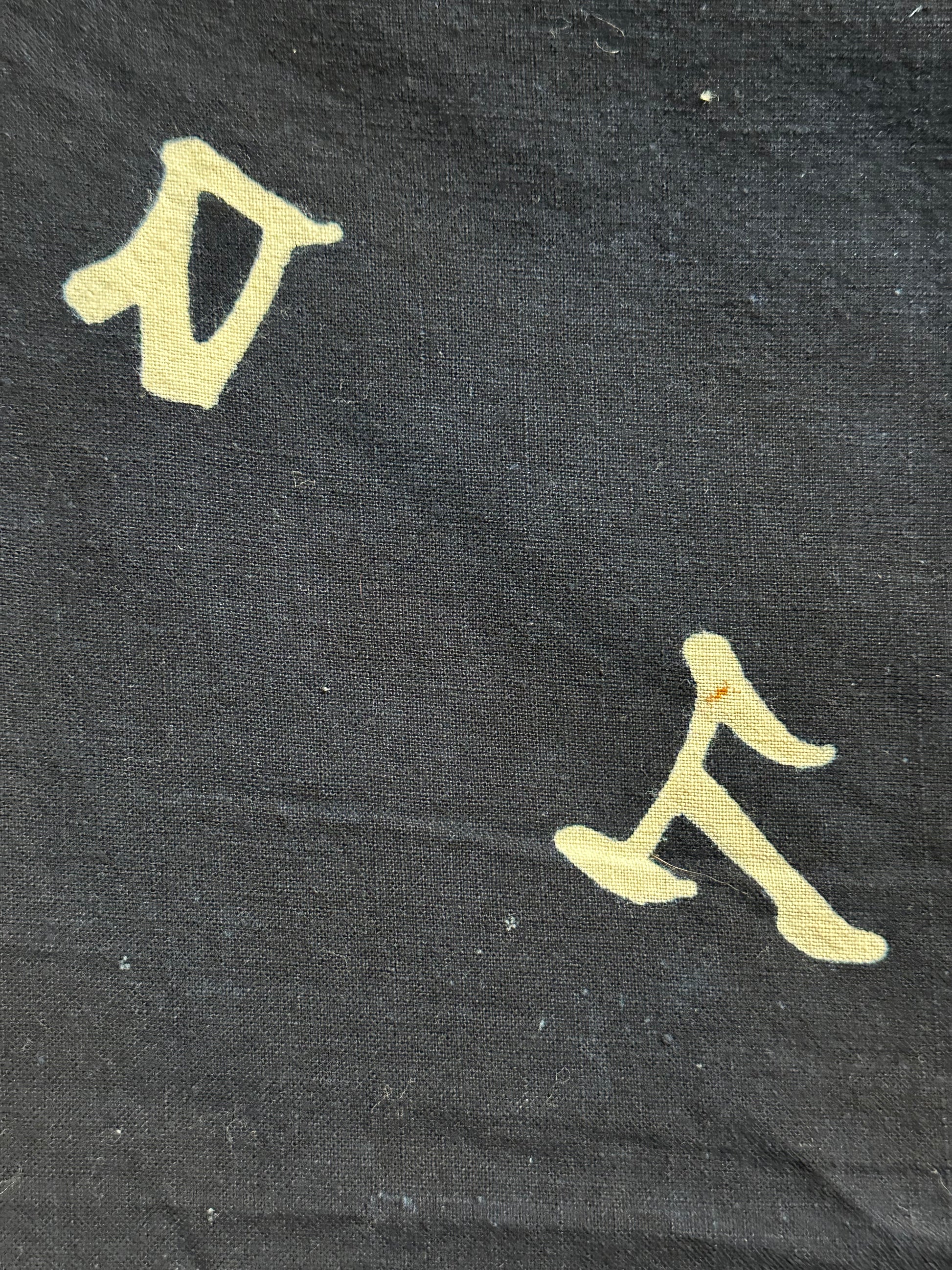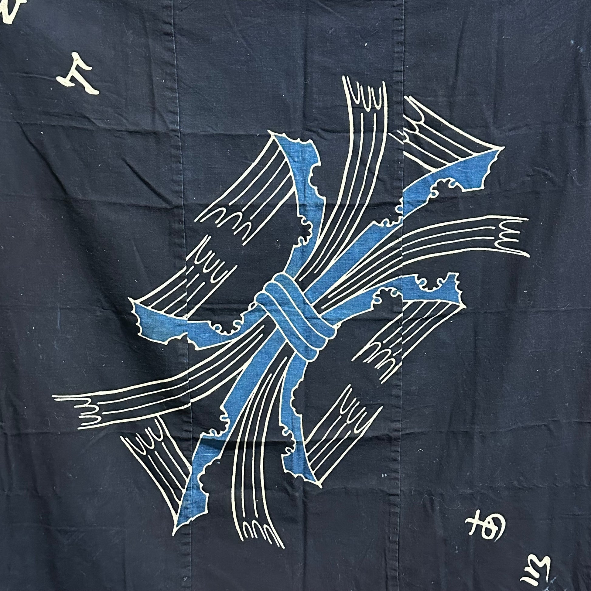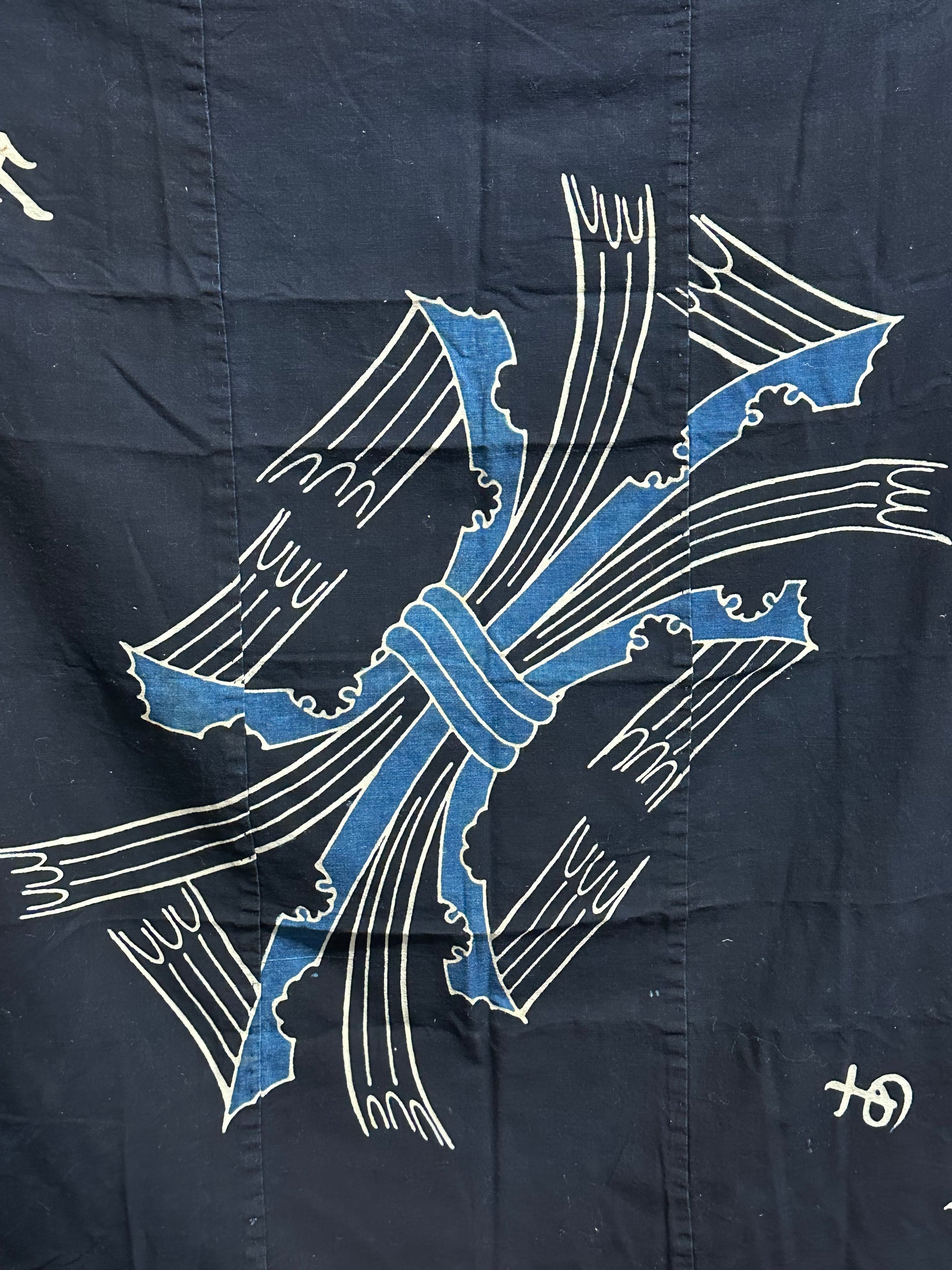 Tsutsugaki is a Japanese resist-dyeing technique where rice paste is applied to fabric to create intricate designs that will resist dye. First, artisans mix rice flour and water to make a thick paste, which is placed in a cone-like tube called a “tsutsu.” Using this tube, they carefully hand-draw designs onto the fabric, often freehand, with skill and precision. Once the paste dries, the fabric is submerged in a vat of natural indigo dye. The areas covered in rice paste resist the dye, preserving the fabric’s original color. After dyeing, the fabric is washed to remove the rice paste, revealing sharp, detailed patterns with a high contrast between the dyed and undyed areas. This process is repeated multiple times for more complex designs, building layers of color and detail.