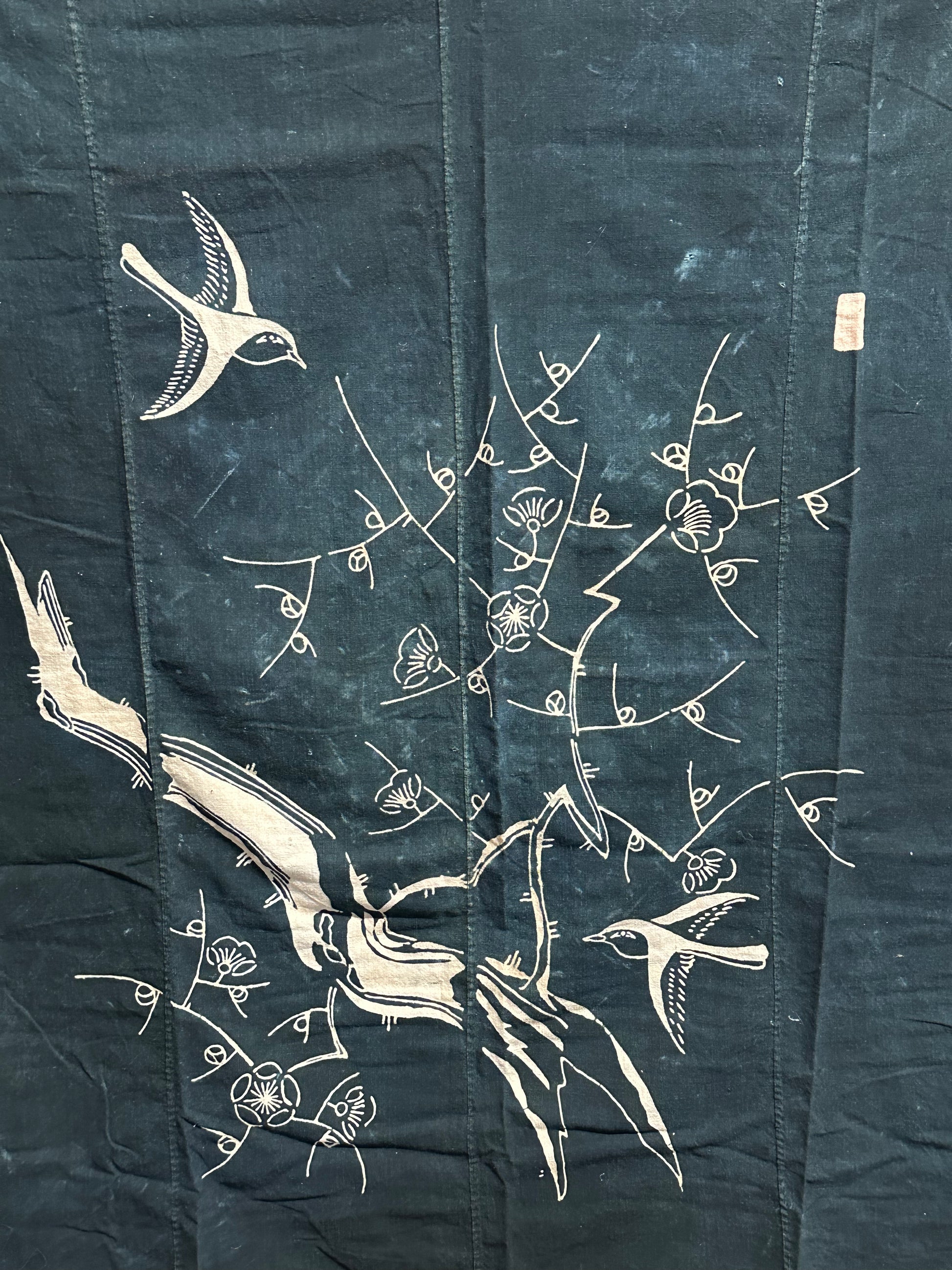Tsutsugaki involves hand-drawing patterns with a resist paste, resulting in intricate and vivid designs. This 4 panel fabric showcases plum blossoms and birds all rendered in multi color and indigo hues. Perfect for collectors of Japanese textiles or those seeking a unique decorative piece, this fabric embodies the artistry and cultural heritage of Japan.