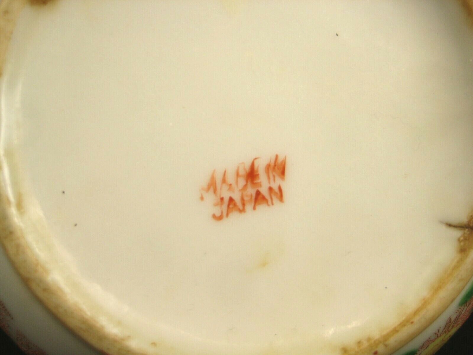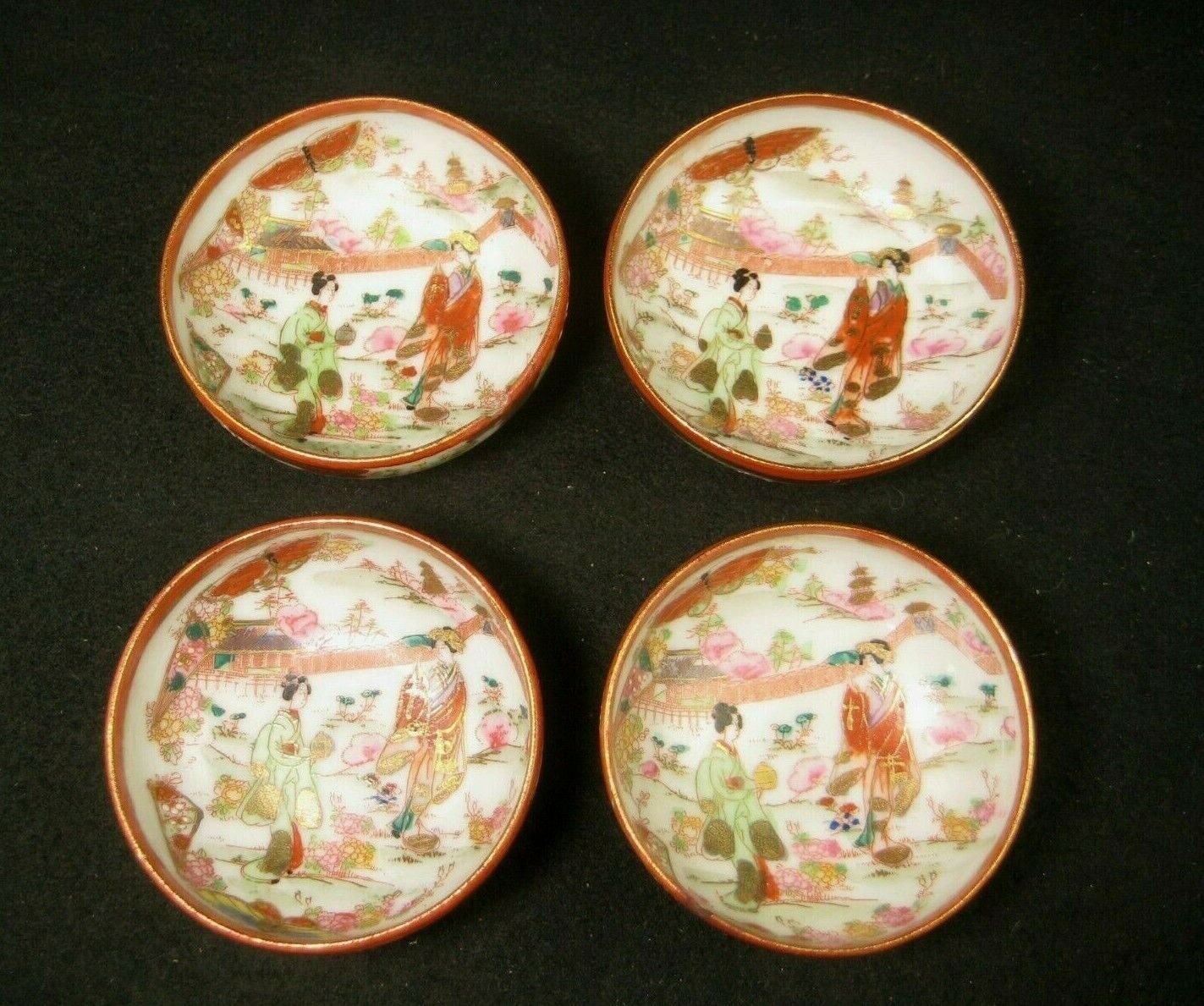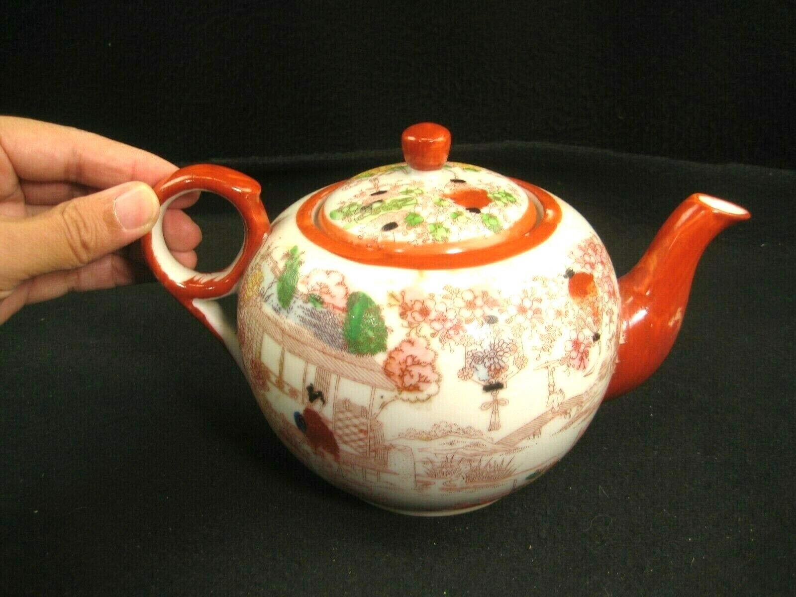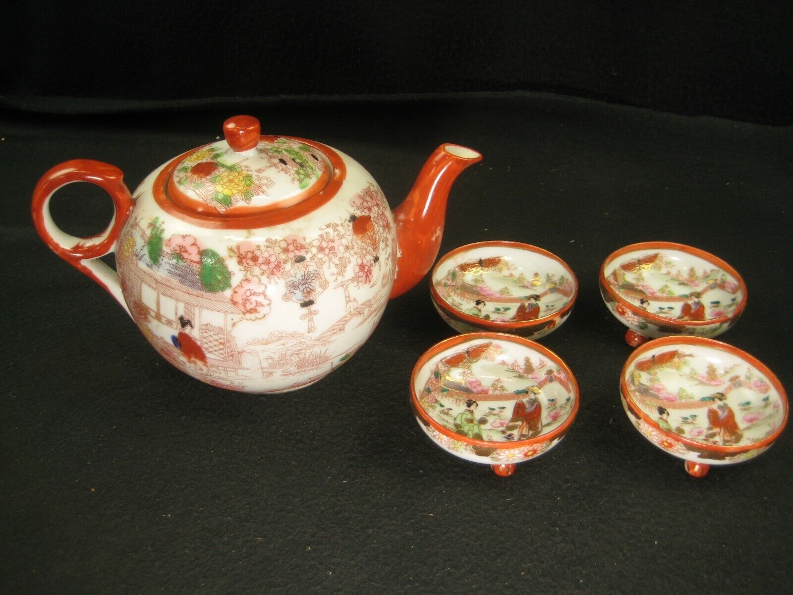 This is an antique Japanese Taisho Era (c. 1920) imari ceramic tea pot ans 4 small tea cups. It is a combination of printed background and hand painted showing a garden scene and tea house with geisha women in kimono. These tea pot and cups were made with high fired ceramics for lasting durability.