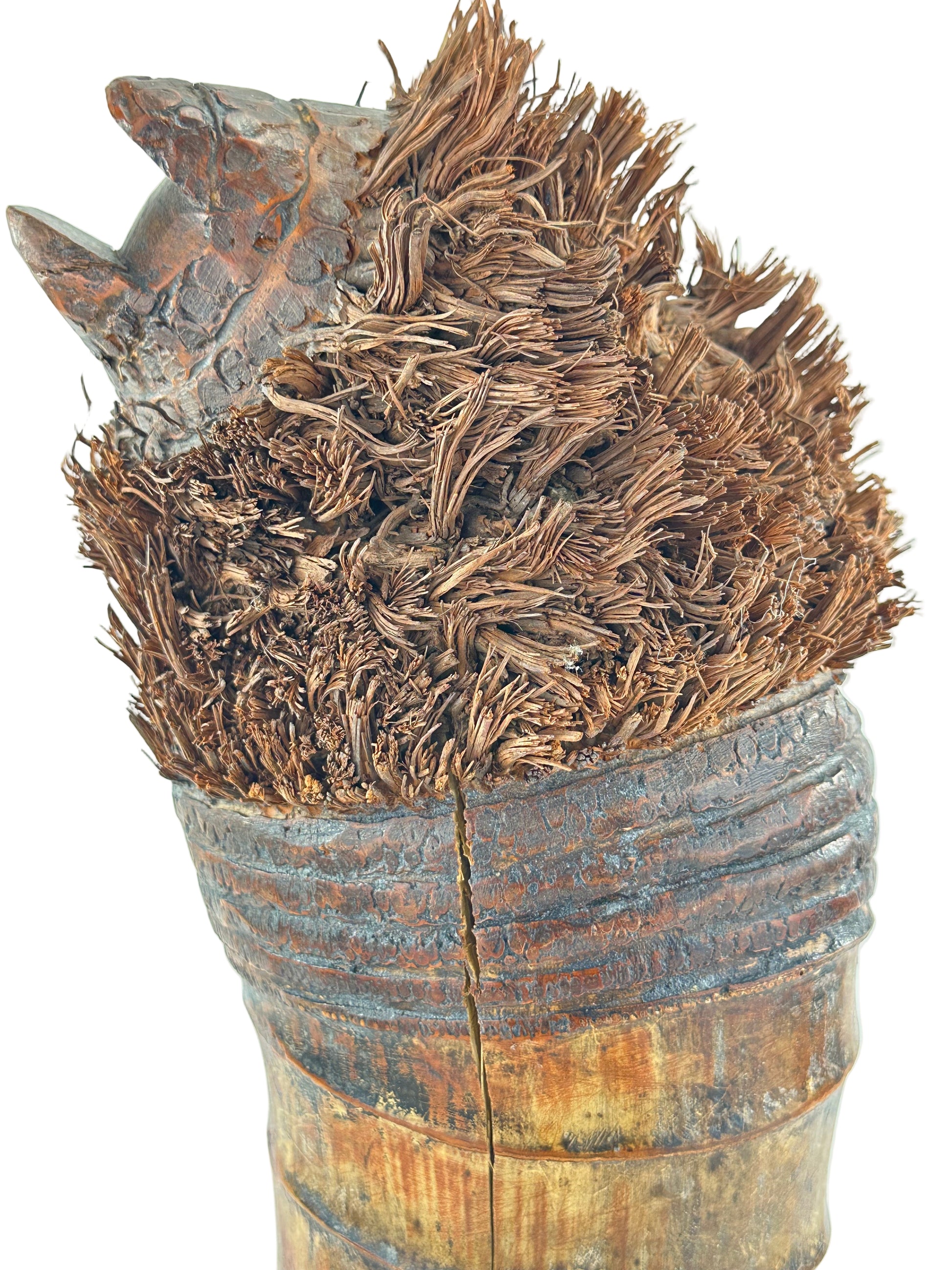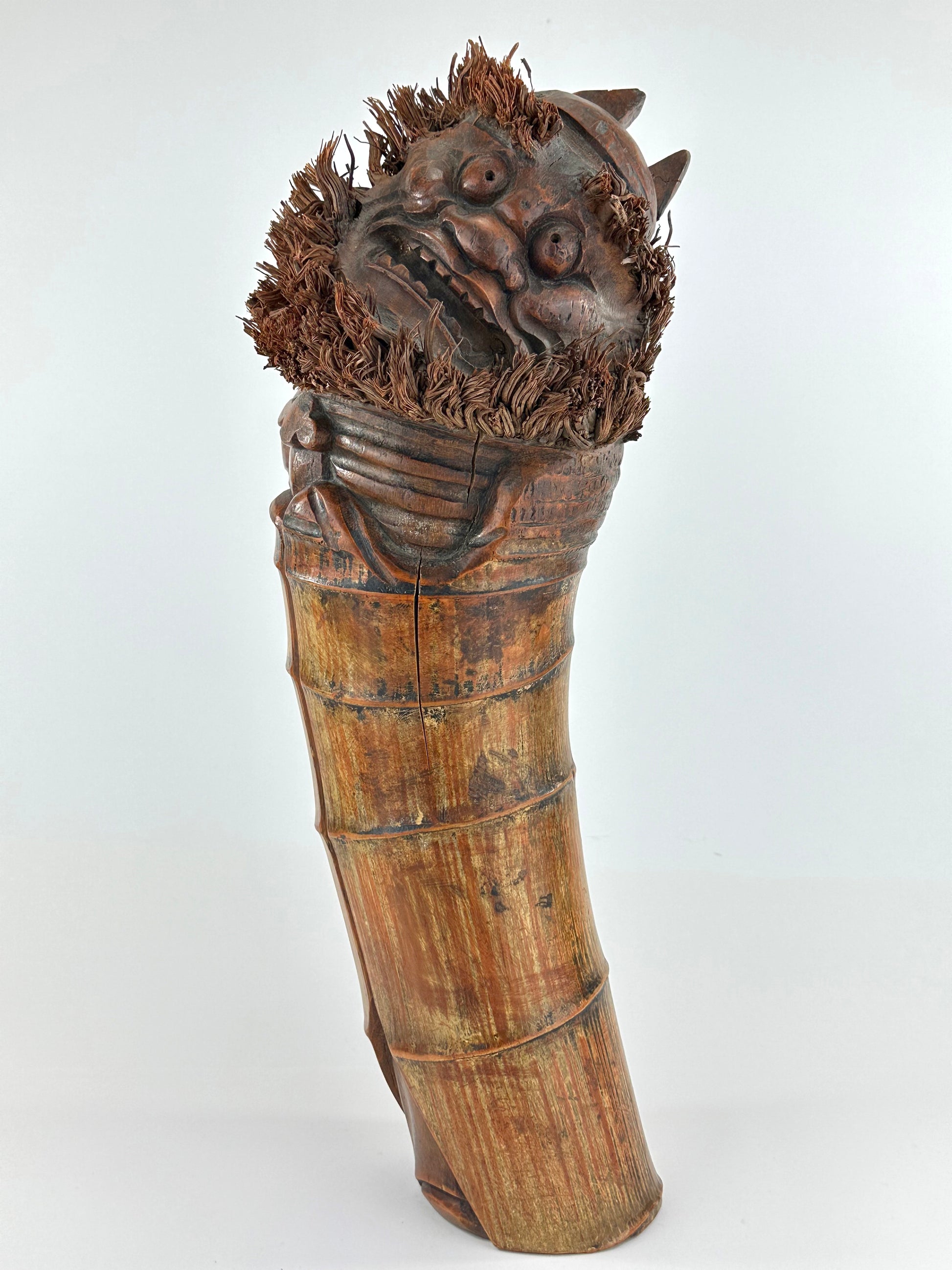A dynamic example of Japanese folk carving, celebrating the spiritual endurance and humor of Zen art.