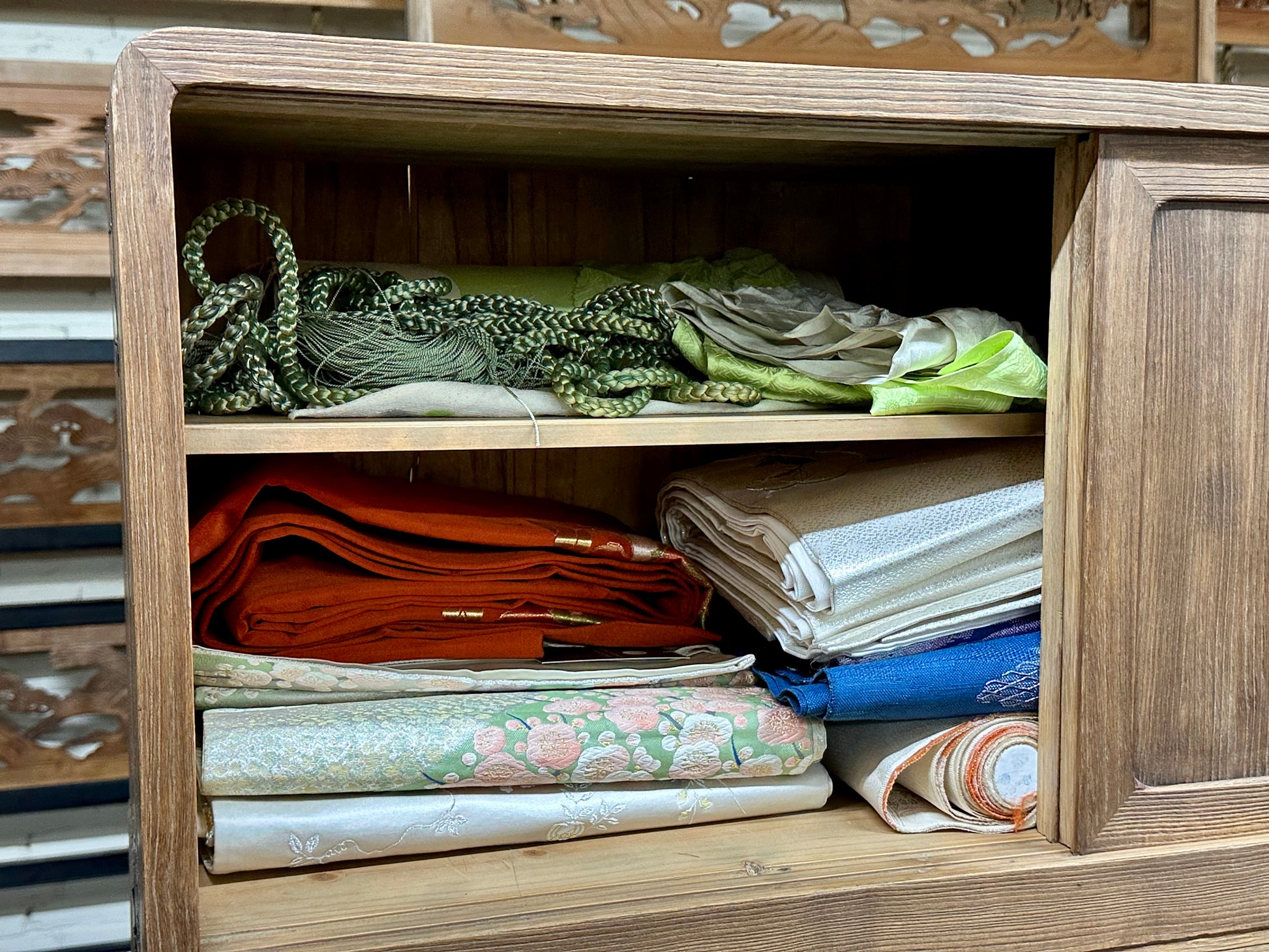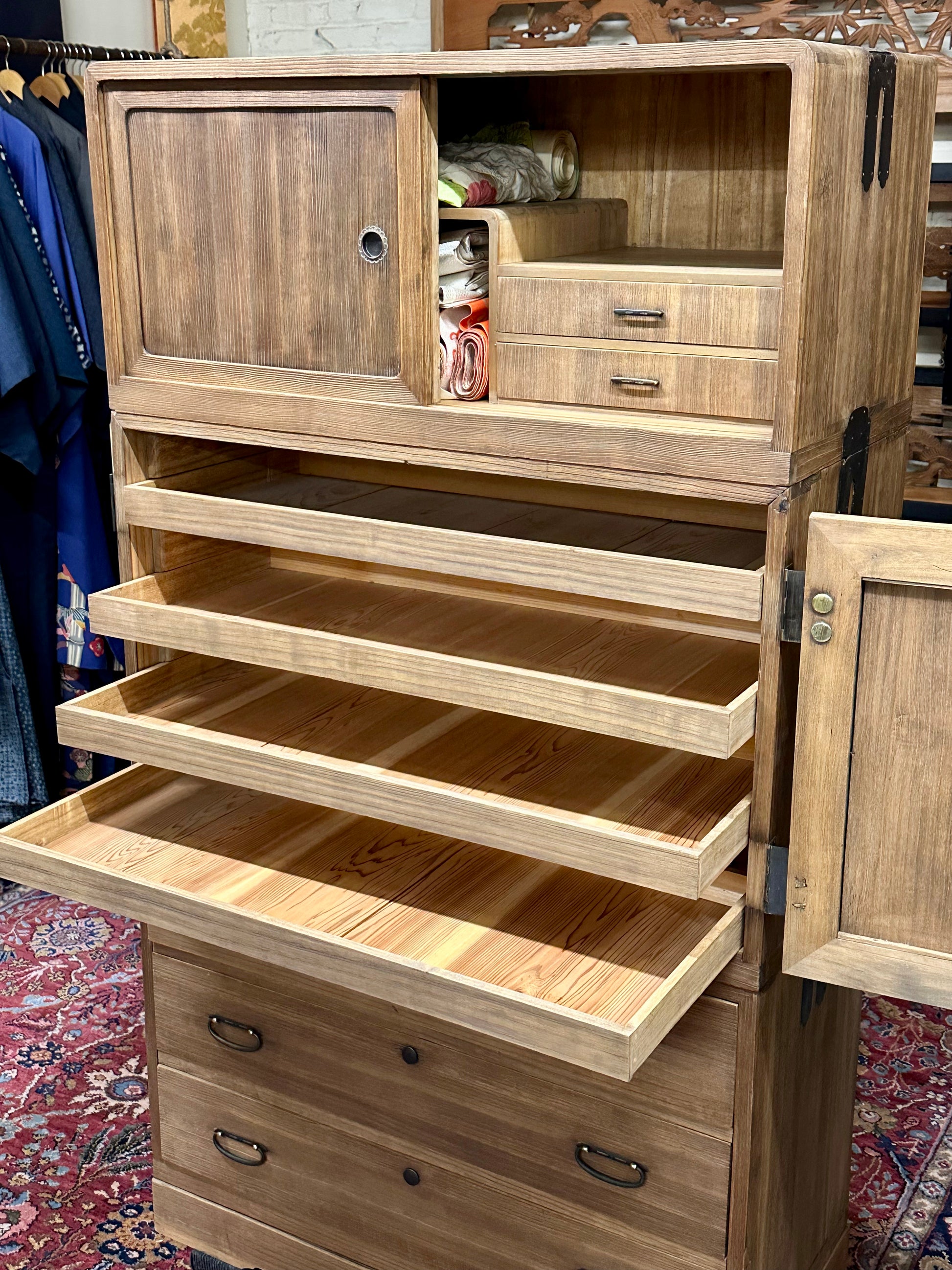 This in an antique Japanese Taisho era c. 1920's three piece clothing chest or Ishodansu. Designed originally for kimono, obi and accessories. In all there are 5 drawers in two sizes, one cabinet with sliding doors and another with three pullout shelves. Made of Kiri wood (paulownia) on the face and exterior case is made with sugi (Japanese cedar) on the interior.