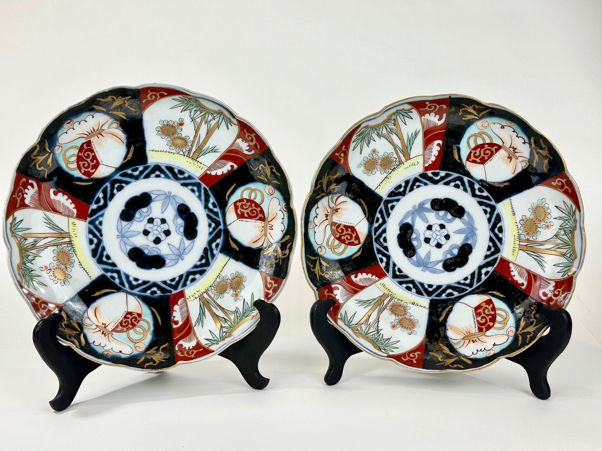 Various traditional hand painted motifs adorn each plates including bamboo and lucky money bags.