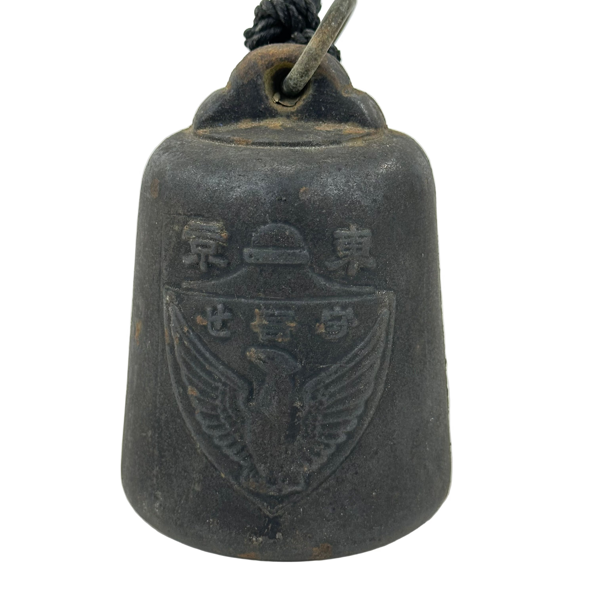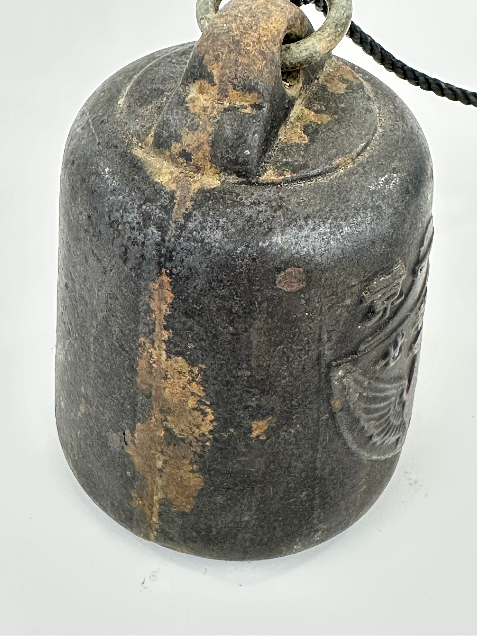 This is an antique Japanese balance scale (hakari) weight dating to the late Edo to Meiji Era (1800-1912). It has Japanese writing on one side. It is bell shaped with a lanyard ring at the top to adjust up and down a pole scale. Decorated with an Phoenix motif.