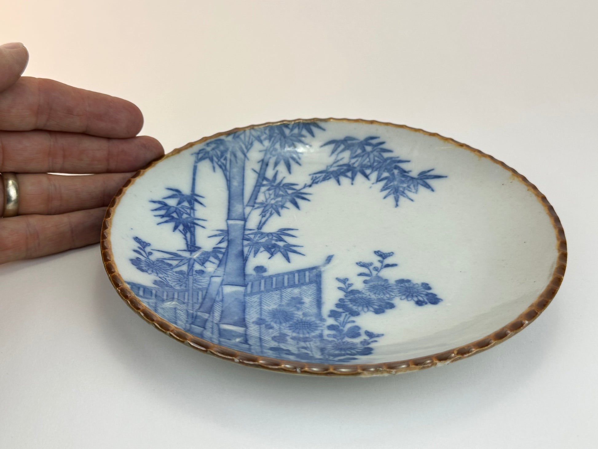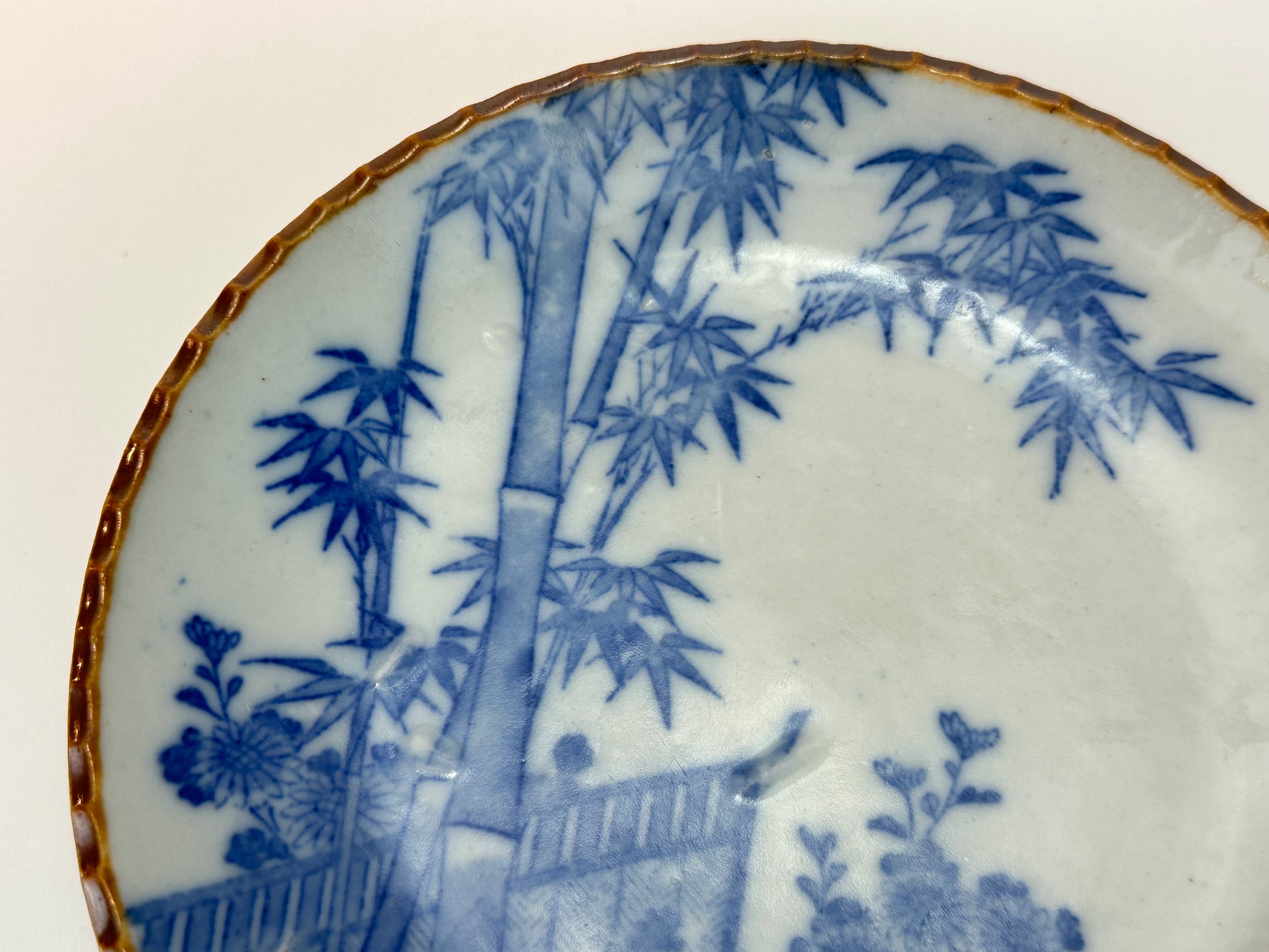 Antique Japanese Imari Blue and White Scalloped Bowl Bamboo Garden Scene 7.25"W