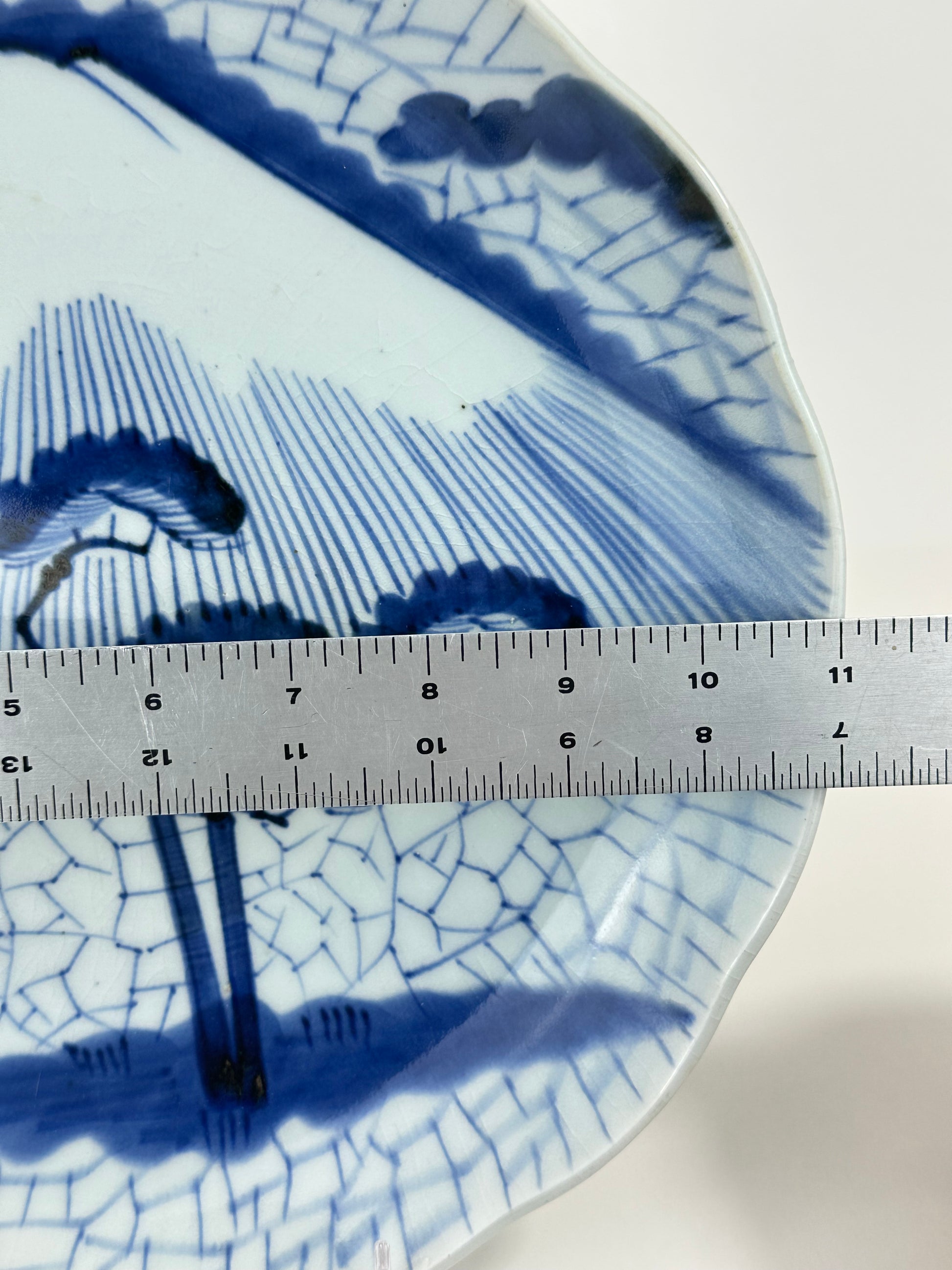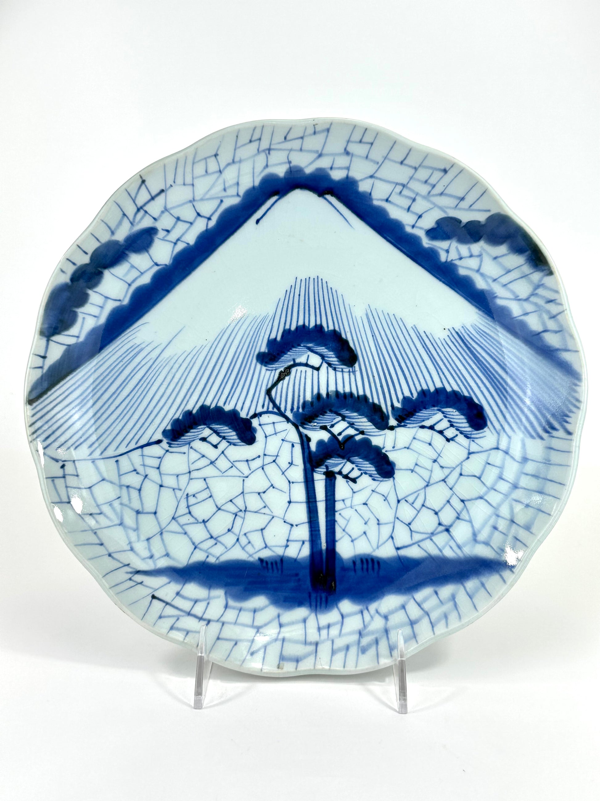This antique Japanese Imari porcelain plate features a classic landscape composition centered on Mount Fuji, rendered in fine linear brushwork and tonal washes of cobalt blue. In the foreground, a windswept pine tree anchors the scene, its layered foliage contrasting with the vertical striations used to define the mountain’s slopes. A stylized cloud band and cracked-ice style ground pattern frame the composition, creating depth and visual rhythm.