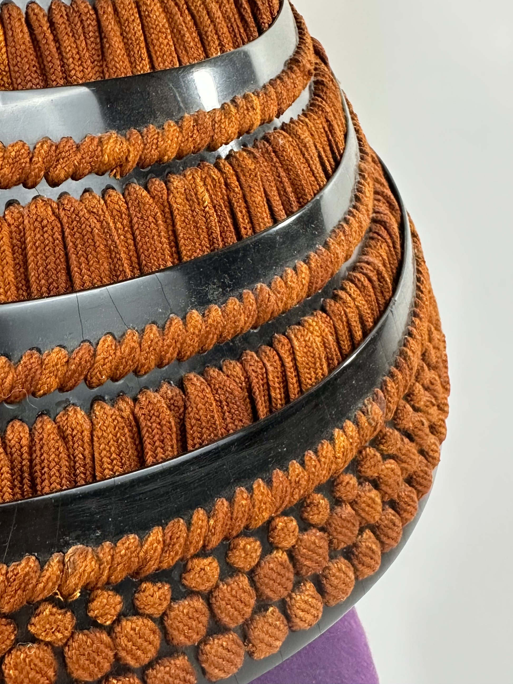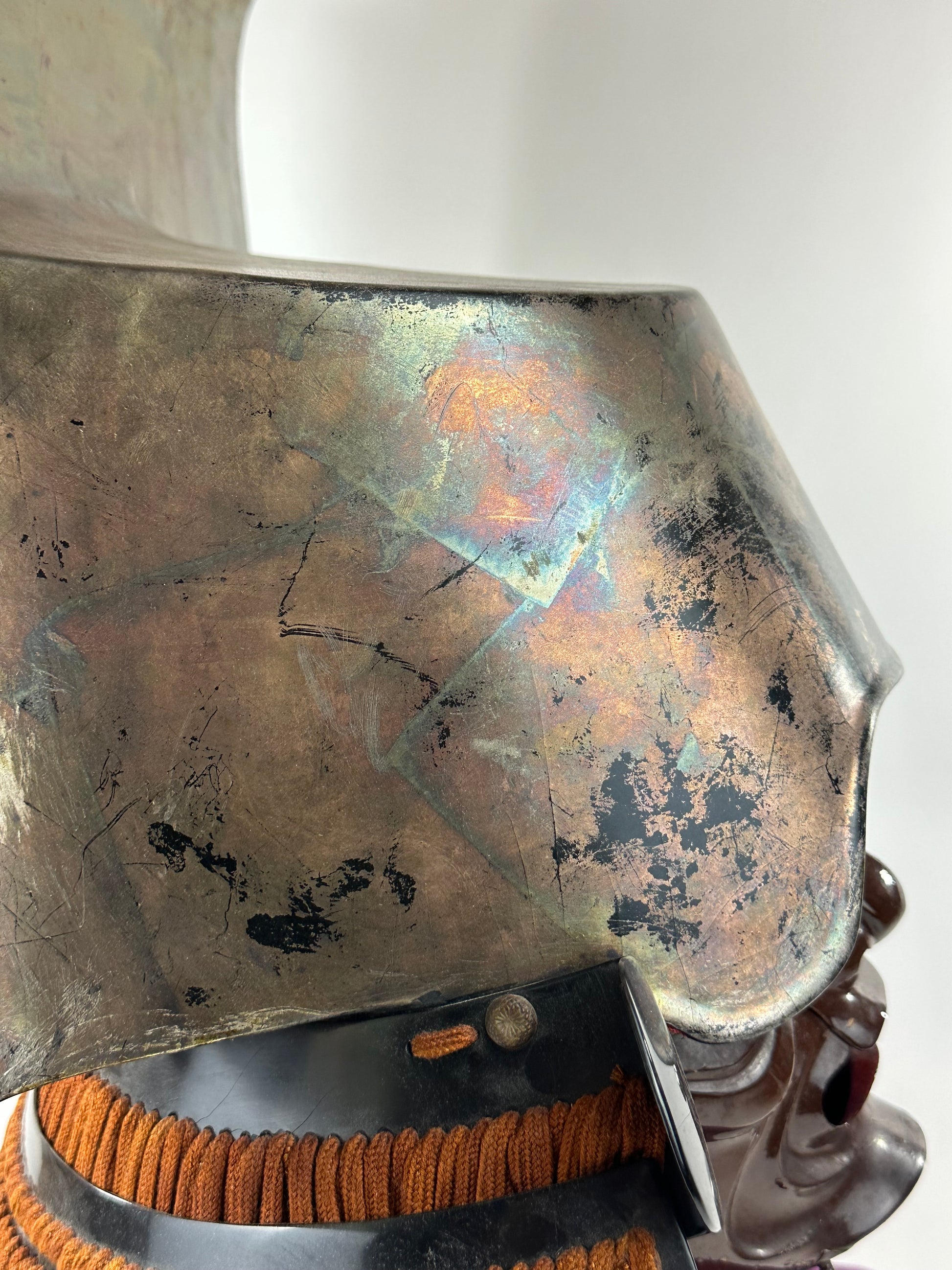 Unlike conventional iron kabuto, this example reflects the period’s experimental use of lighter, highly lacquered wood to create theatrical, visually arresting profiles. While less practical for combat, such helmets were often worn in procession, display, or ceremonial contexts, underscoring the prestige and cultural memory of the samurai who donned them.
