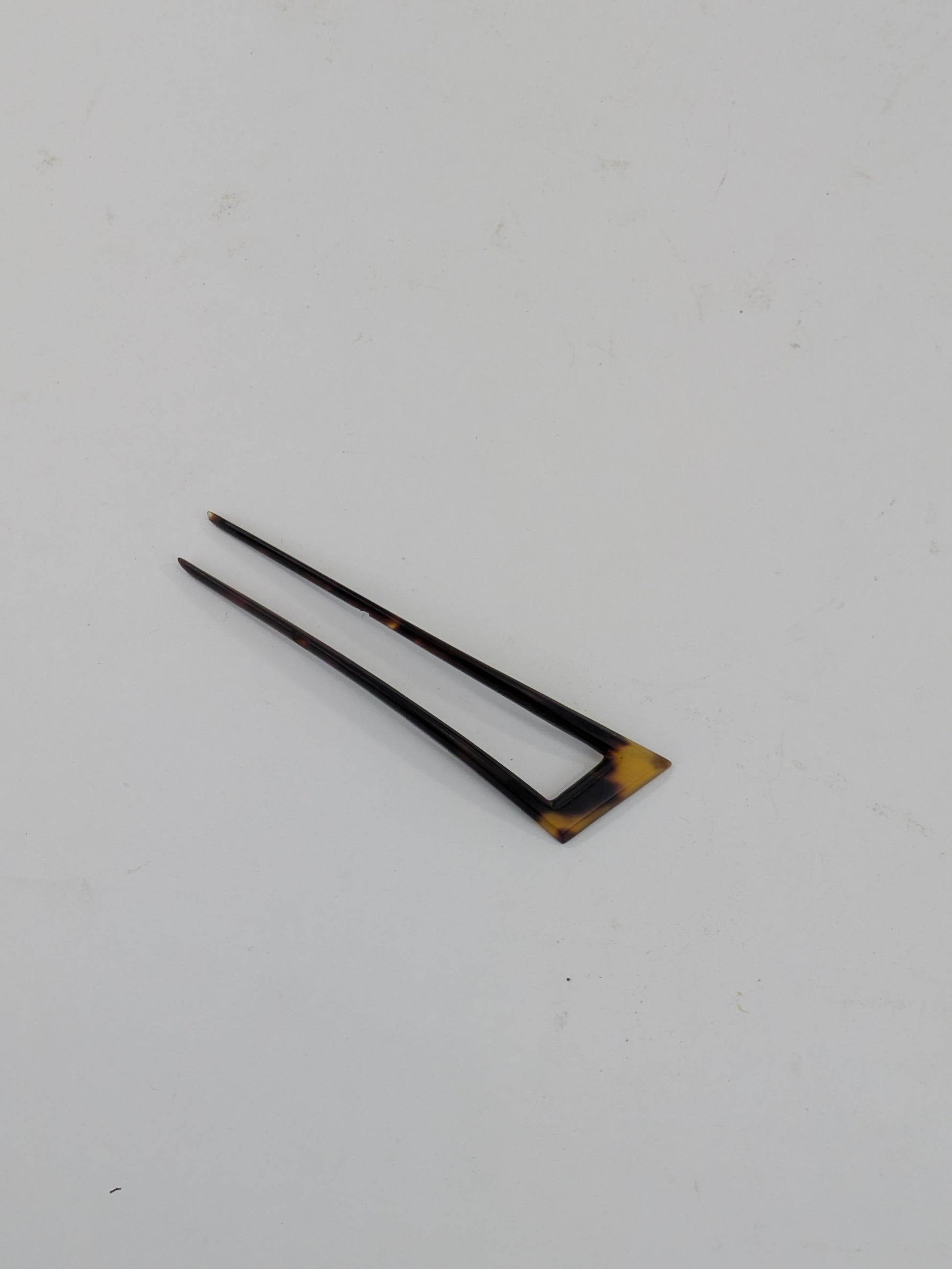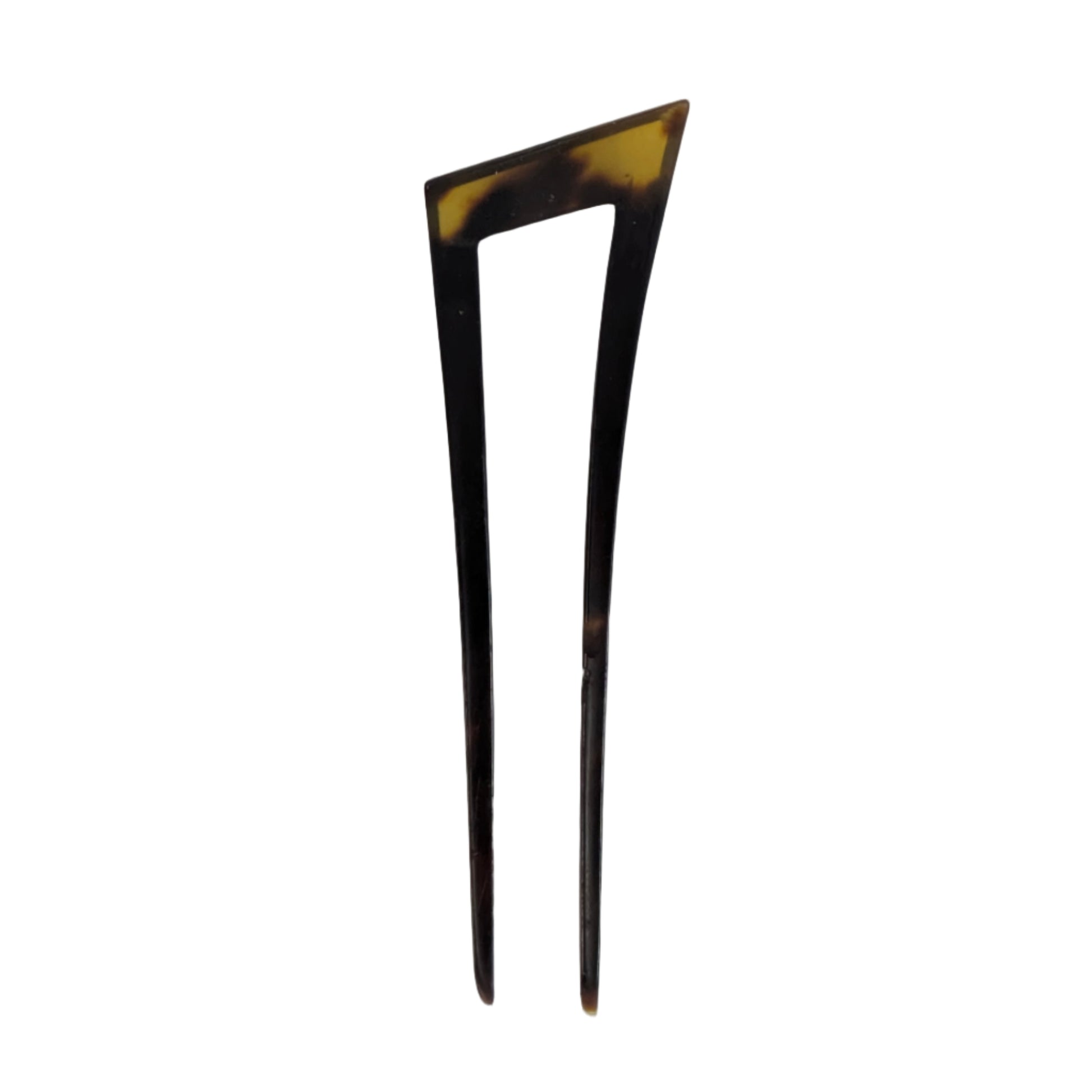 Elegant kanzashi (簪) hairpin of late Meiji to Taishō period design, shaped in a clean geometric openwork form carved from translucent tortoiseshell-patterned resin. The design reflects the refined simplicity that emerged in the early 20th century—where bold silhouette and material clarity replaced the ornate lacquer and makie embellishment of earlier Edo fashions.