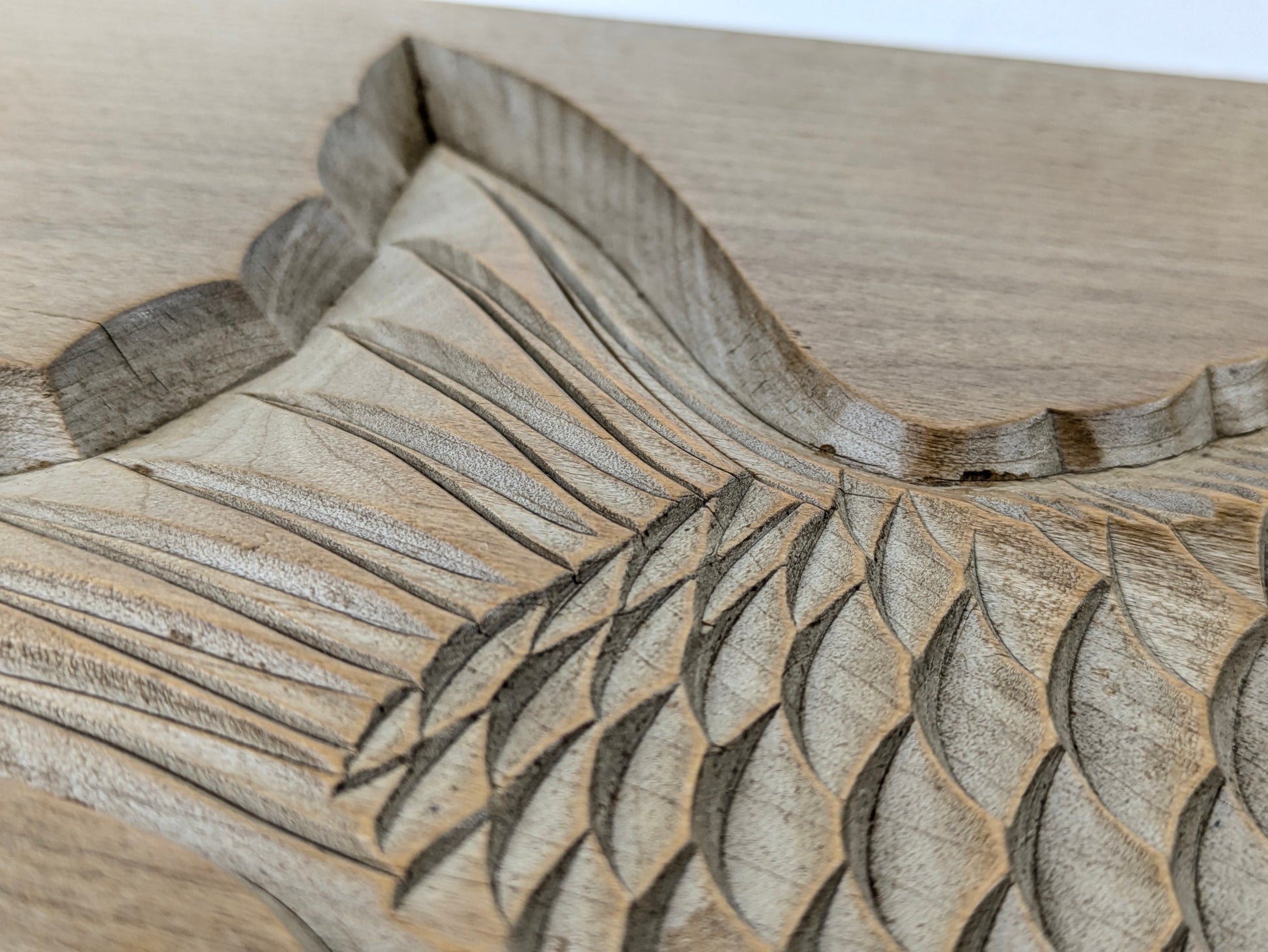 Antique Japanese kashigata wooden confection mold, hand-carved with the detailed form of a tai (sea bream), an auspicious symbol of good fortune and celebration. Measuring an unusually large 19" x 8", this mold was used for pressing sugar sweets (wagashi) for festive occasions such as weddings, New Year, and shrine offerings.