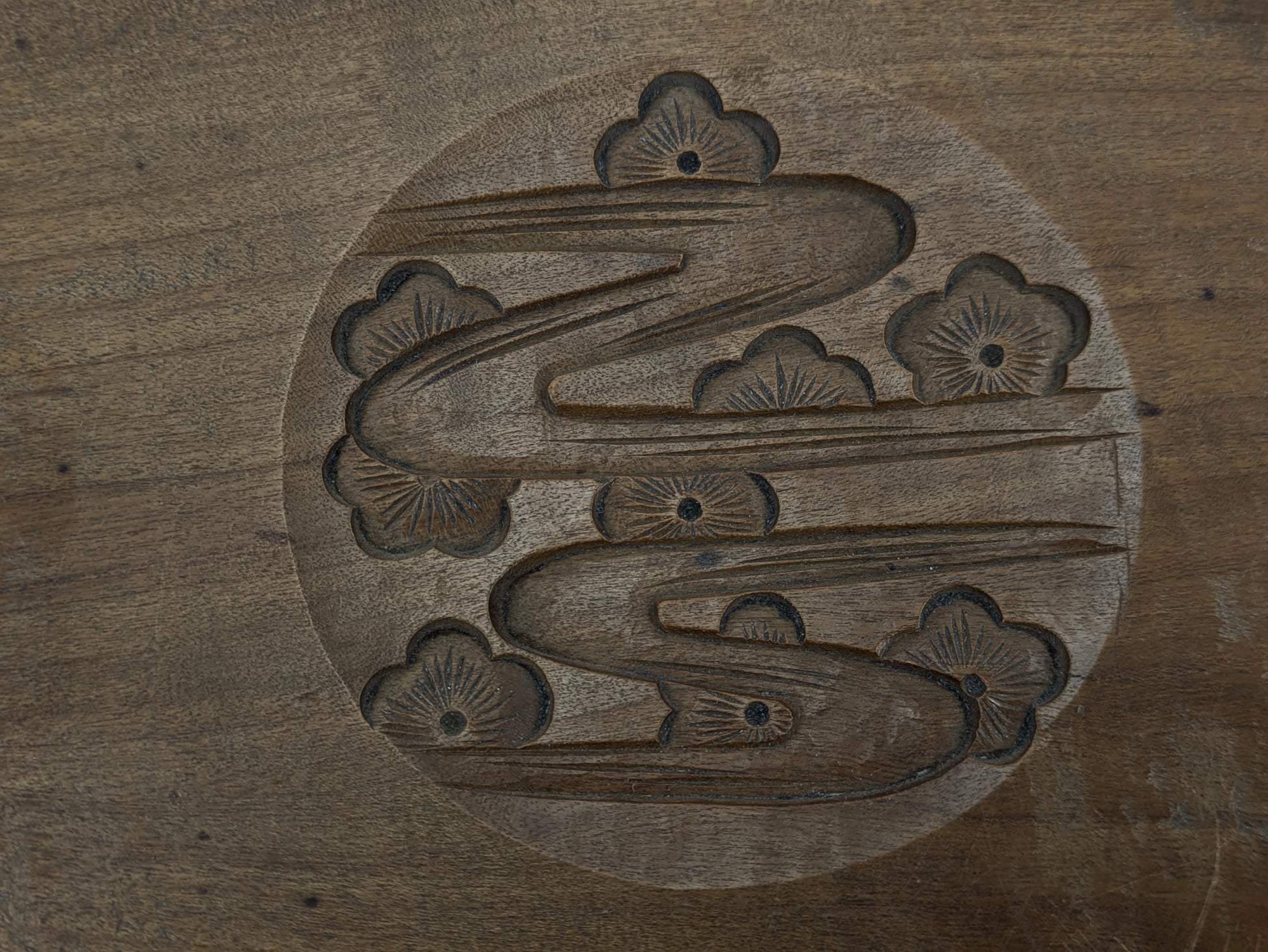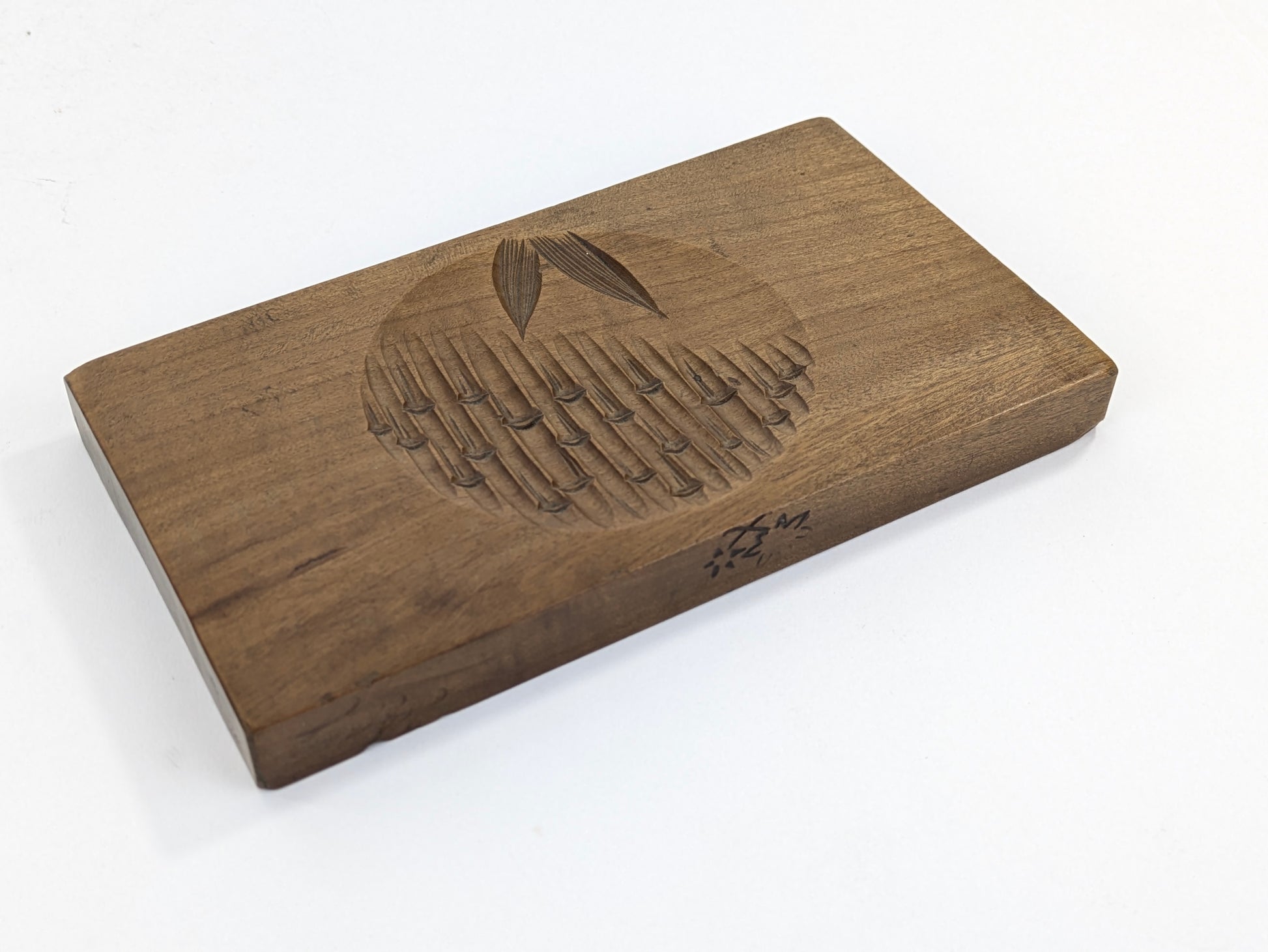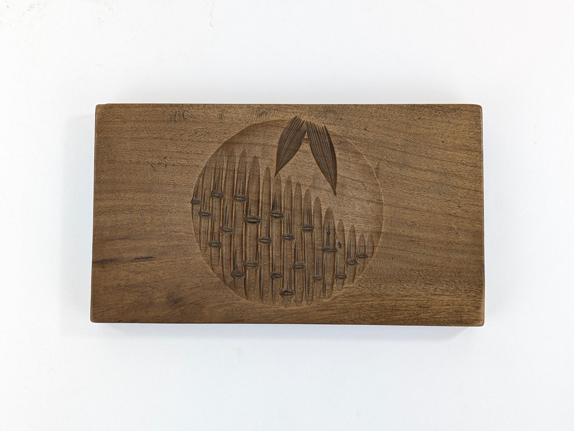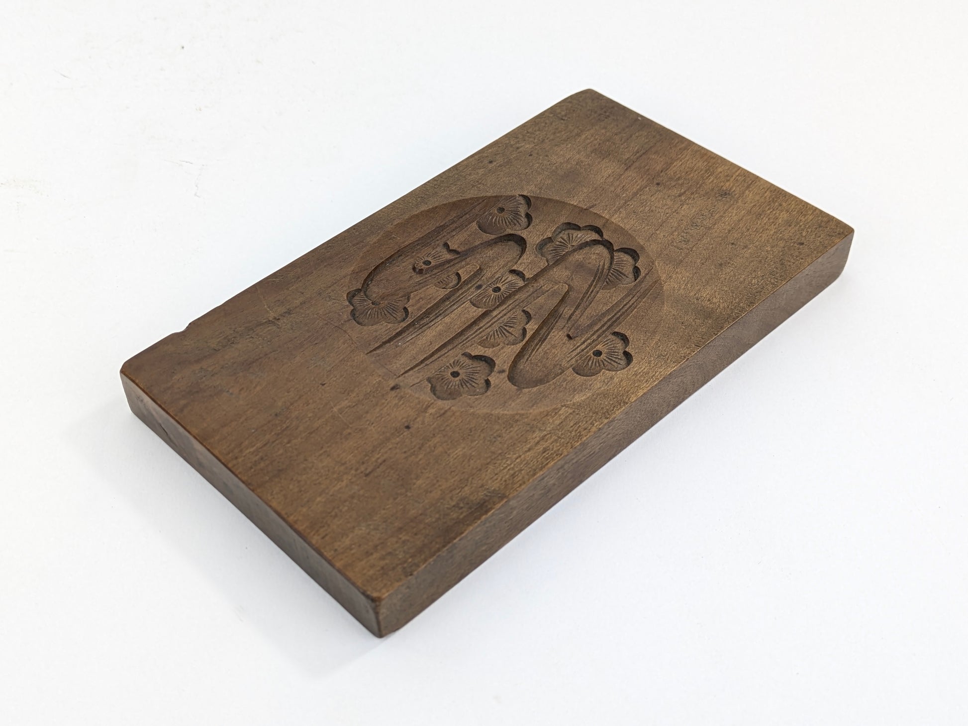 Carved from fine hardwood with crisp detail and a warm aged patina, this mold reflects the artistry and symbolism of Japanese confectionery traditions. Likely dating to the Meiji–Taisho period (late 19th–early 20th century), it remains a wonderful piece for collectors of Japanese folk crafts, tea ceremony utensils, or culinary antiques.