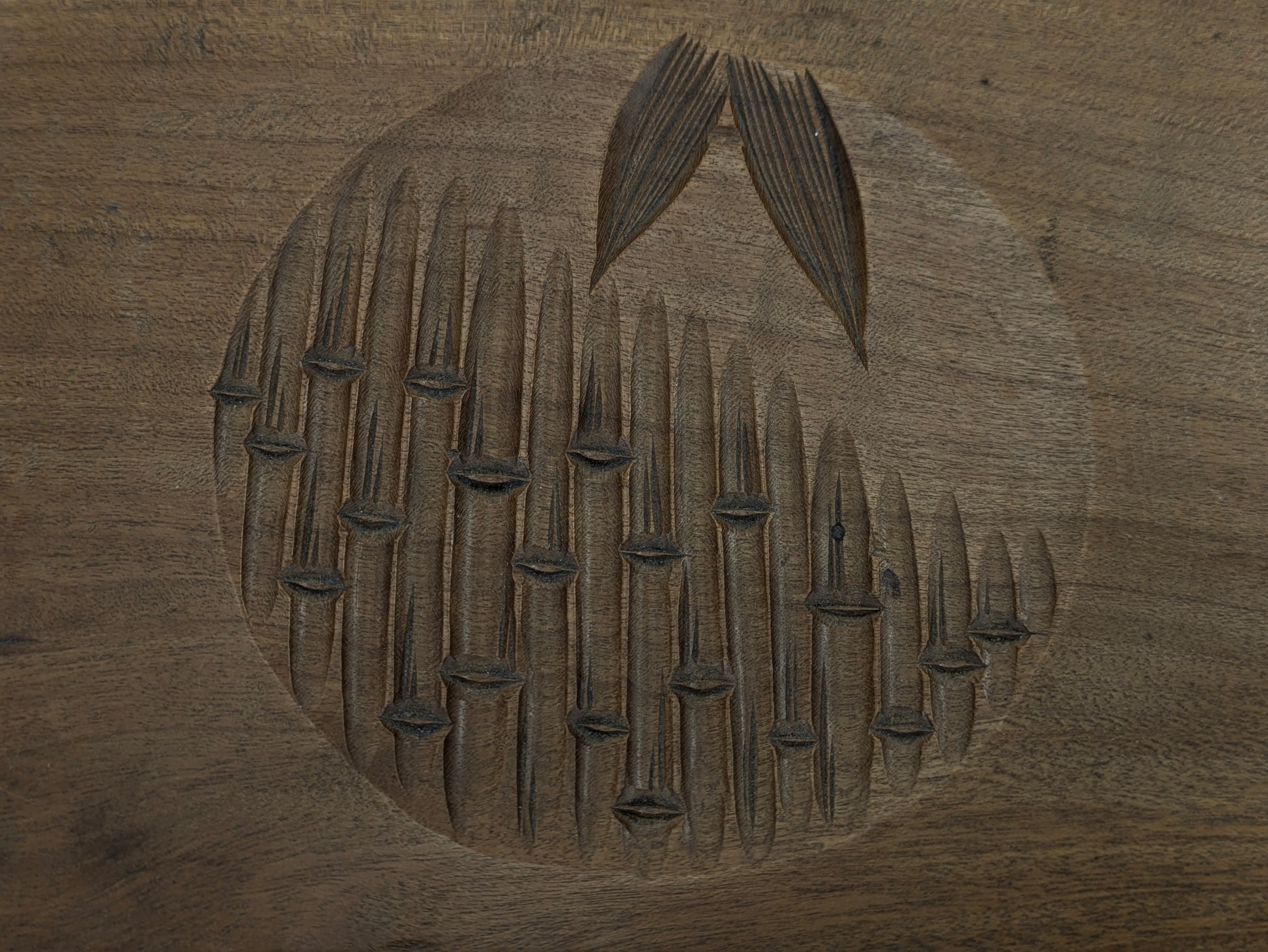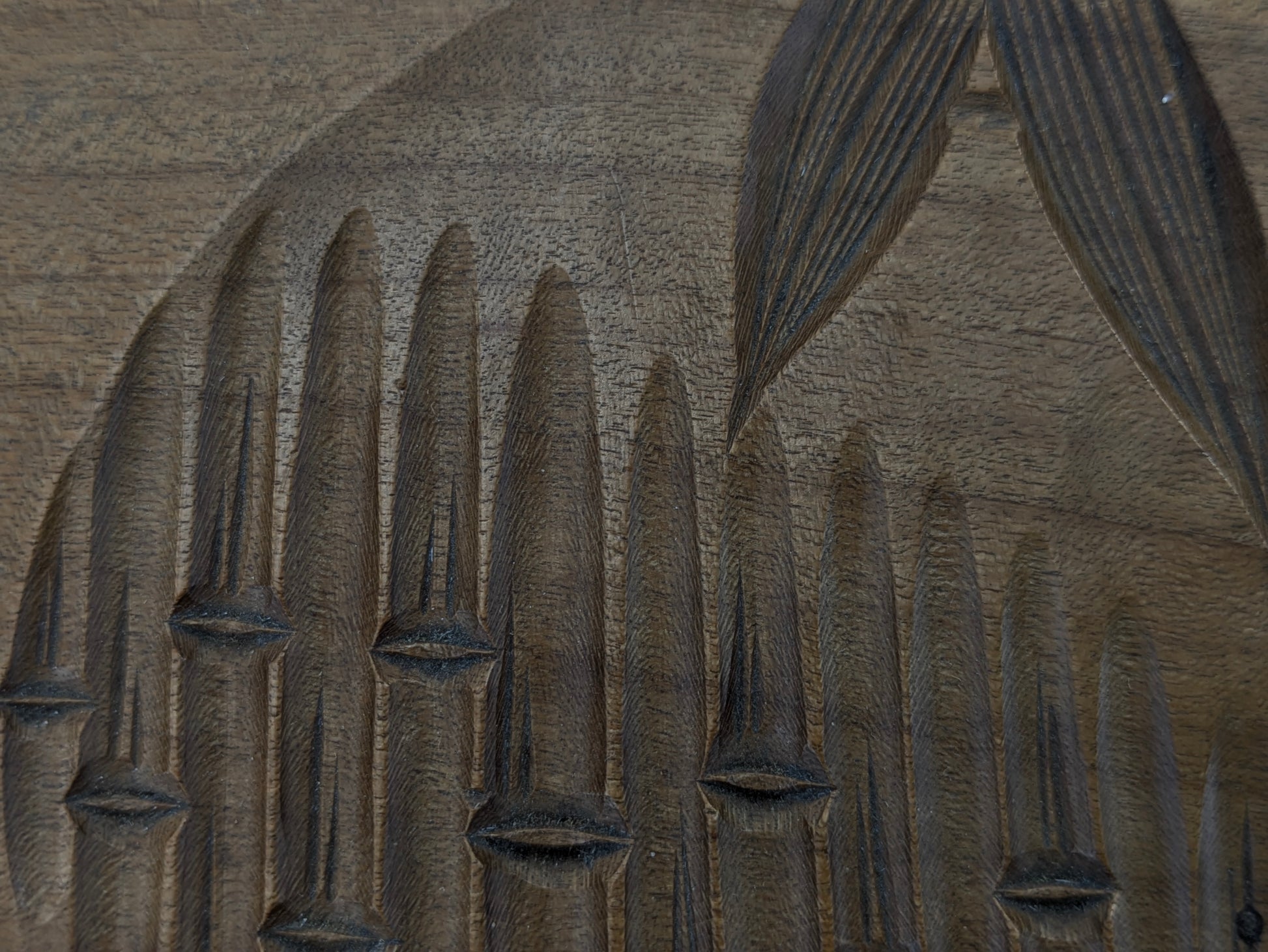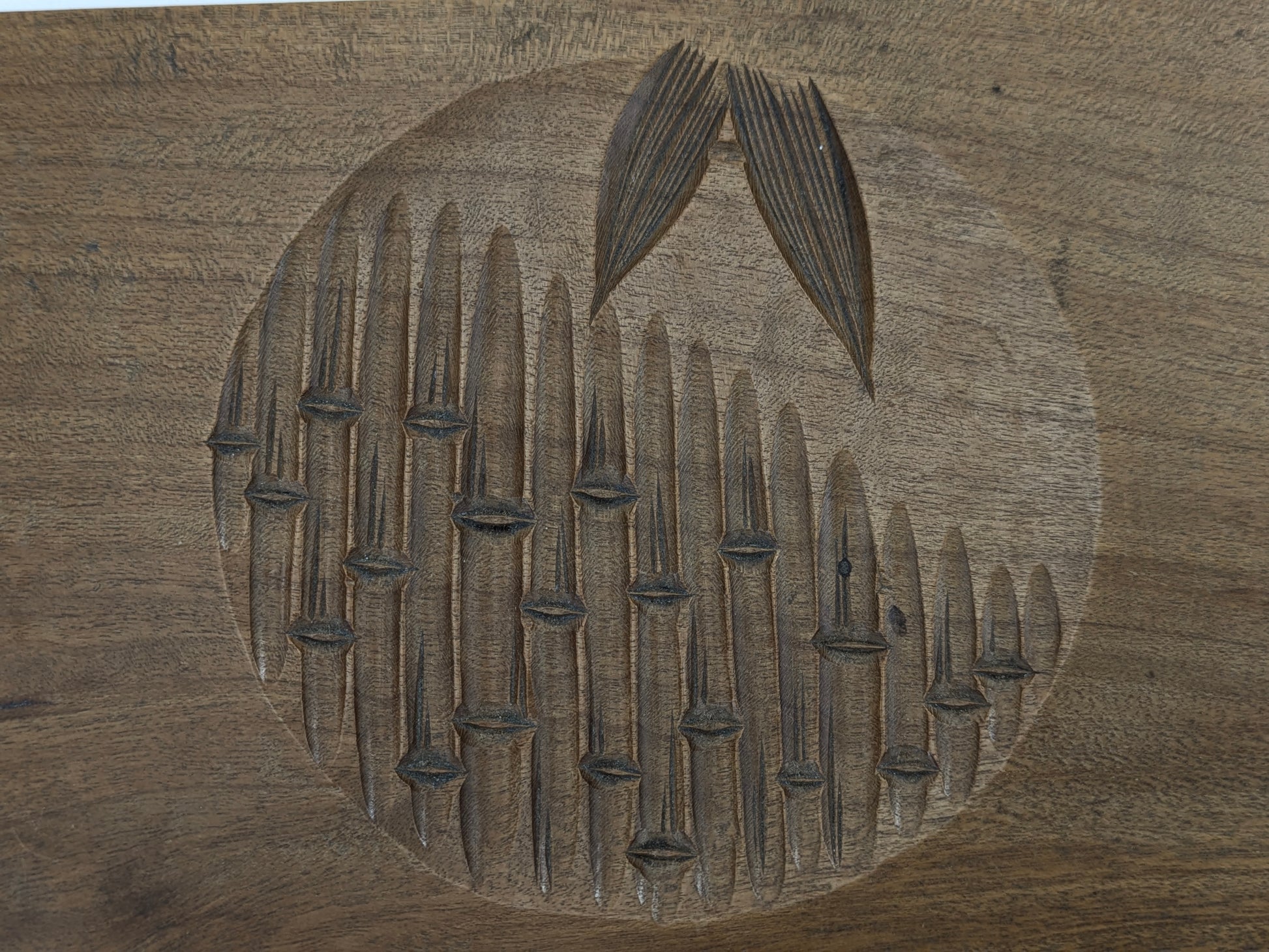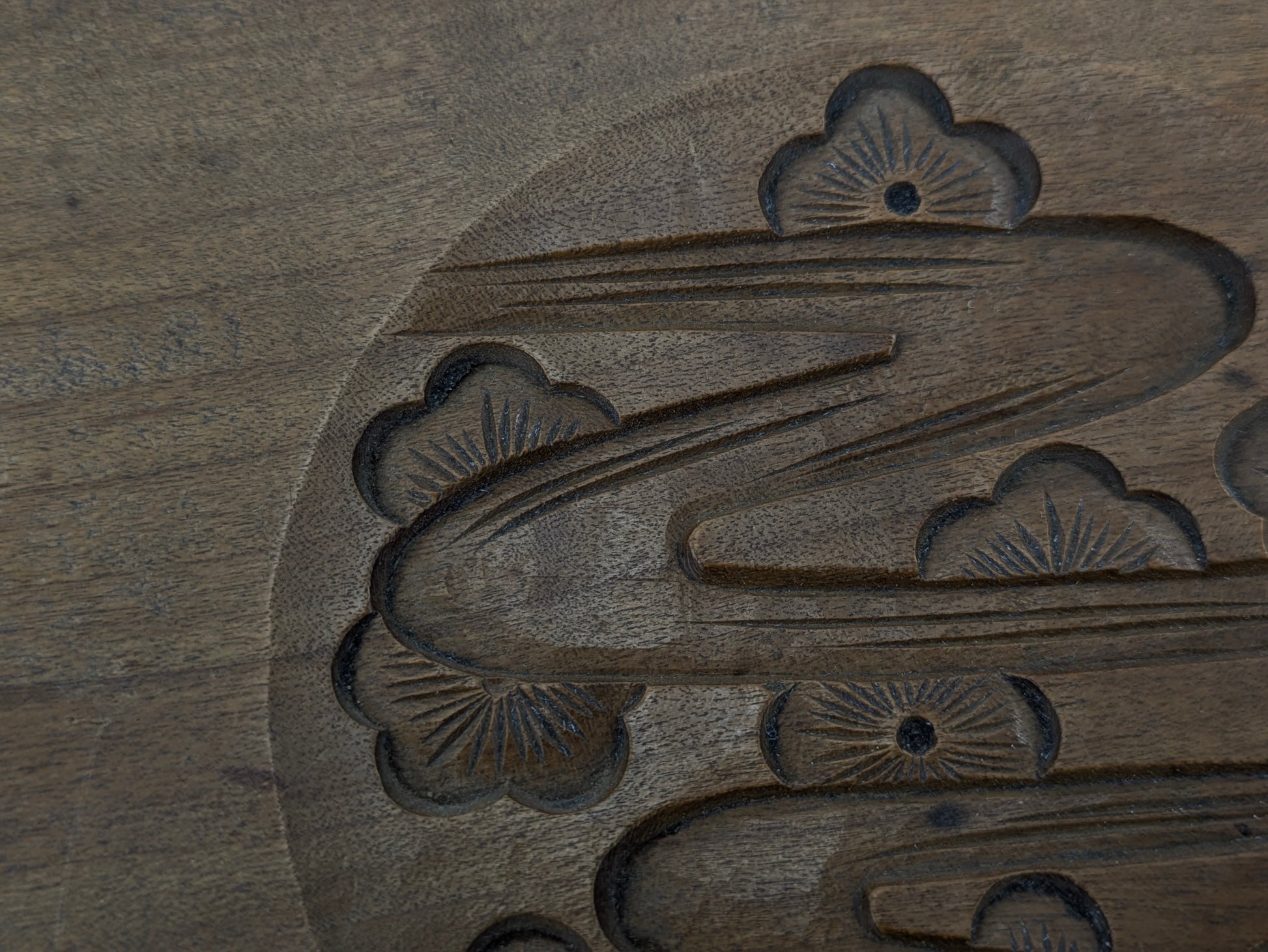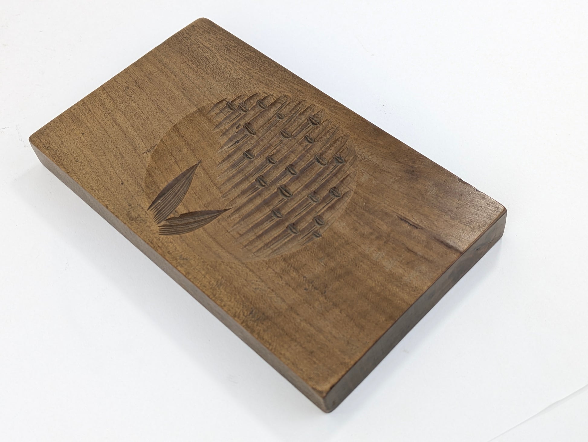 Carved from fine hardwood with crisp detail and a warm aged patina, this mold reflects the artistry and symbolism of Japanese confectionery traditions. Likely dating to the Meiji–Taisho period (late 19th–early 20th century), it remains a wonderful piece for collectors of Japanese folk crafts, tea ceremony utensils, or culinary antiques.