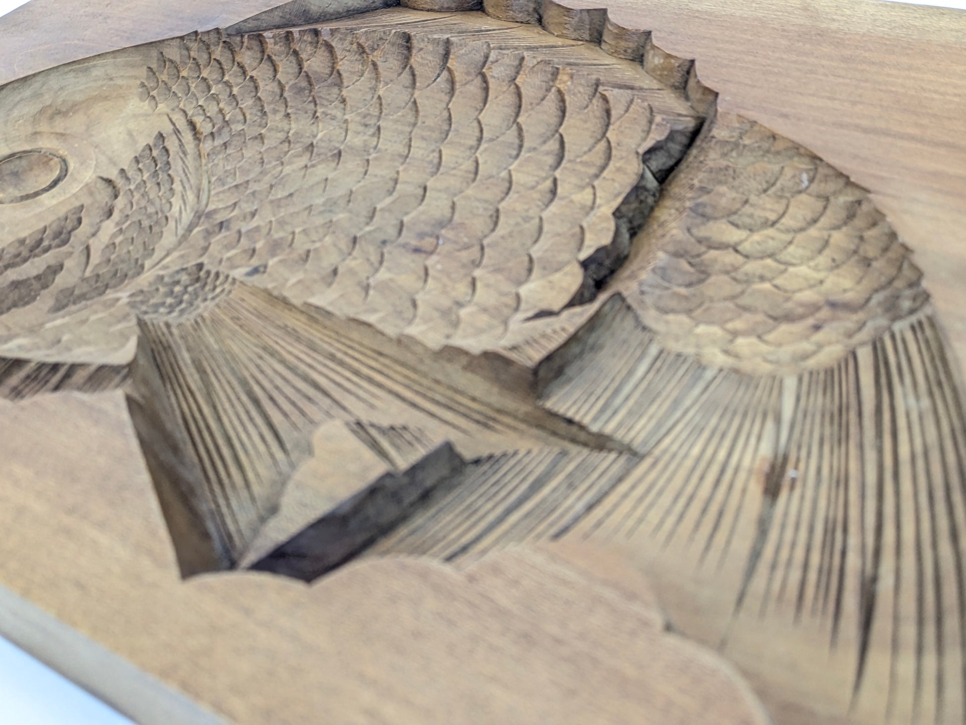 Large and finely carved kashigata (菓子型) confectionery mold used for shaping wagashi sweets. The design features a detailed tai (sea bream) with bold scales, fins, and expressive eye. In Japan, tai is an auspicious fish, its name echoing the word “medetai” (auspicious, joyful). Such imagery is traditionally associated with good fortune, prosperity, and celebration, especially for weddings and New Year.