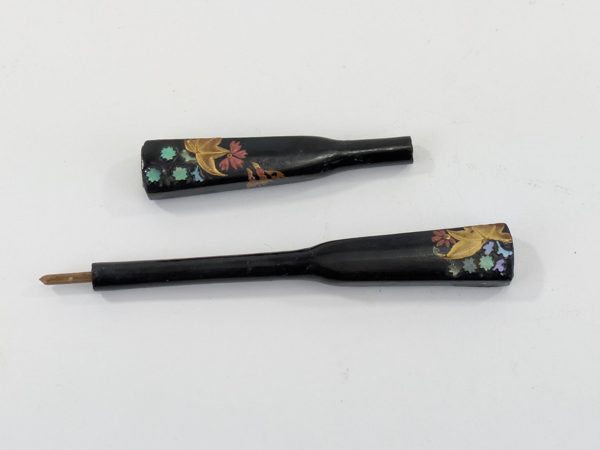 A graceful expression of late 19th-century craftsmanship, uniting lacquer artistry, shell inlay, and symbolic design in a single refined personal accessory.