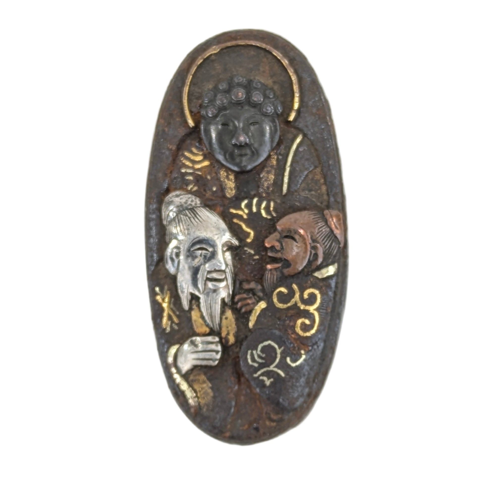 An outstanding 19th century Edo period Japanese kashira (pommel fitting at the end of a sword hilt), crafted in iron with exquisite mixed-metal inlay. The design depicts the famous Chinese allegory of the Vinegar Tasters, showing the three great sages — Confucius, the Buddha, and Lao-Tze — gathered around a vat of vinegar.
