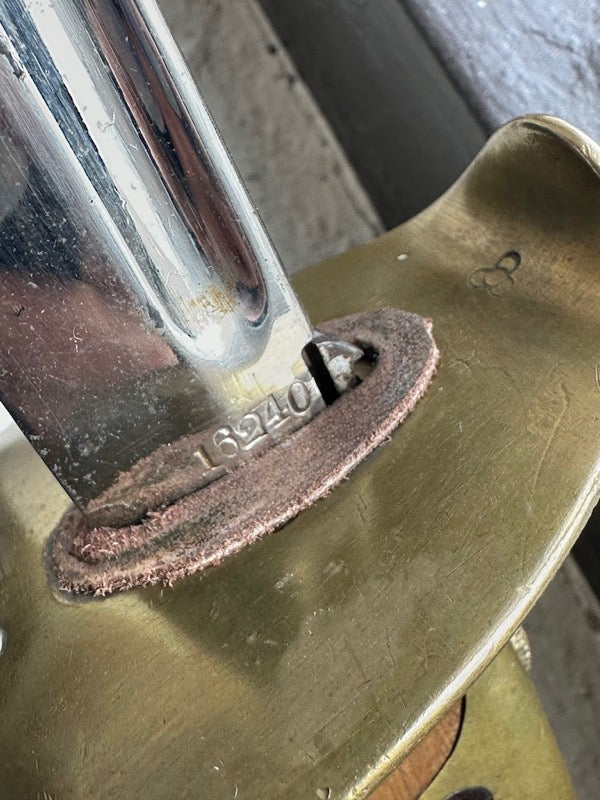 An authentic Imperial Japanese Type 25 cavalry sabre manufactured by the Tokyo Artillery Arsenal for non-commissioned officers and enlisted troopers. The sword is a late production example, blade serial no. 16240, carrying the Tokyo Arsenal “four cannonballs” inspection stamp on the guard—a mark applied only from 1896 to 1899. Based on specialist research, the stamp appears on numbers roughly 13121–16416, placing this piece near the end of the Type 25 run just before adoption of the Type 32 in 1899. Total production of the Type 25 is believed to have been under 17,000, making stamped late-series examples distinctly rare.