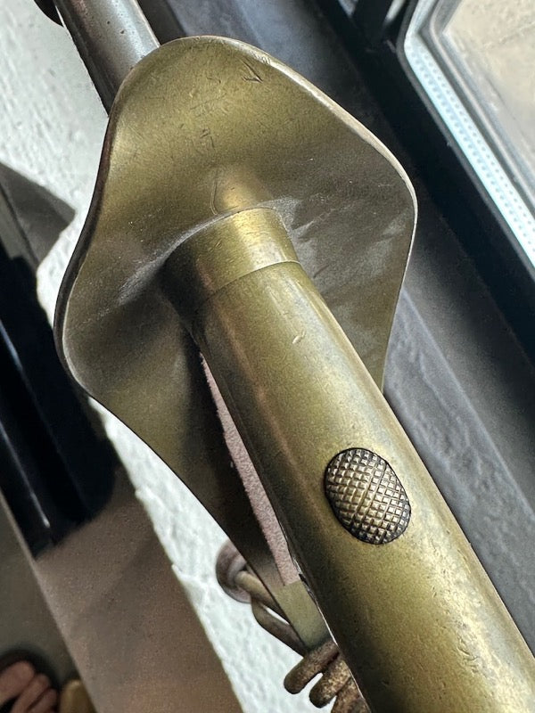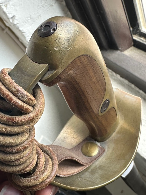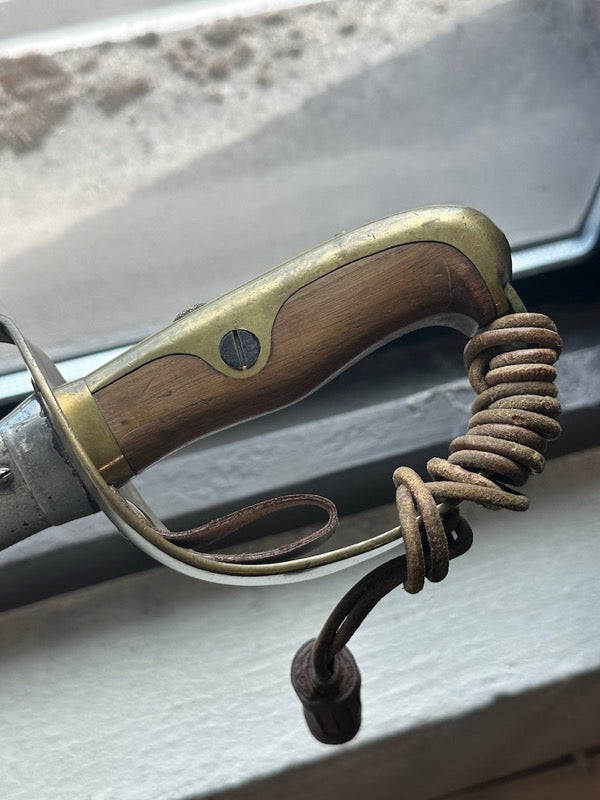 • Construction: steel blade with long fuller; brass guard and brass backstrap with spring-loaded scabbard-lock button; wood grip scales secured by screws and pin-spanner pommel nut; steel scabbard with single suspension ring; leather sword knot present