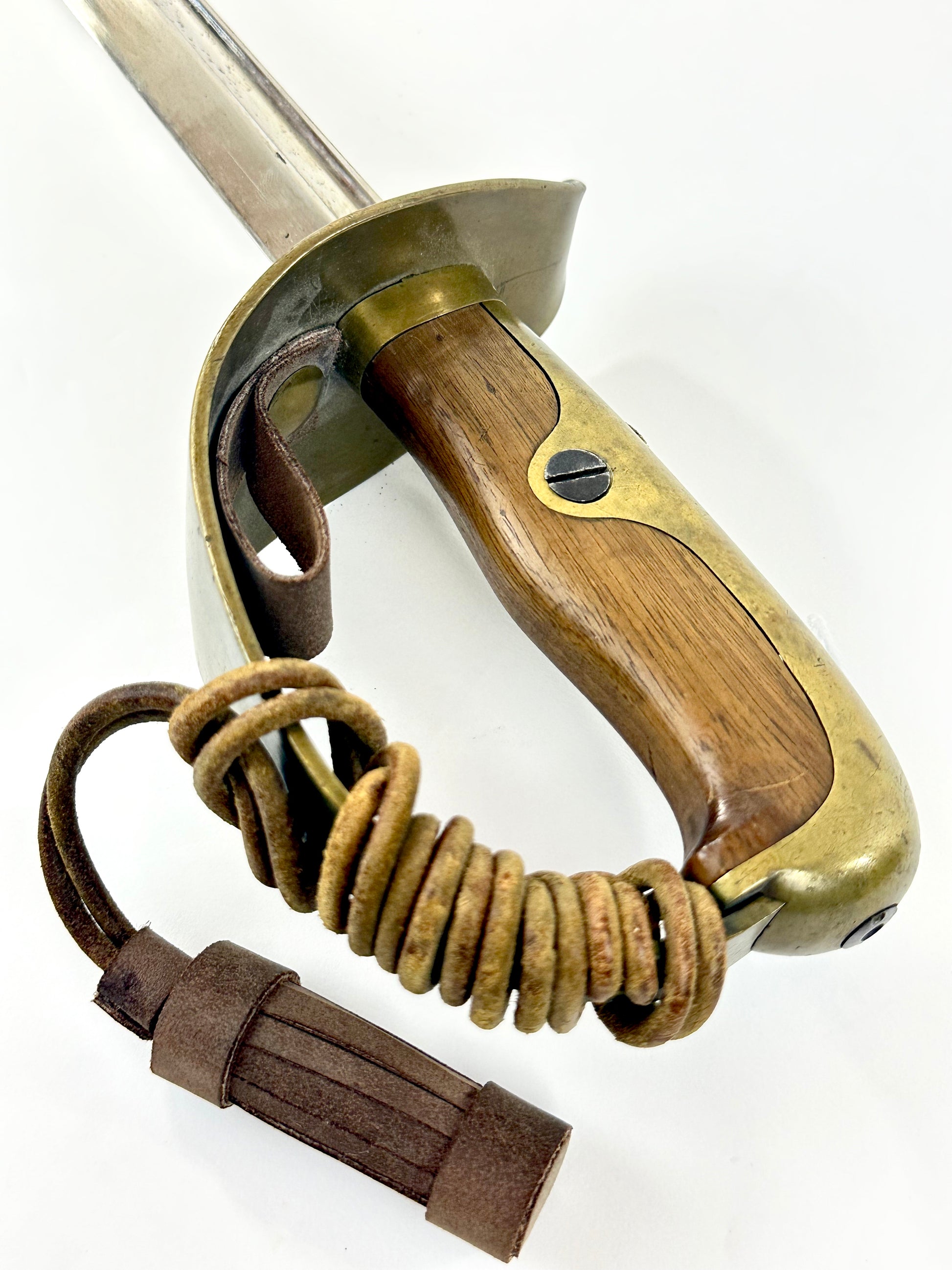 Honest service wear consistent with age; bright blade with scattered marks; brass hilt with pleasing patina; functional spring catch; steel scabbard with ring and period repair/spotting typical of field use. A complete, late-issue example retaining its leather knot.