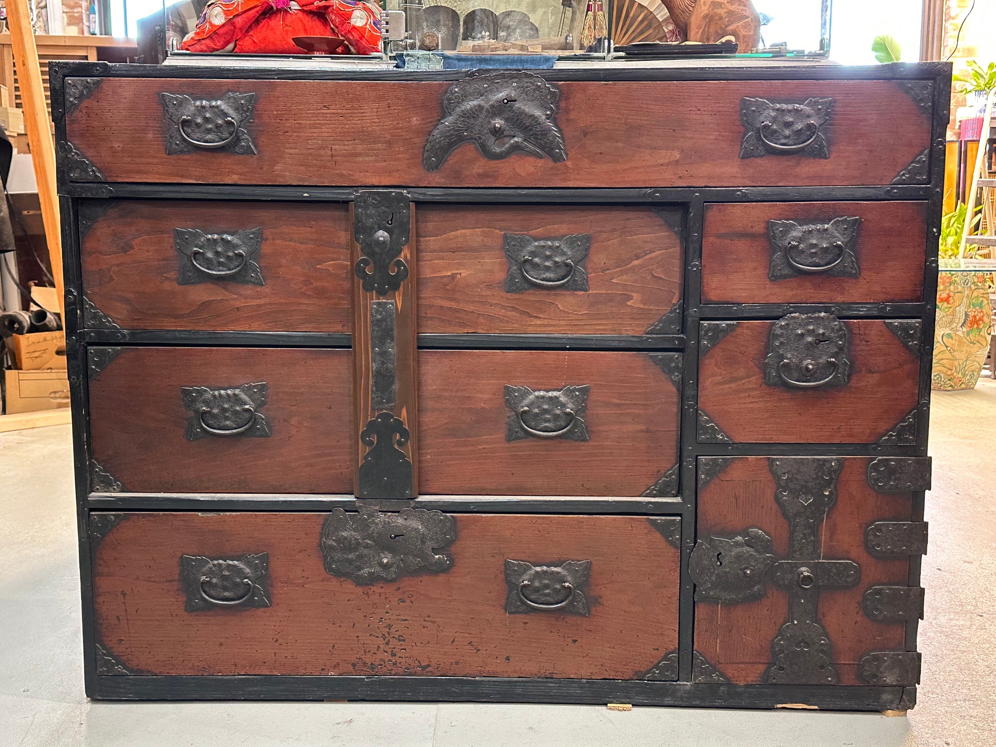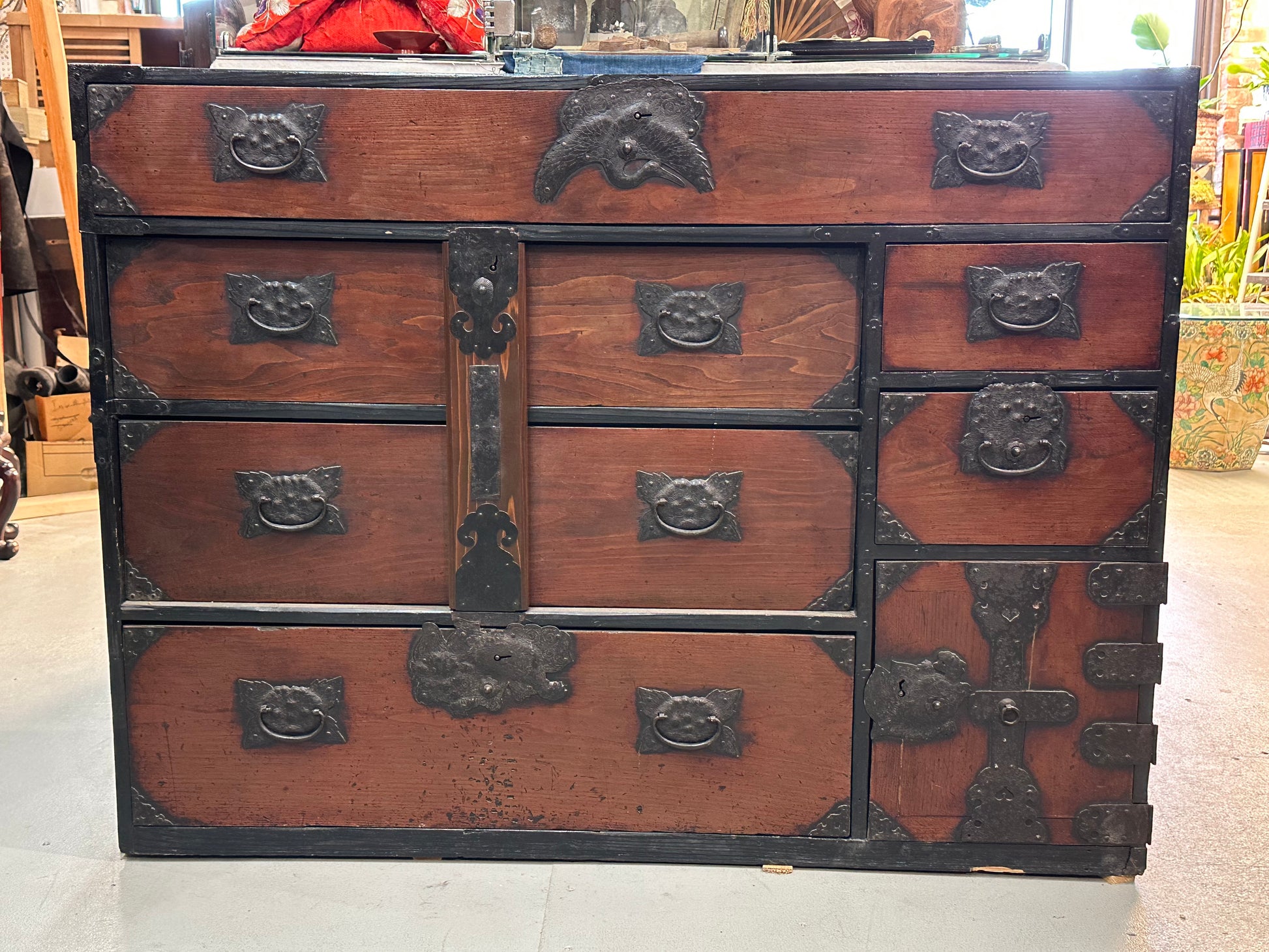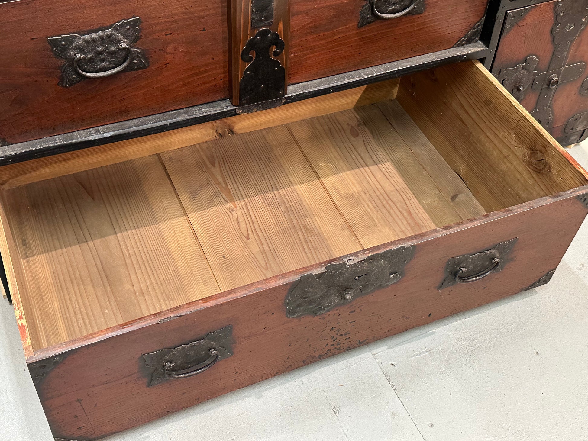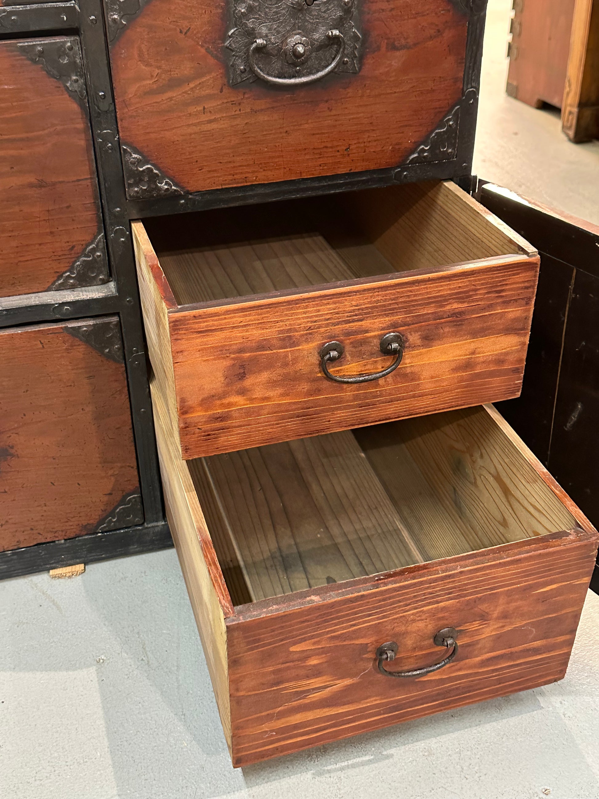 This tansu chest is made with pegged-tenon open-mortise corner box joint construction. IT has all its 150 year old deep rich patina. All drawers and doors move easily without binding. All hardware is hand forged iron with Gumpai style handles and detailed lock plates. Some locks are still operable with included keys. Forged iron side handles aid in transporting this chest even when fully loaded with possessions.