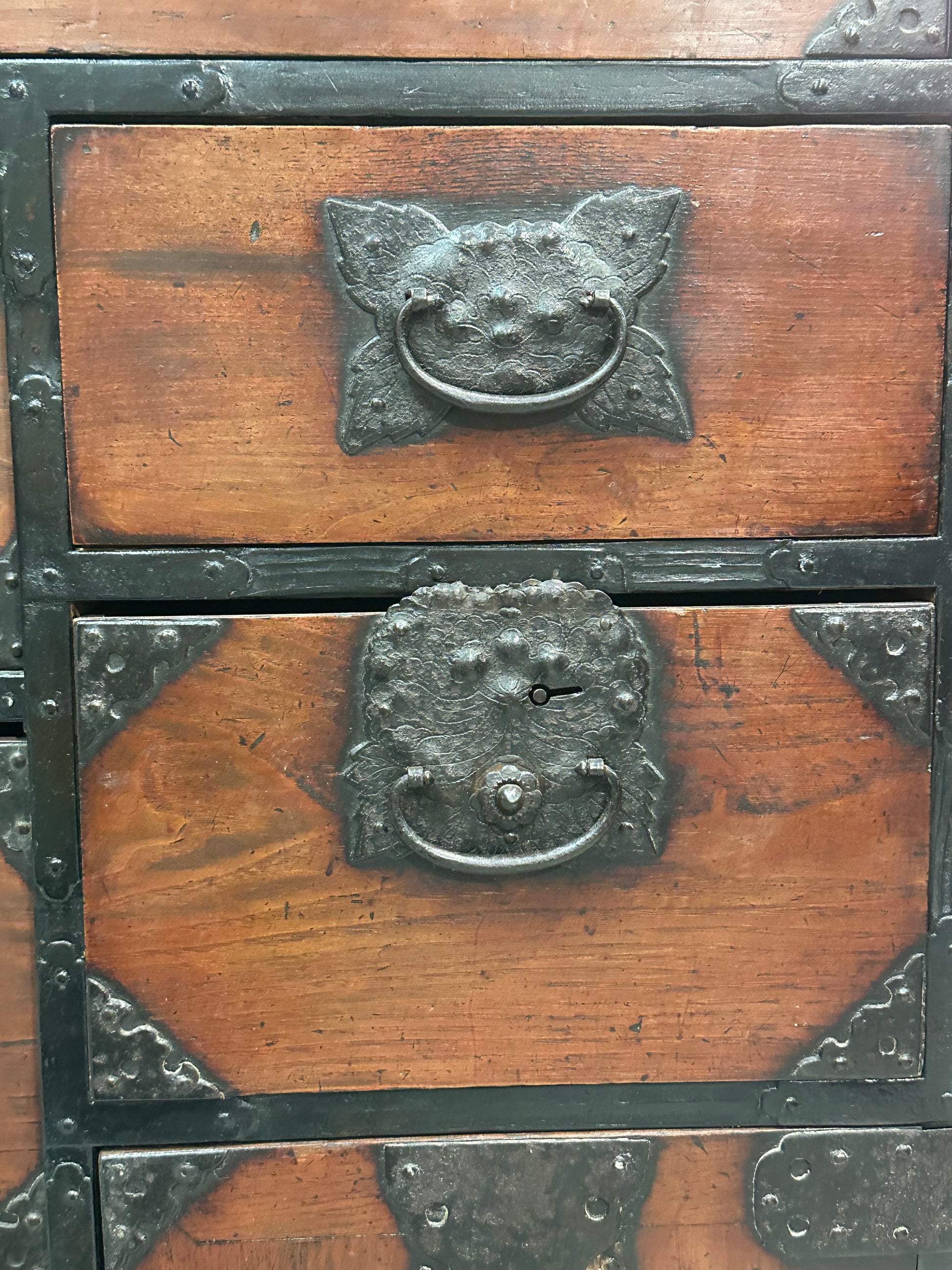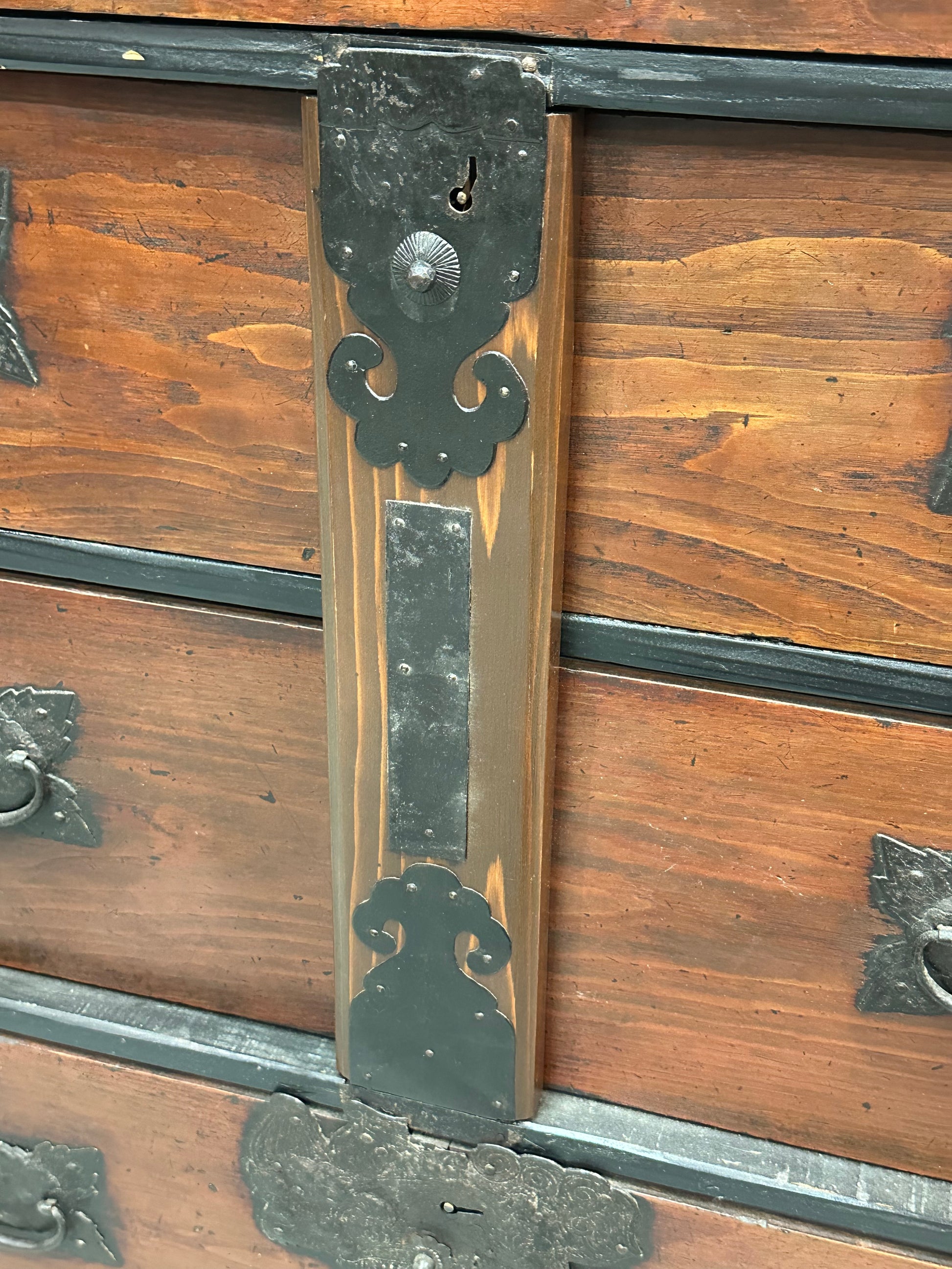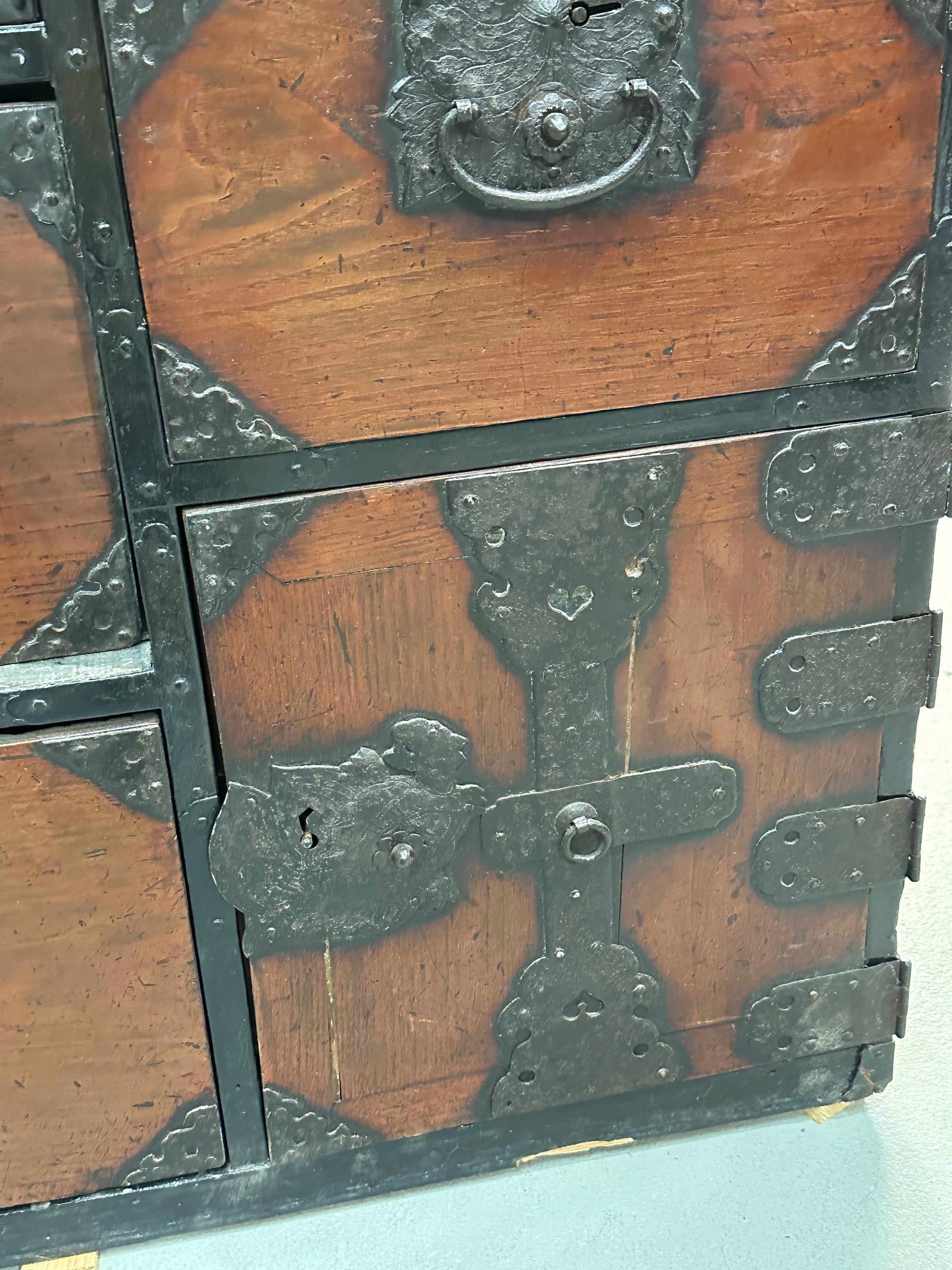 This tansu chest is made with pegged-tenon open-mortise corner box joint construction. IT has all its 150 year old deep rich patina. All drawers and doors move easily without binding. All hardware is hand forged iron with Gumpai style handles and detailed lock plates. Some locks are still operable with included keys. Forged iron side handles aid in transporting this chest even when fully loaded with possessions.