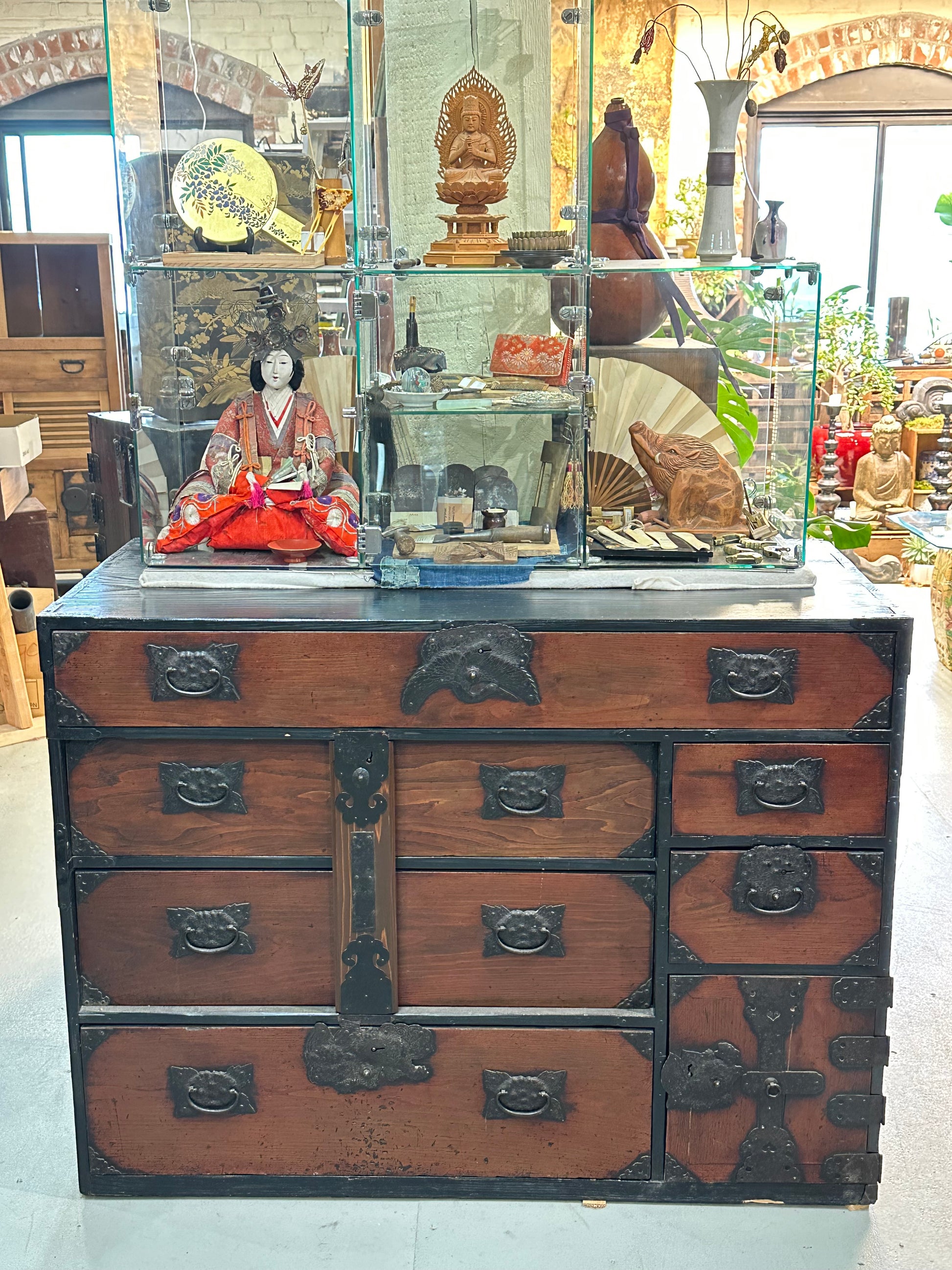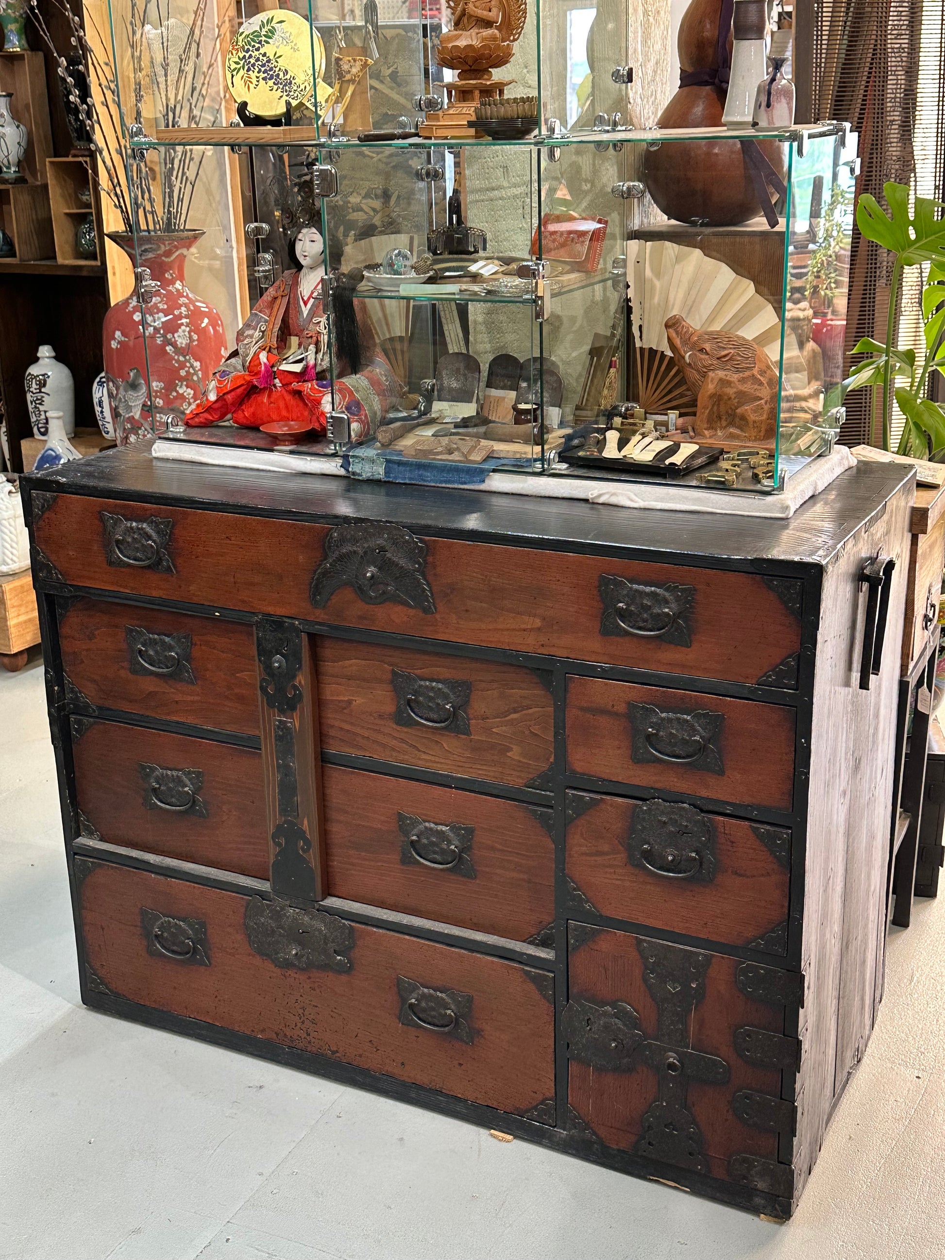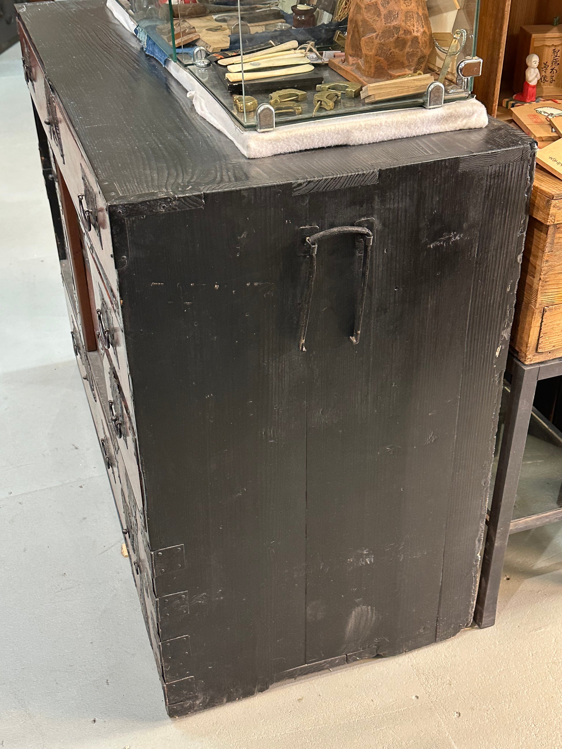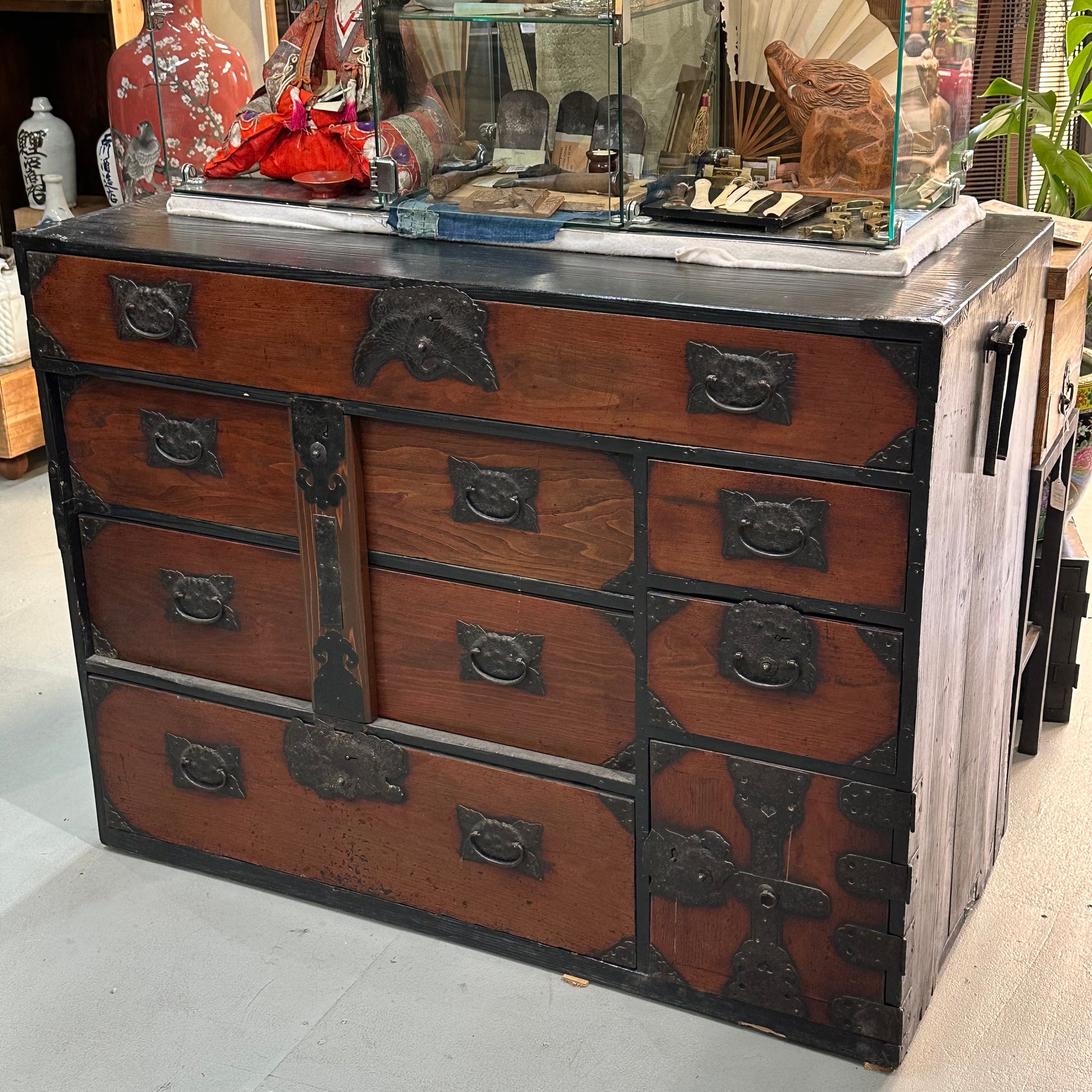 This tansu chest is made with pegged-tenon open-mortise corner box joint construction. IT has all its 150 year old deep rich patina. All drawers and doors move easily without binding. All hardware is hand forged iron with Gumpai style handles and detailed lock plates. Some locks are still operable with included keys. Forged iron side handles aid in transporting this chest even when fully loaded with possessions.