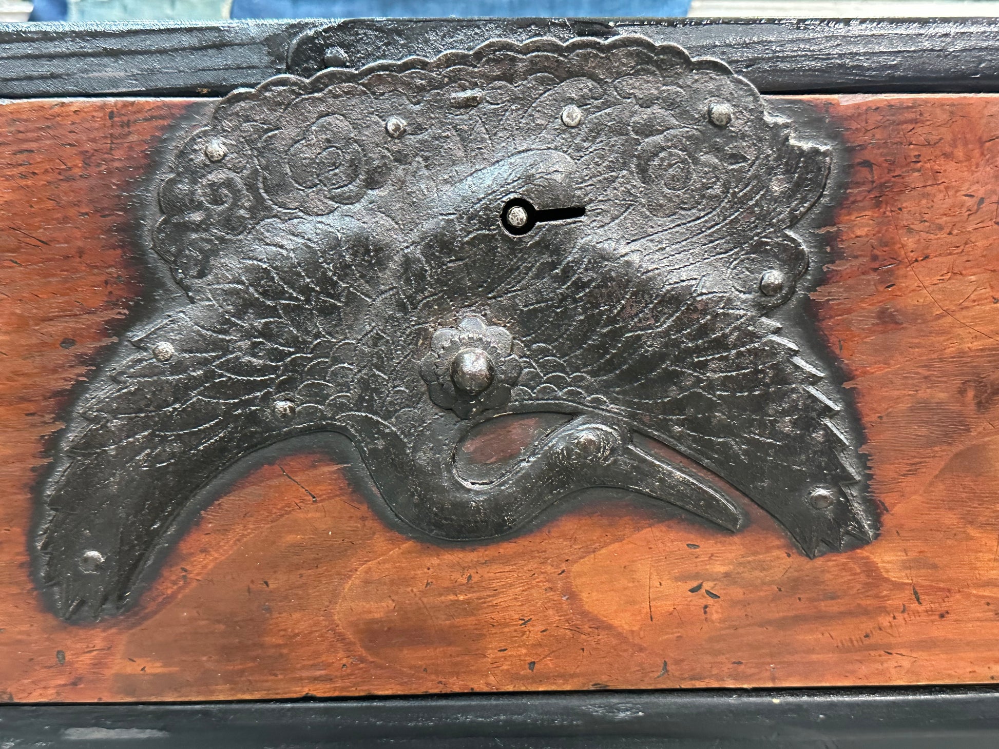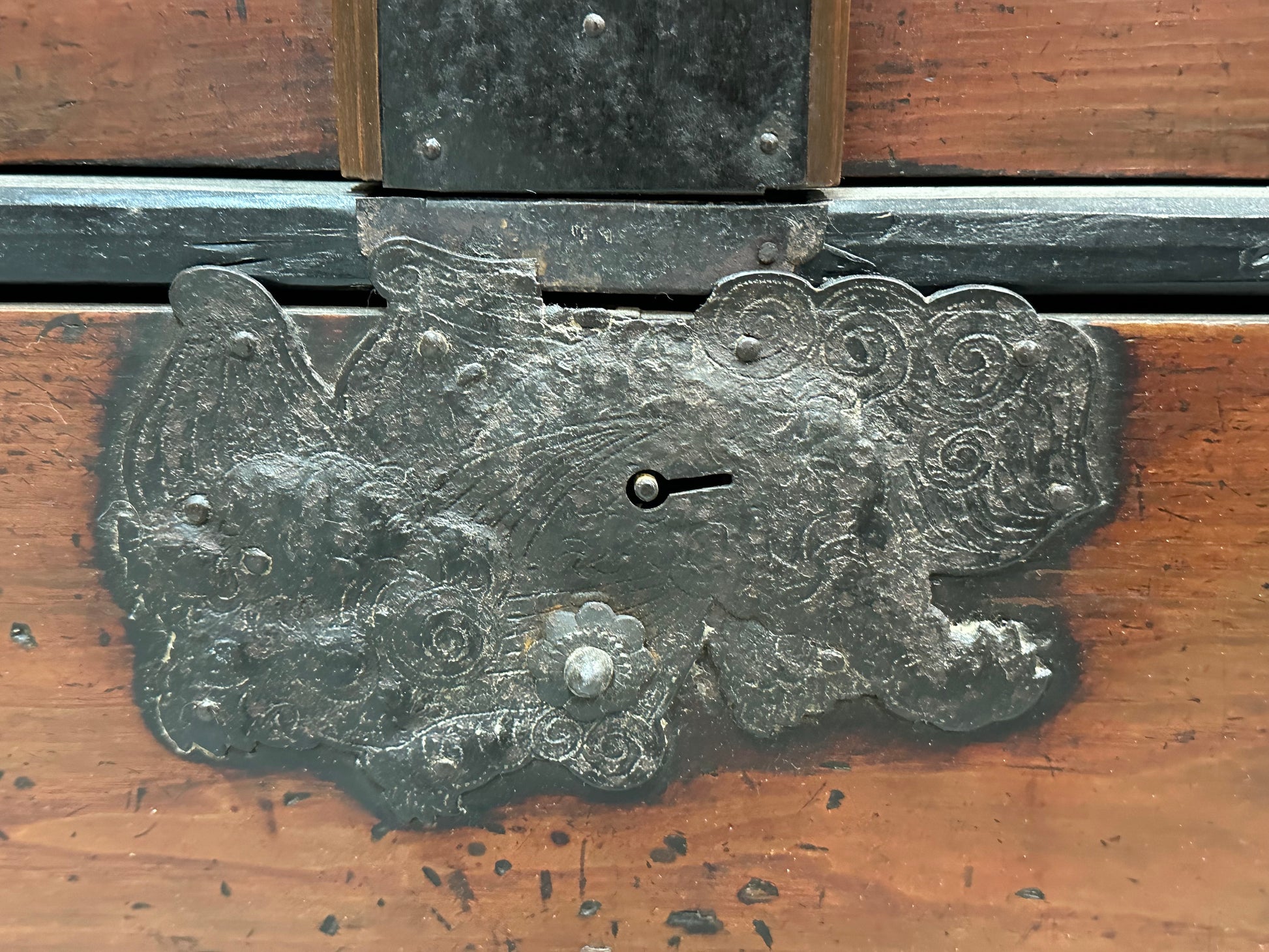 This chest has a century and a half old original warm aged patina and, having been used lovingly for over a century, it remains in fine original antique condition and should serve for another century of use. There are some areas of past stains and distress marks as expected from a genuine antique. The Bo (drawer bar) does not appear to be original. A great piece of Japanese history and an interesting and very solid and functional piece of furniture.