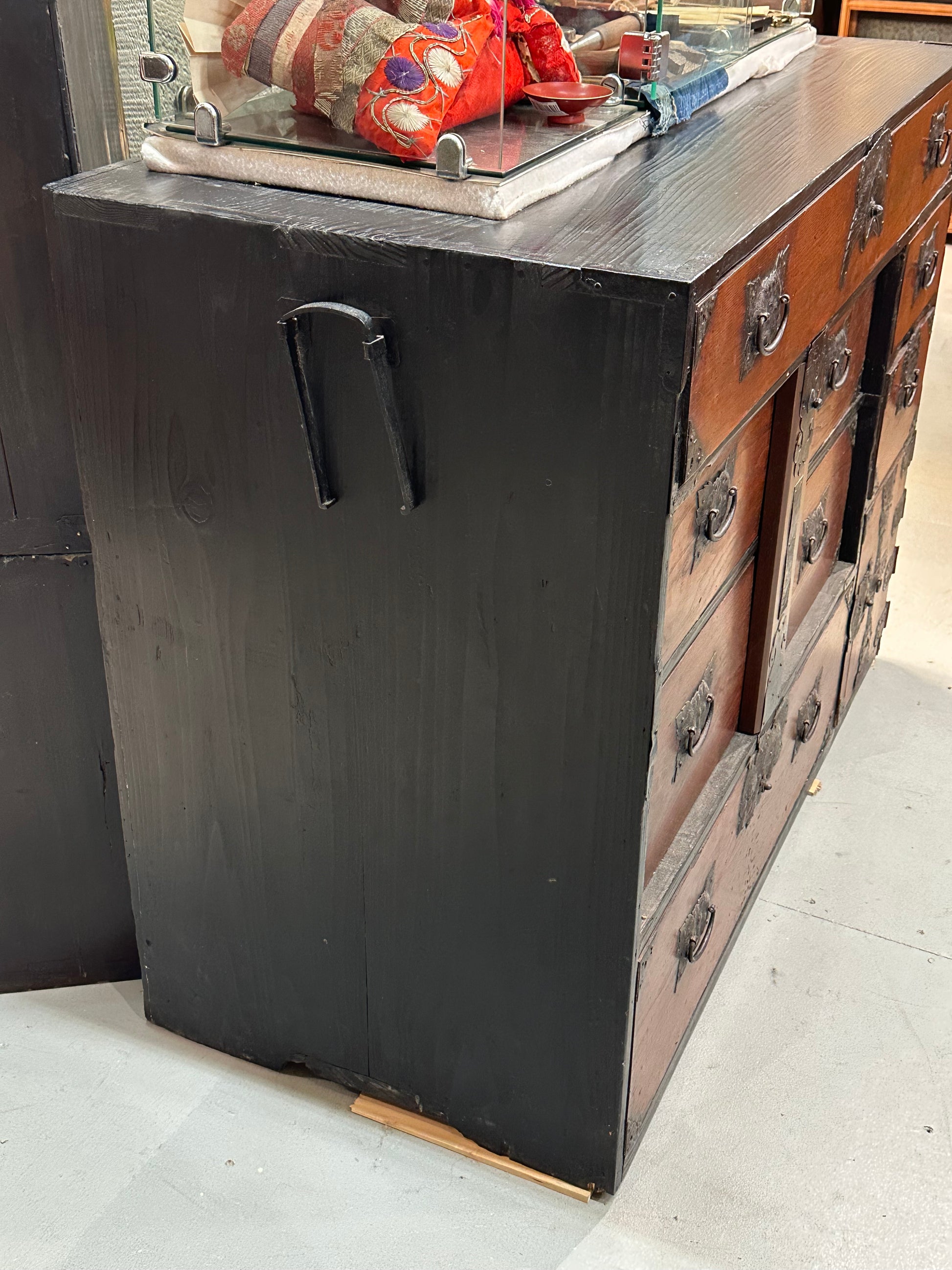 This is an Antique Japanese Kimono chest or Ishodansu with original black and red lacquer finish. This chest was made in the mid Meiji era (c.1880's) of sugi (cryptomeria) case and interiors. Ishodansu were used to store precious kimono, obi and accessories.