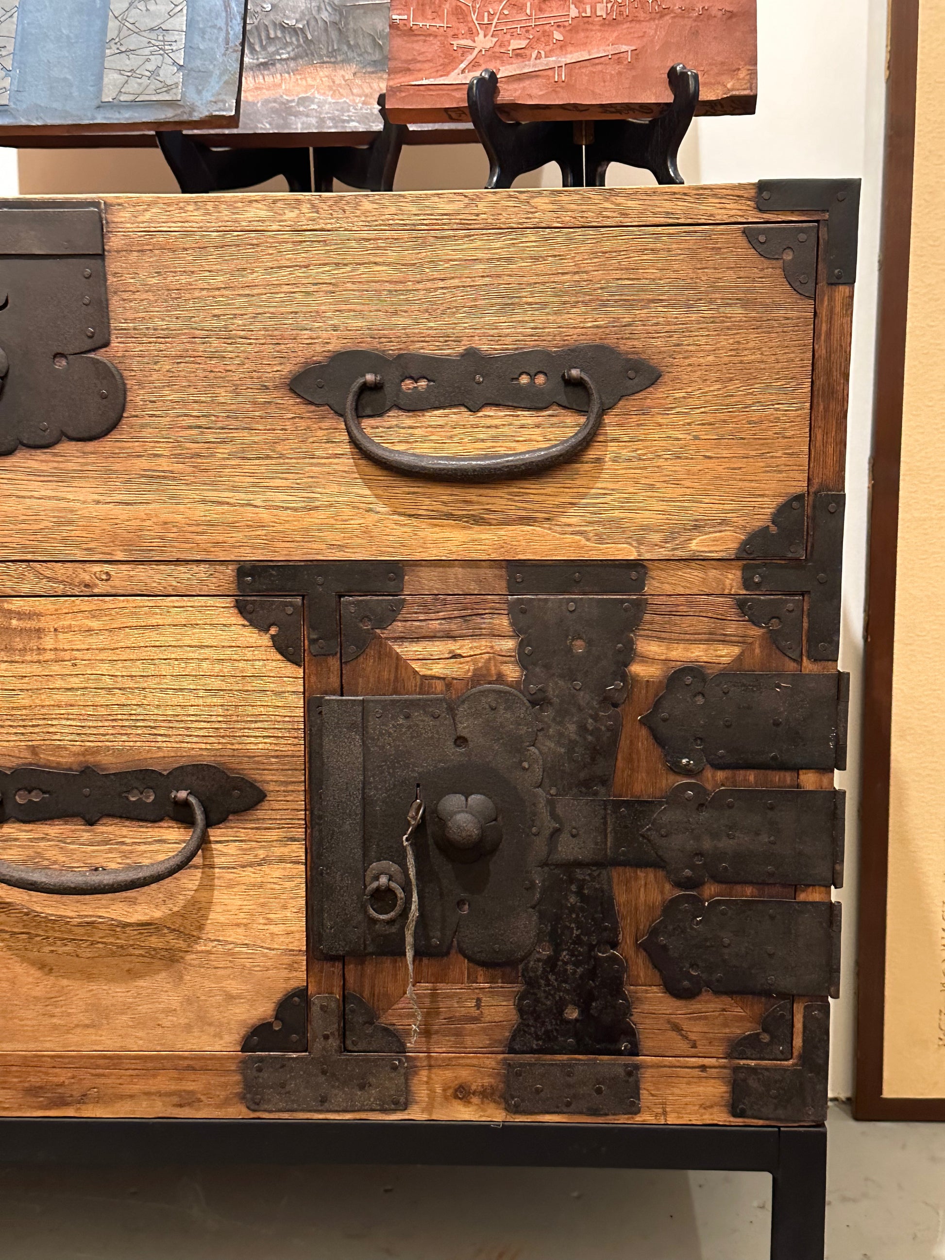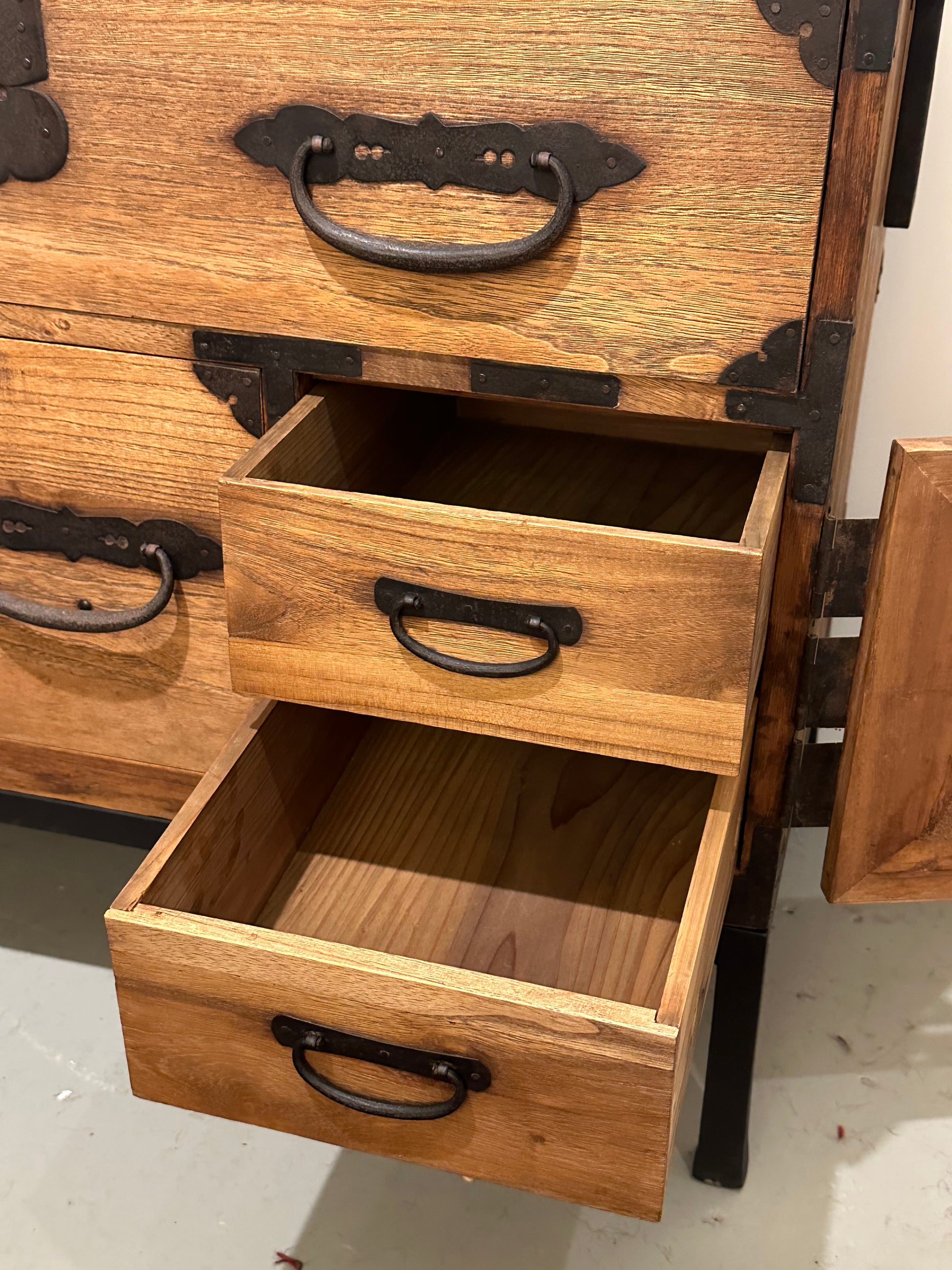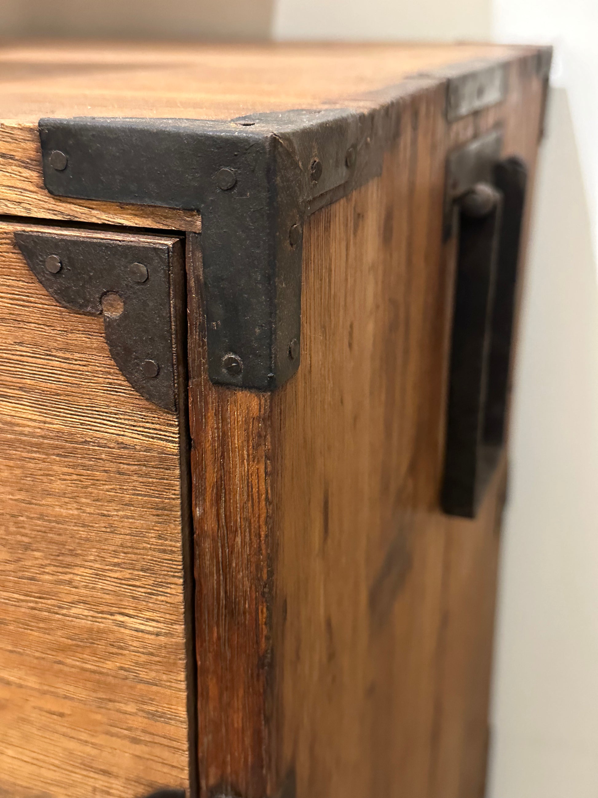 This tansu is made with pegged-tenon open-mortise corner box joint construction. It has all its 150 year old deep rich patina. All drawers move easily without binding. All hardware is hand forged iron with Gumpai style handles and detailed lock plates. All locks are still operable with an included key. Forged iron side handles aid in transporting this chest even when fully loaded with possessions.