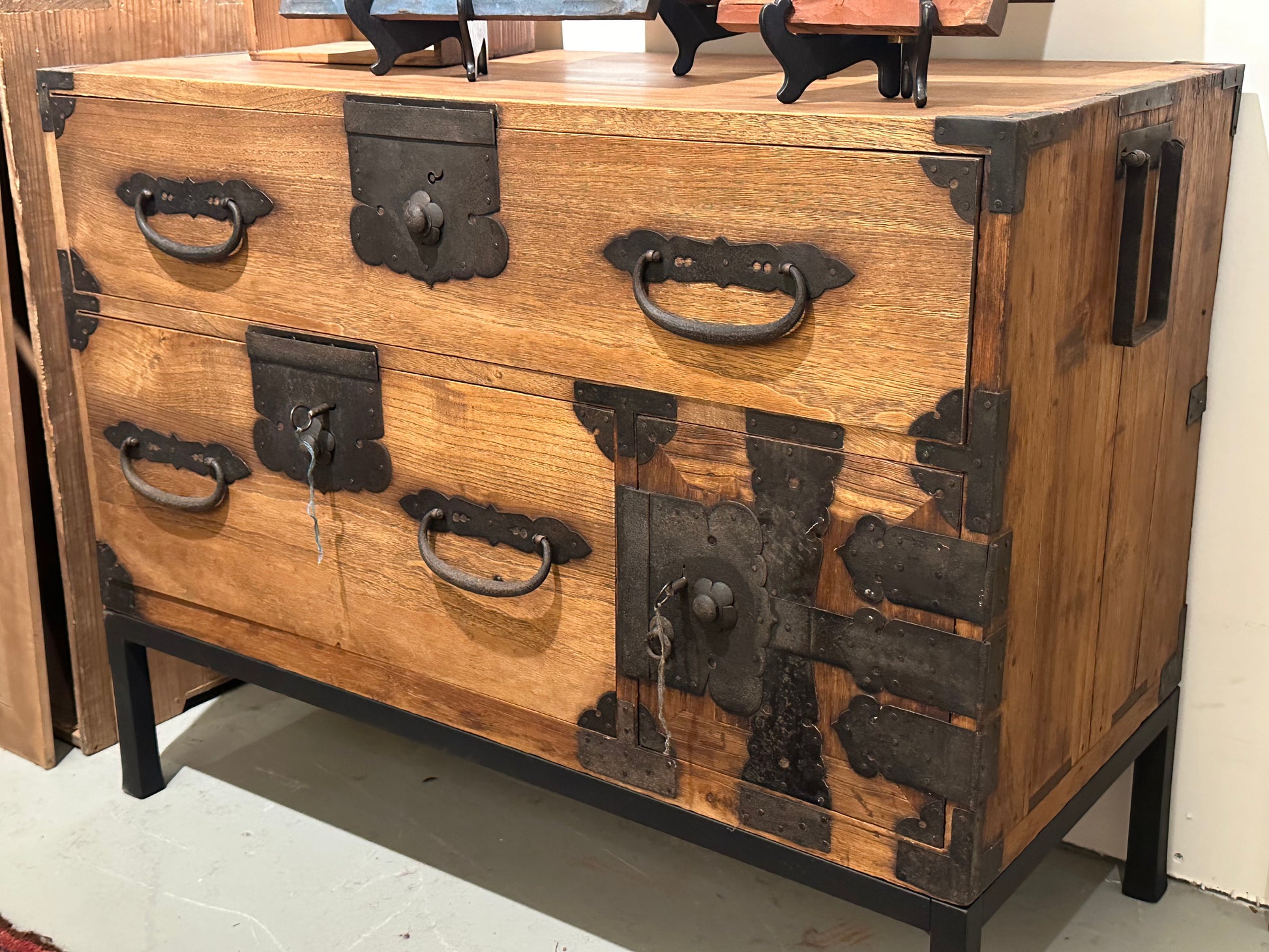 This is an Antique Japanese kimono chest or Ishodansu. This chest was made in the mid Meiji era (c.1870's) of all kiri wood (paulownia). Ishodansu were used to store precious kimono, obi and accessories. This two drawer tansu includes a custom made solid iron stand. The bottom drawer has about 10" of vertical clearance and the top drawer has 6".