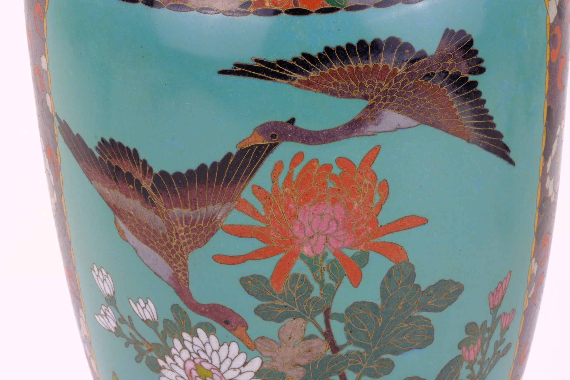 This is a beautiful Japanese Meiji era (c. 1870-90's) ornate cloisonné vase. The hand crafted decorations are of geese in flight over various flowers on a blue-green background.