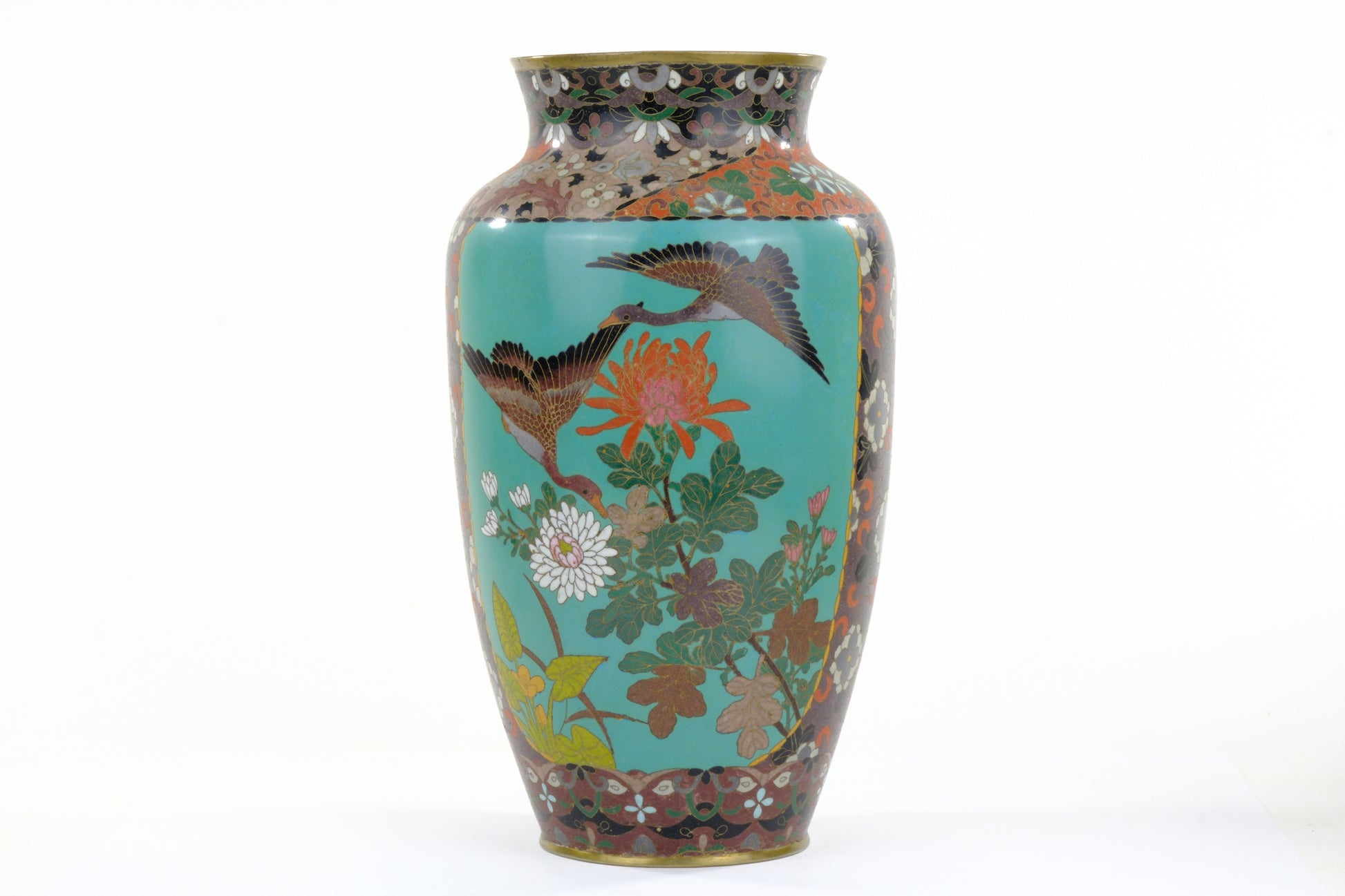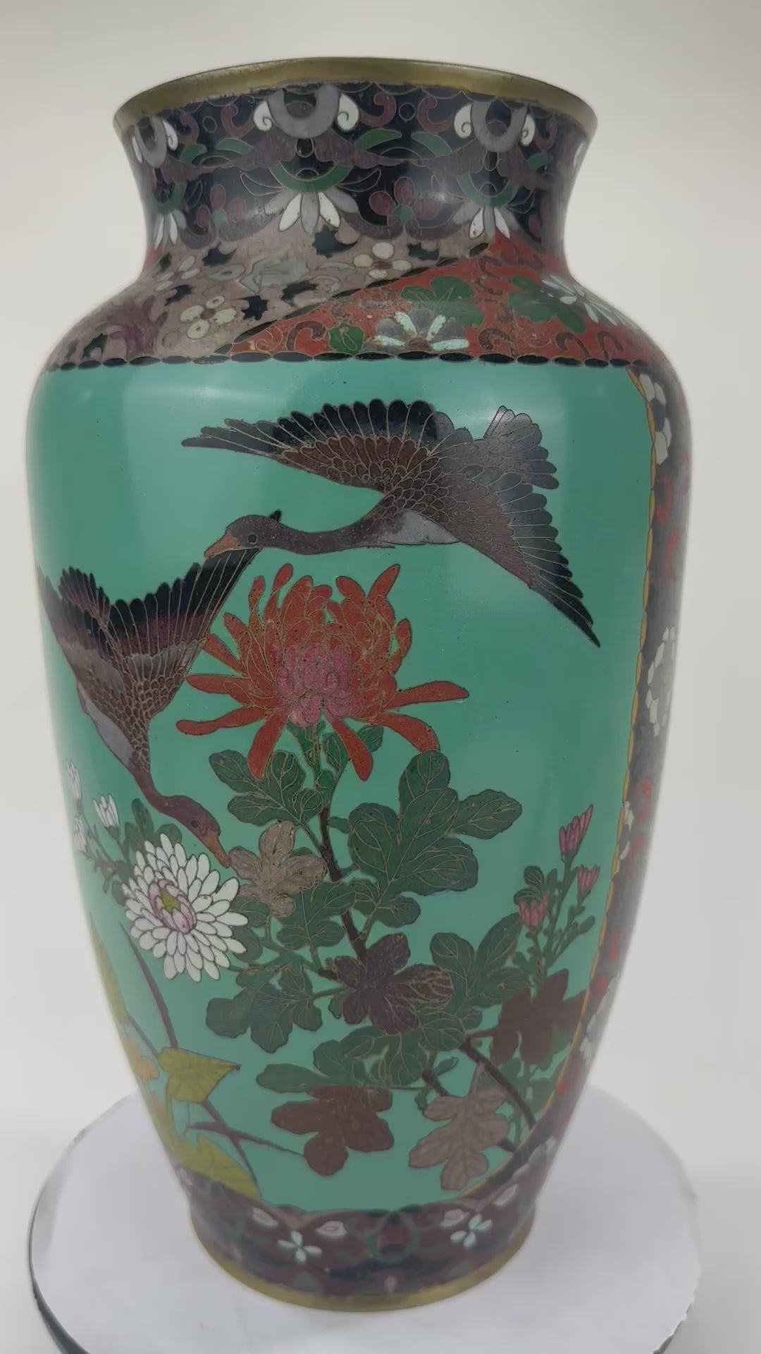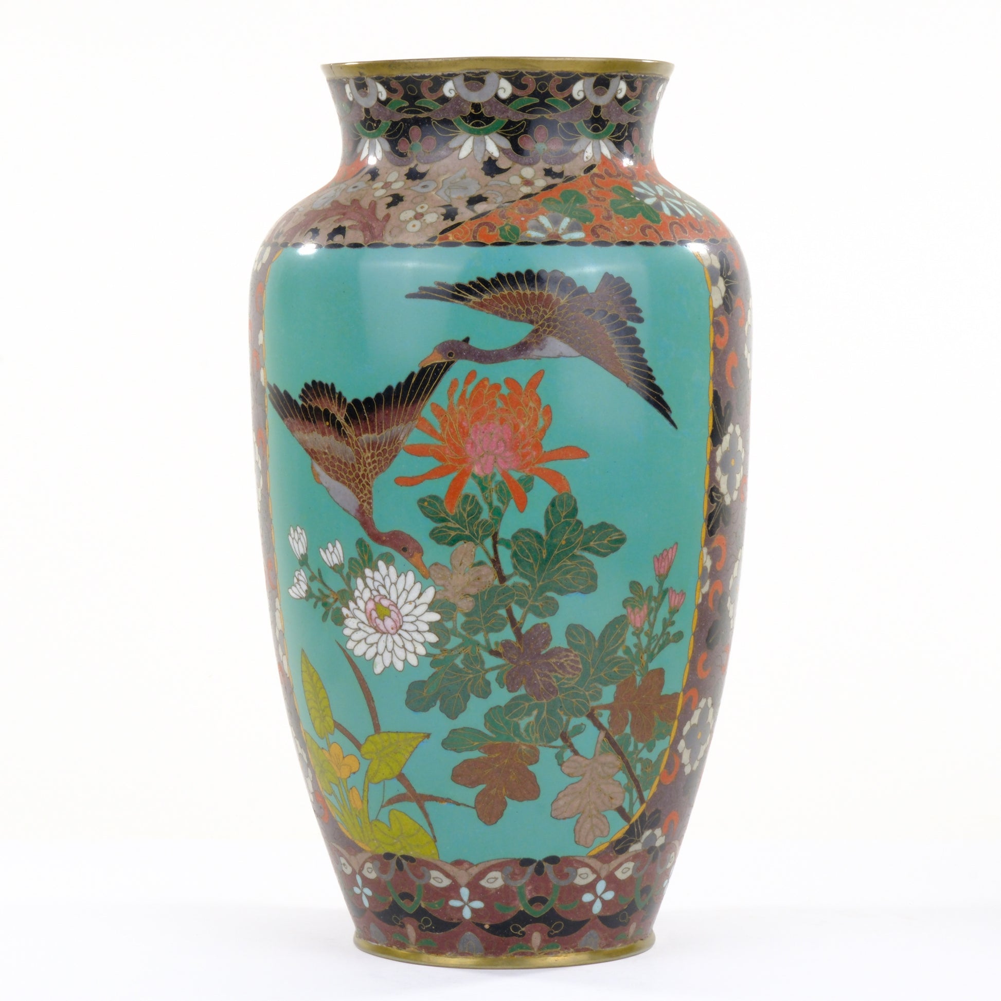 Antique Japanese Meiji Era (c1880) Cloisonné Vase Geese in Flight & Flowers 12”