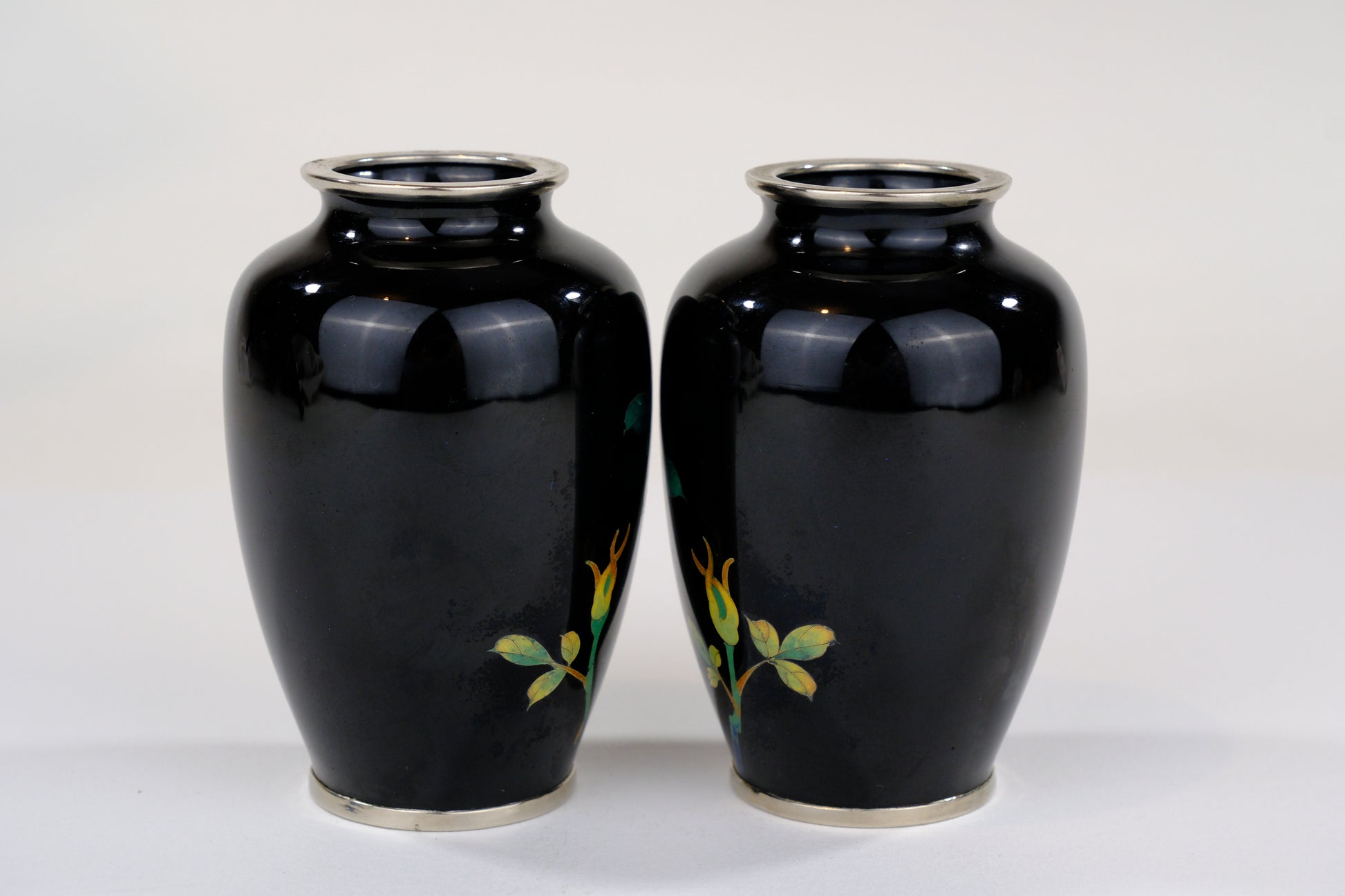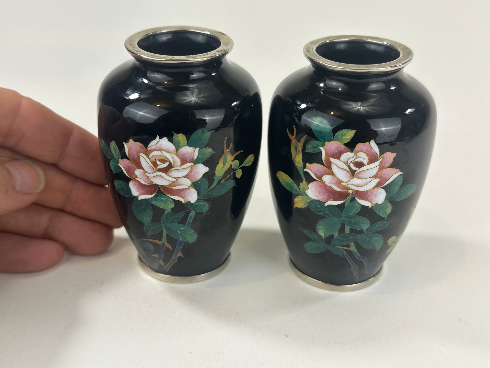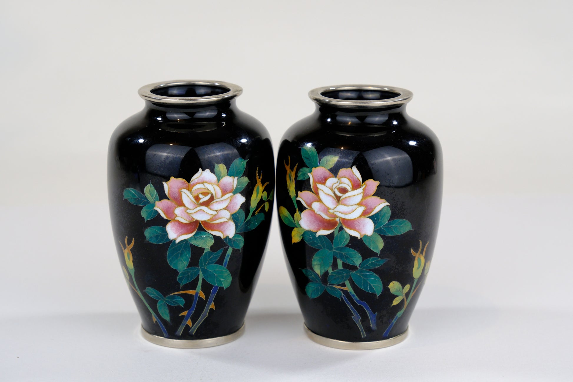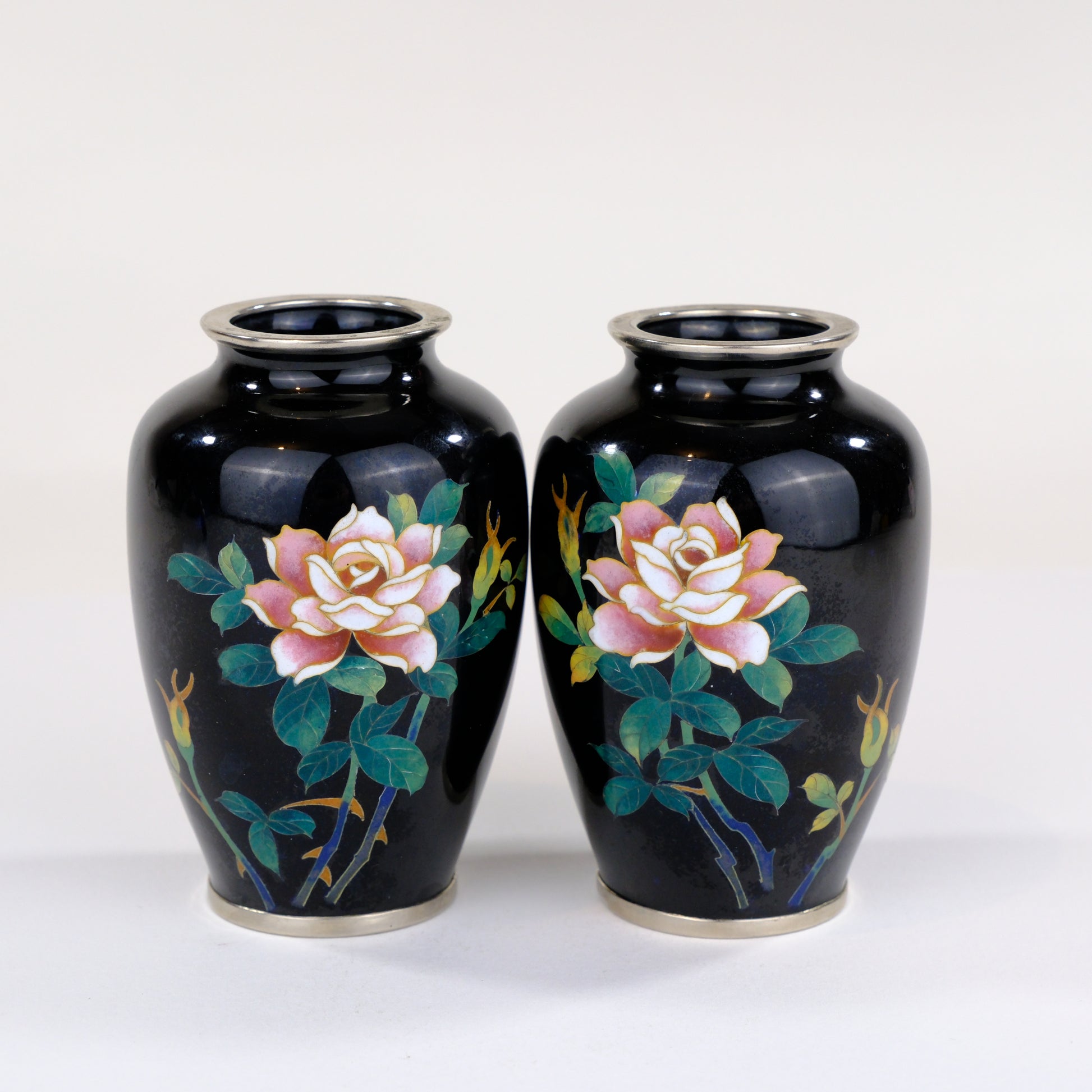 Antique Japanese Meiji Era (c1880) Cloisonné Vases x2 PAIR Pink Roses Black 3.5”