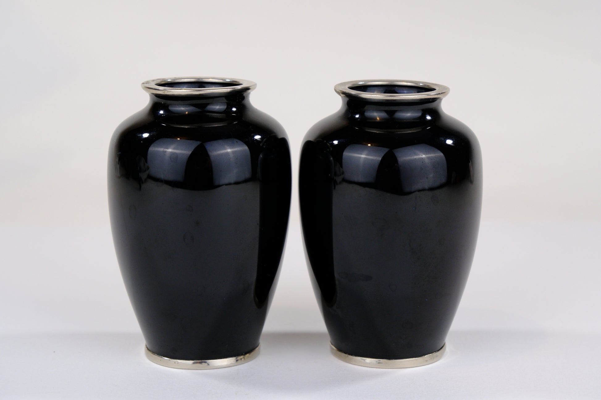 This is a beautiful pair of Japanese Meiji era (c. 1870-90's) ornate cloisonné vases. The hand crafted decorations are of a rose on a jet black background. This is a perfect example of Meiji era Japanese cloisonné. This is one of over 100 beautiful pieces of this exquisite Japanese art currently being offered by Shogun's Gallery.