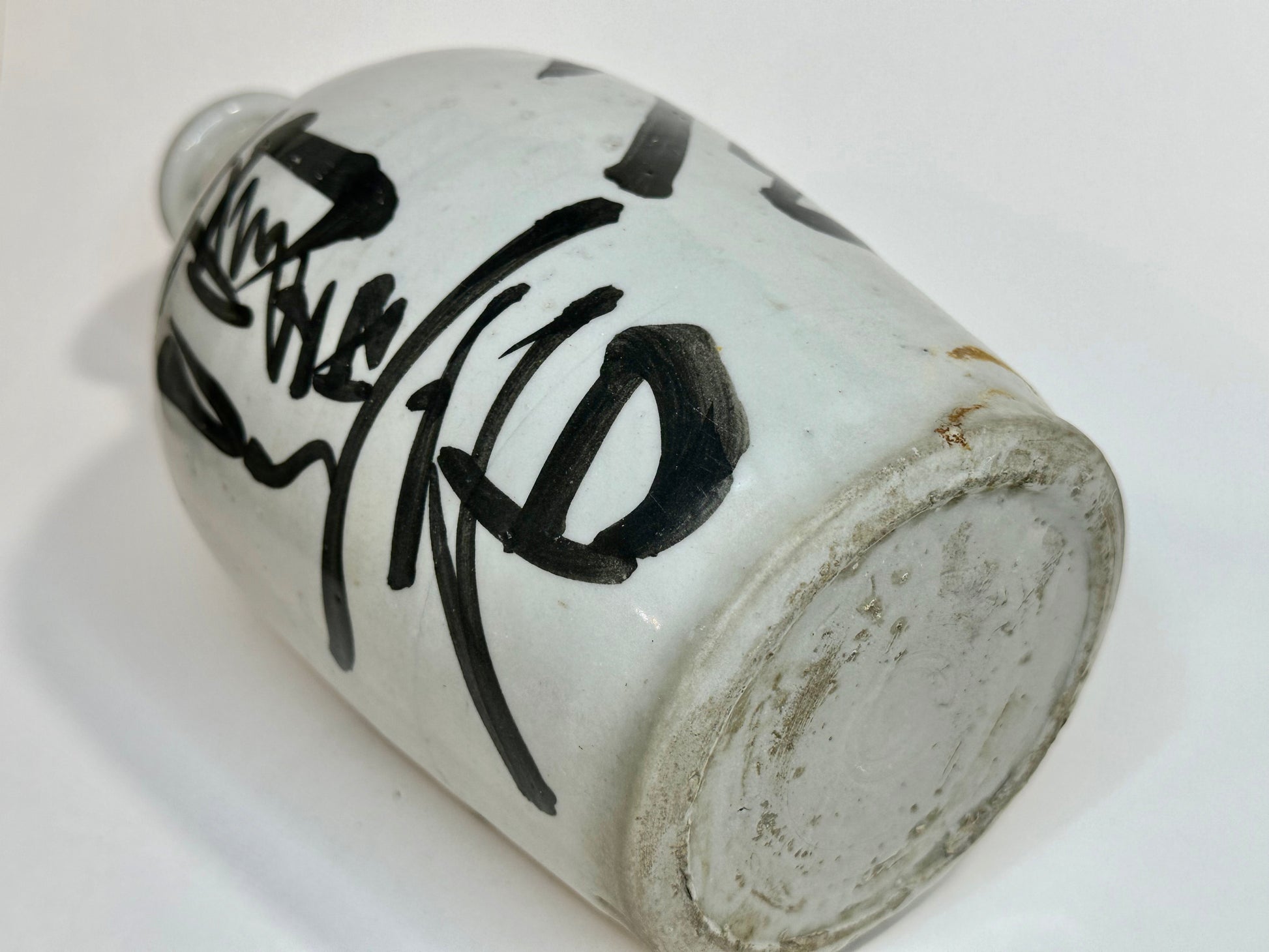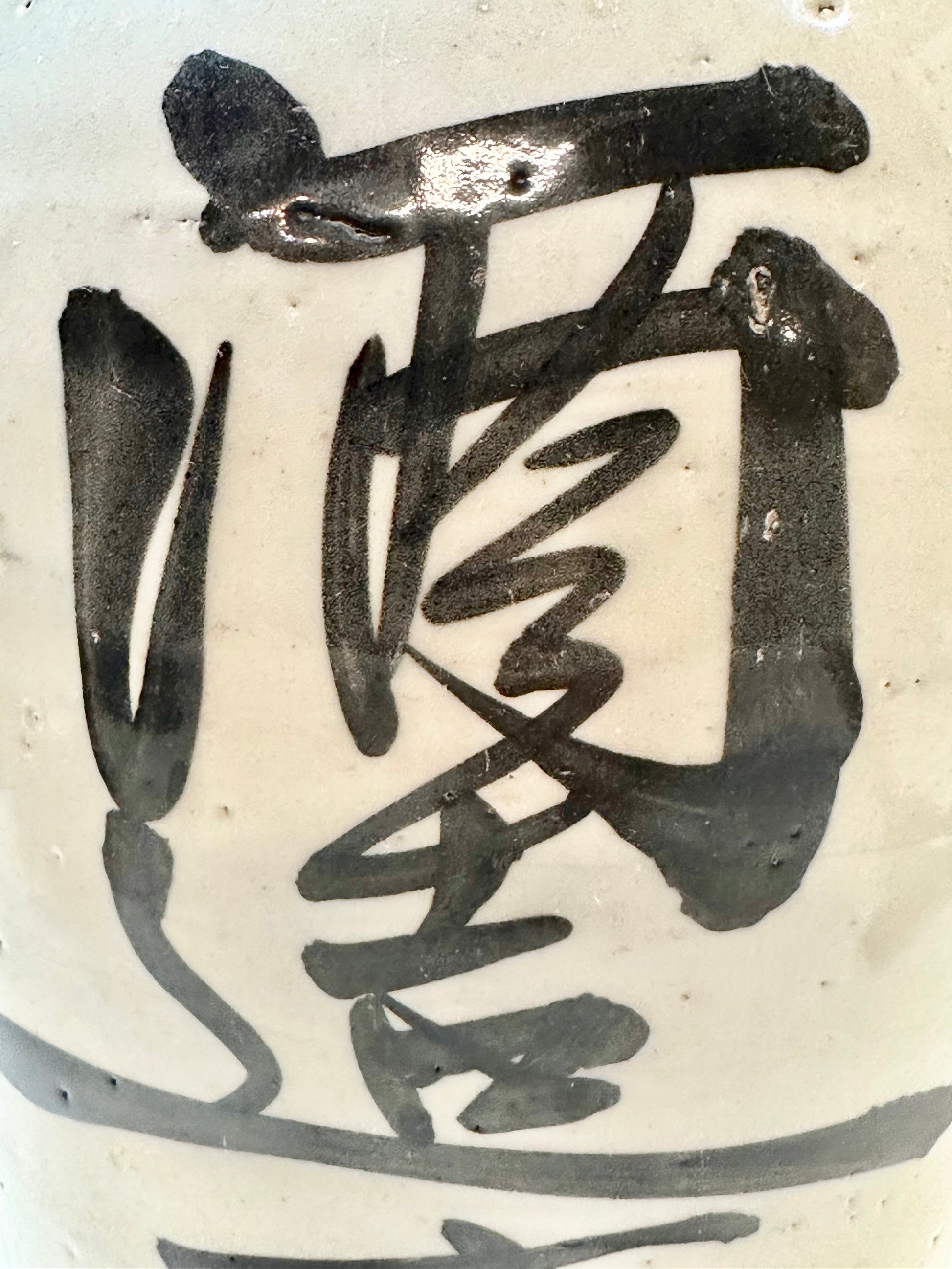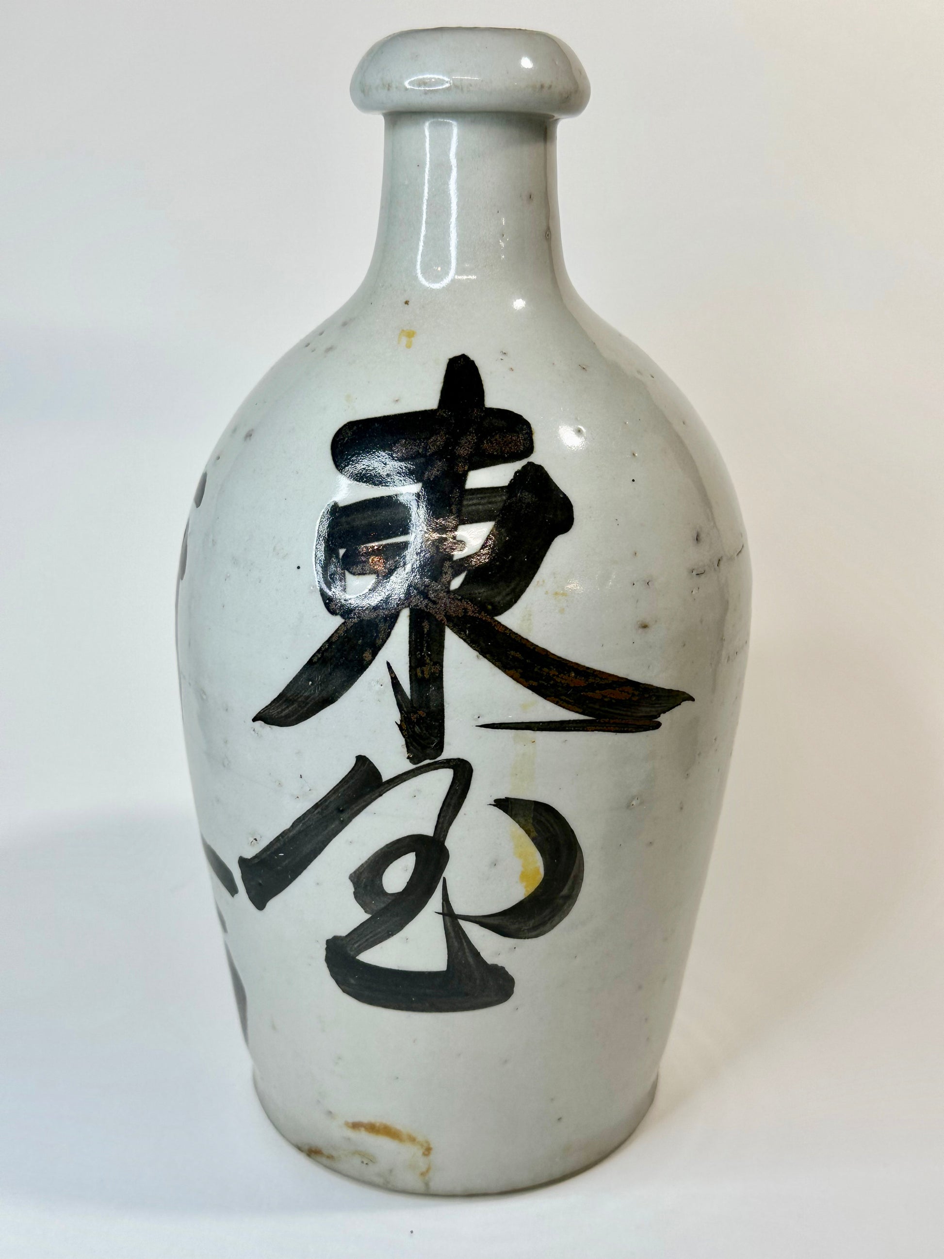 Thrown by hand on the potter’s wheel, these jugs were high-fired stoneware or earthenware, coated in a durable shiro glaze (white slip or feldspathic glaze) and often boldly brushed with calligraphic characters denoting the brewer’s mark, establishment name, or the sake brand. The iron-oxide brushwork—frequently applied with swift, expressive movements—reflects both functional labeling and aesthetic tradition, evoking Japan’s enduring wabi-sabi sensibility.