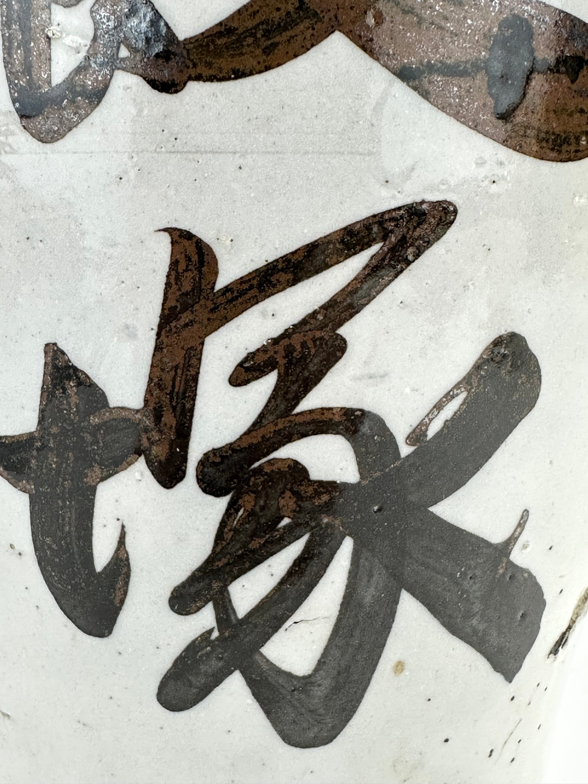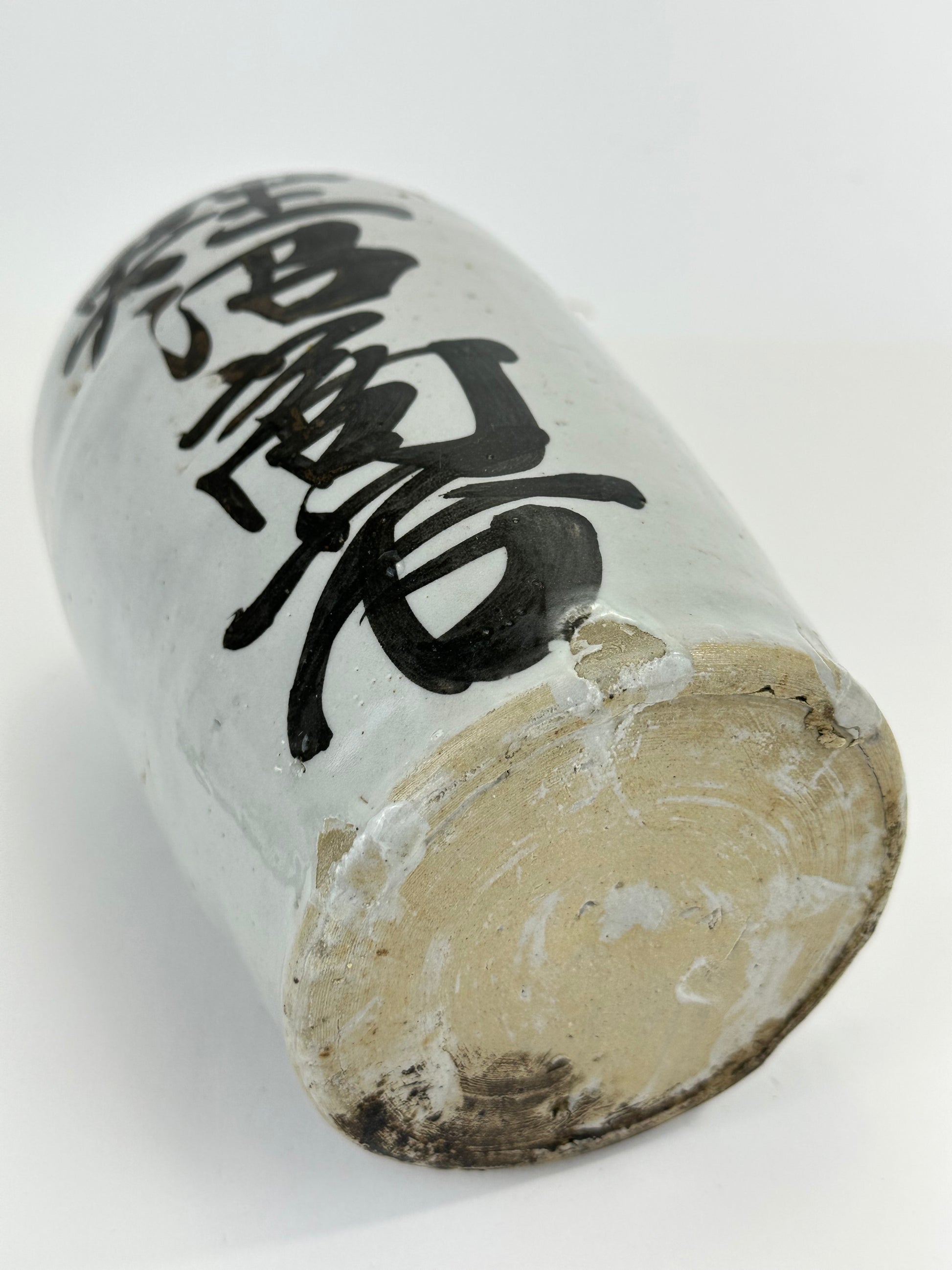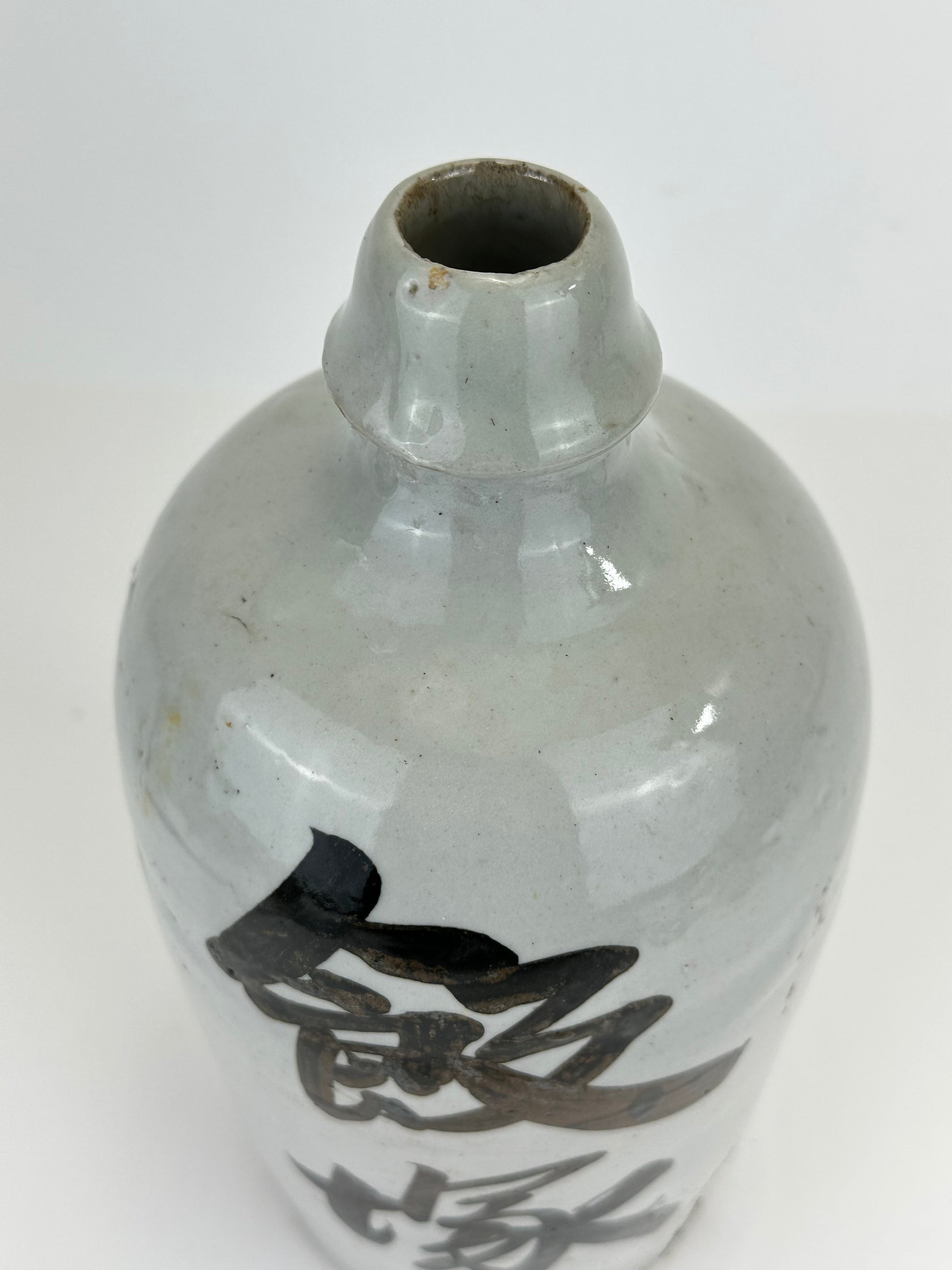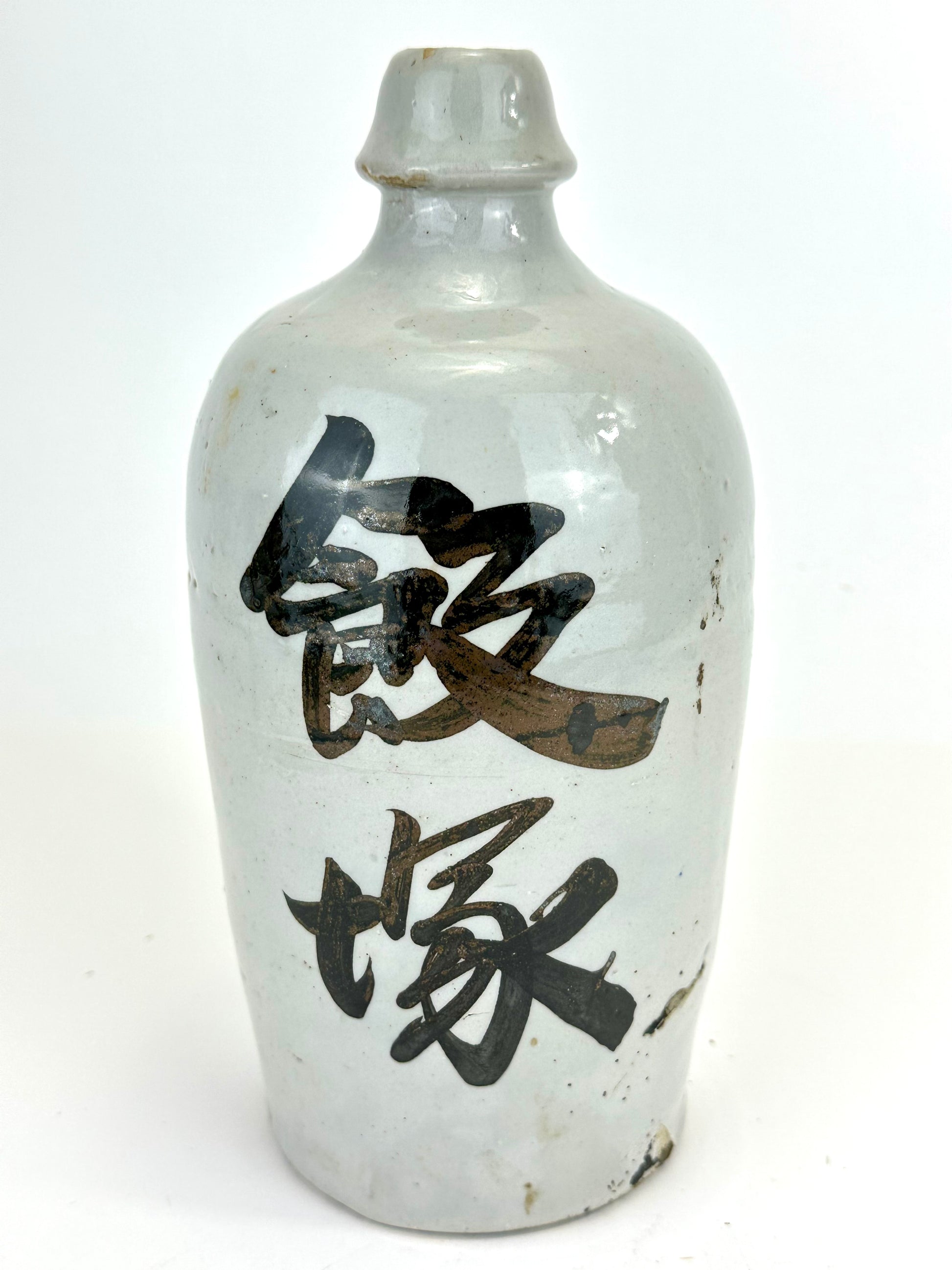 Thrown by hand on the potter’s wheel, these jugs were high-fired stoneware or earthenware, coated in a durable shiro glaze (white slip or feldspathic glaze) and often boldly brushed with calligraphic characters denoting the brewer’s mark, establishment name, or the sake brand. The iron-oxide brushwork—frequently applied with swift, expressive movements—reflects both functional labeling and aesthetic tradition, evoking Japan’s enduring wabi-sabi sensibility.