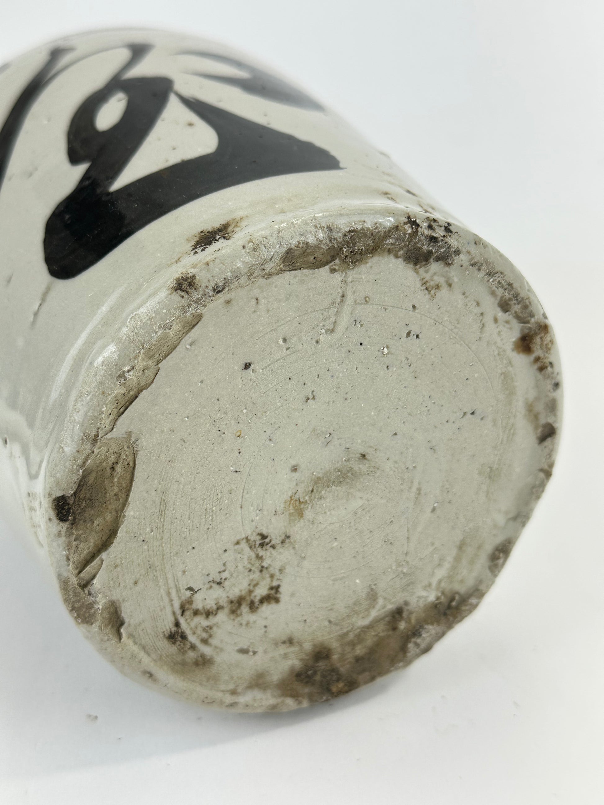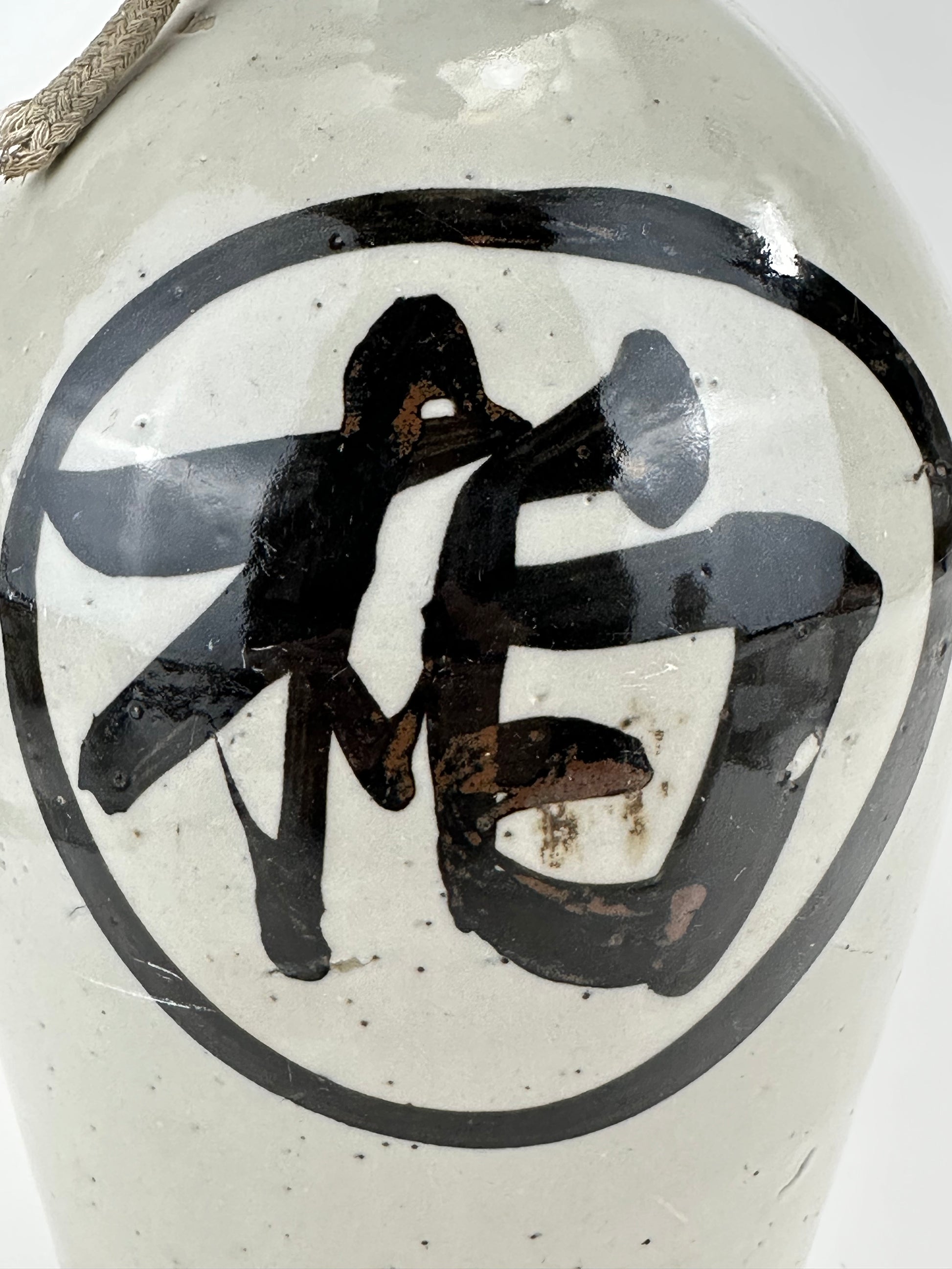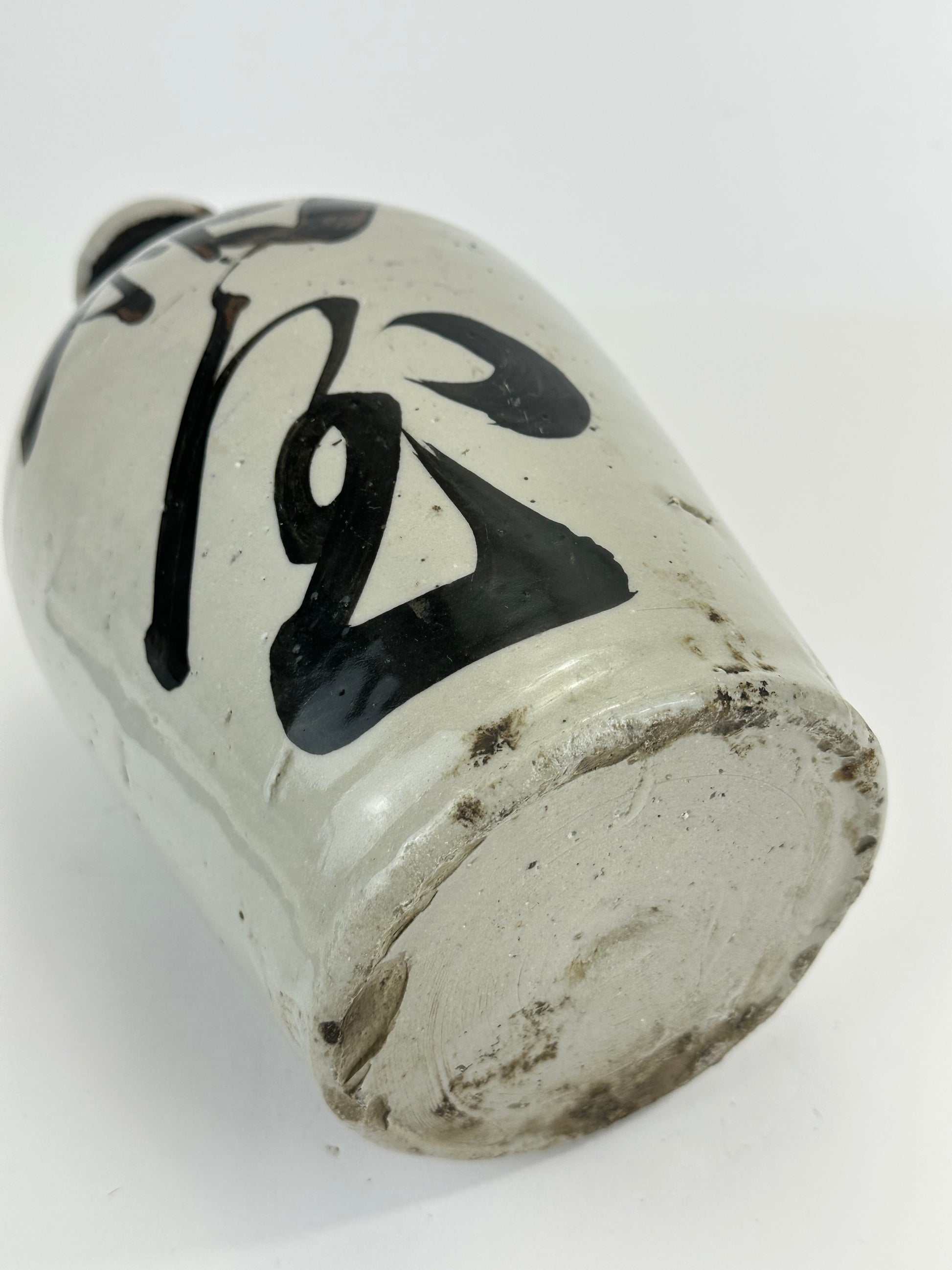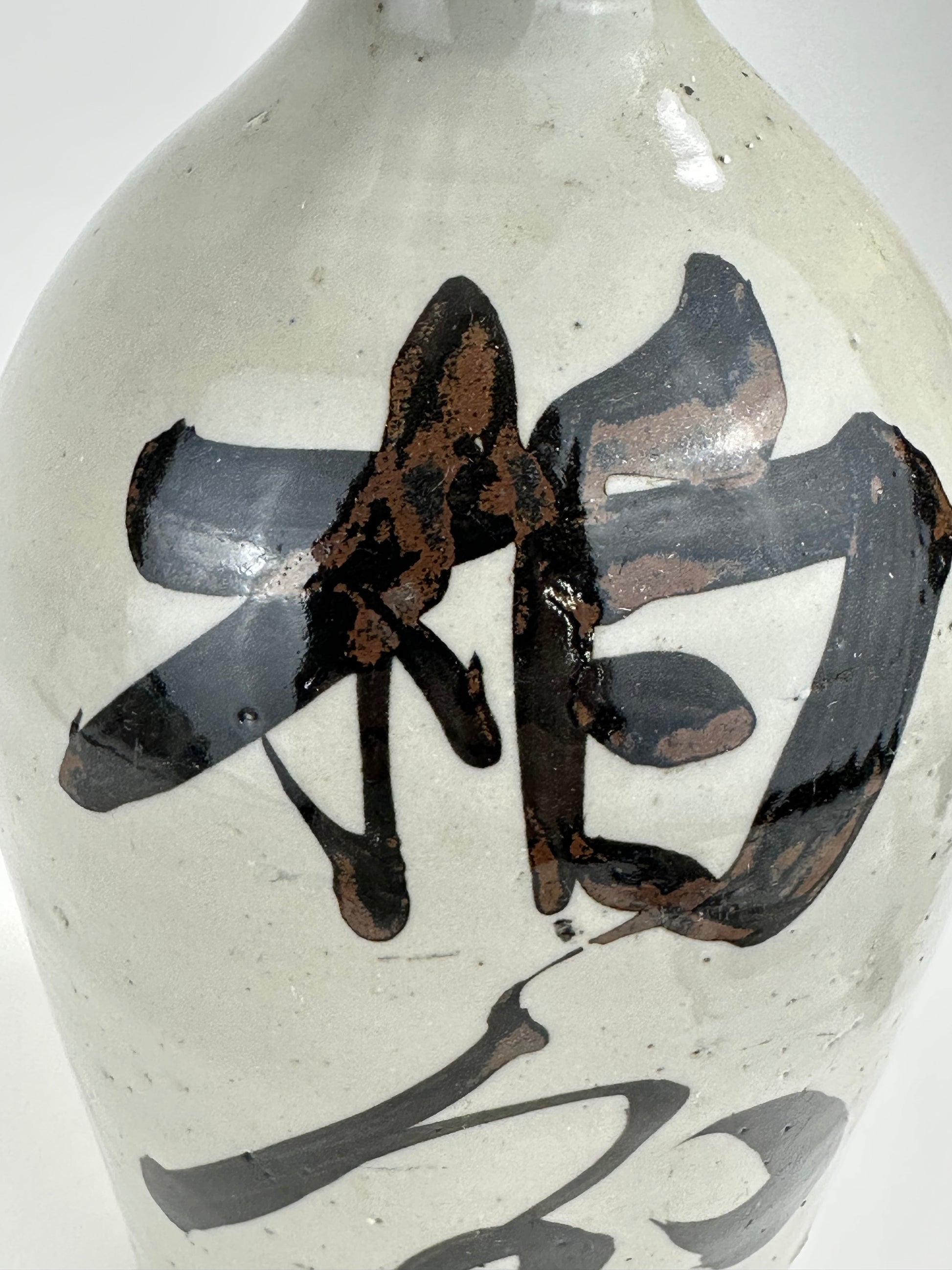 Thrown by hand on the potter’s wheel, these jugs were high-fired stoneware or earthenware, coated in a durable shiro glaze (white slip or feldspathic glaze) and often boldly brushed with calligraphic characters denoting the brewer’s mark, establishment name, or the sake brand. The iron-oxide brushwork—frequently applied with swift, expressive movements—reflects both functional labeling and aesthetic tradition, evoking Japan’s enduring wabi-sabi sensibility.